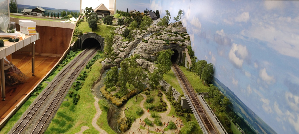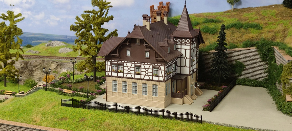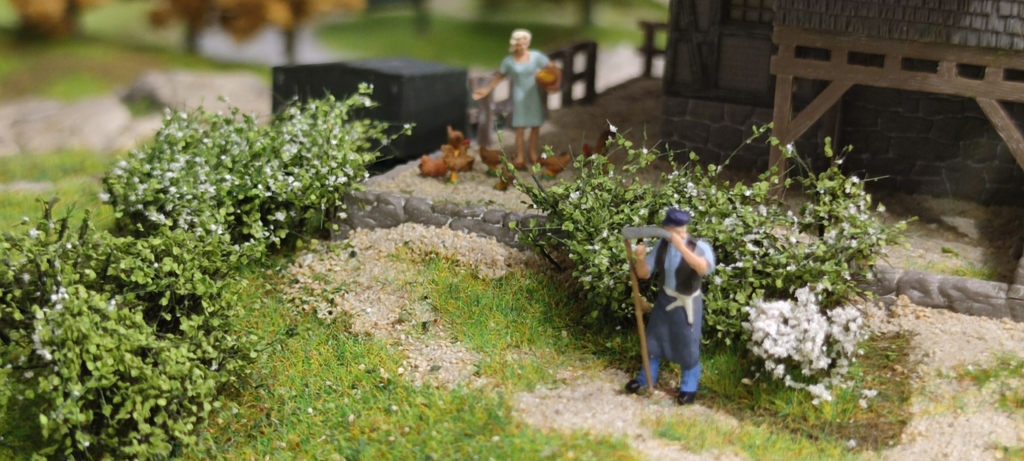И вот на днях я таки созрел. Повыдергивал все пластиковые ёлочки, пропылесосил (все-таки за 10 лет пыли накопилось...) и посадил "ёршики" от Heki, добавил несколько хвойных от Bachman и разных кустиков. Я их сначала планировал на гору возле санатория, но когда попробовал, совсем не понравилось (я об этом писал в прошлом году). А здесь они на мой взгляд как раз подошли. "Ёршиков" было больше, чем старых ёлочек, поэтому лес стал немного гуще.