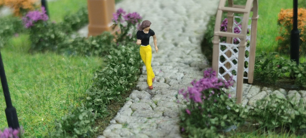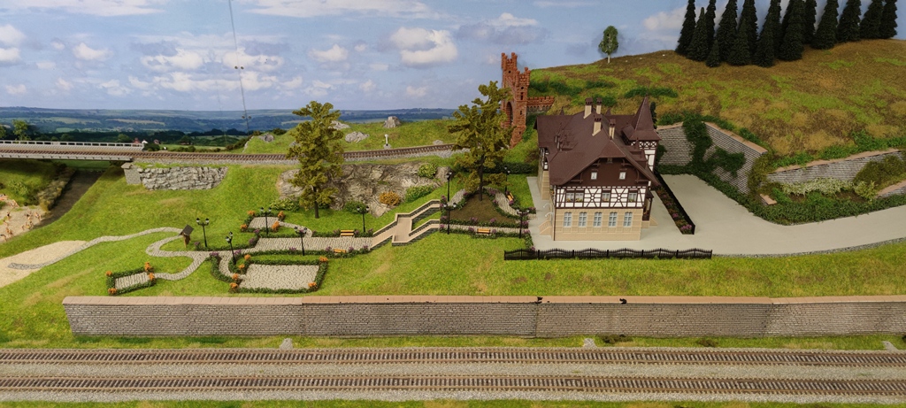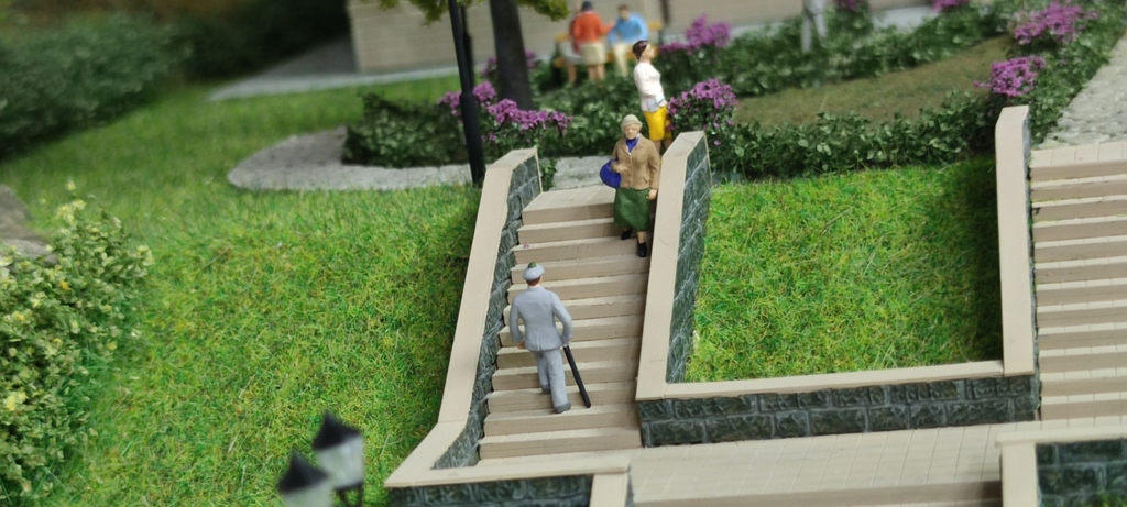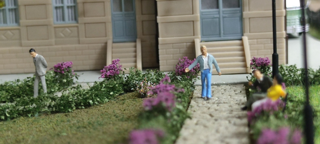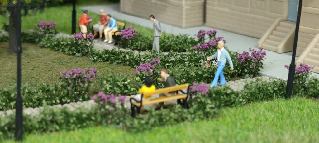 Начал делать парк возле санатория. Пока что готовы дорожки и кусты вдоль дорожек. Фонари просто вставлены в отверстия, не приклеены, поэтому некоторые стоят не совсем вертикально. Деревья пока поставил из того, что было. По замыслу тут должны быть старые широкие разлапистые дубы. Но их еще нужно сделать...