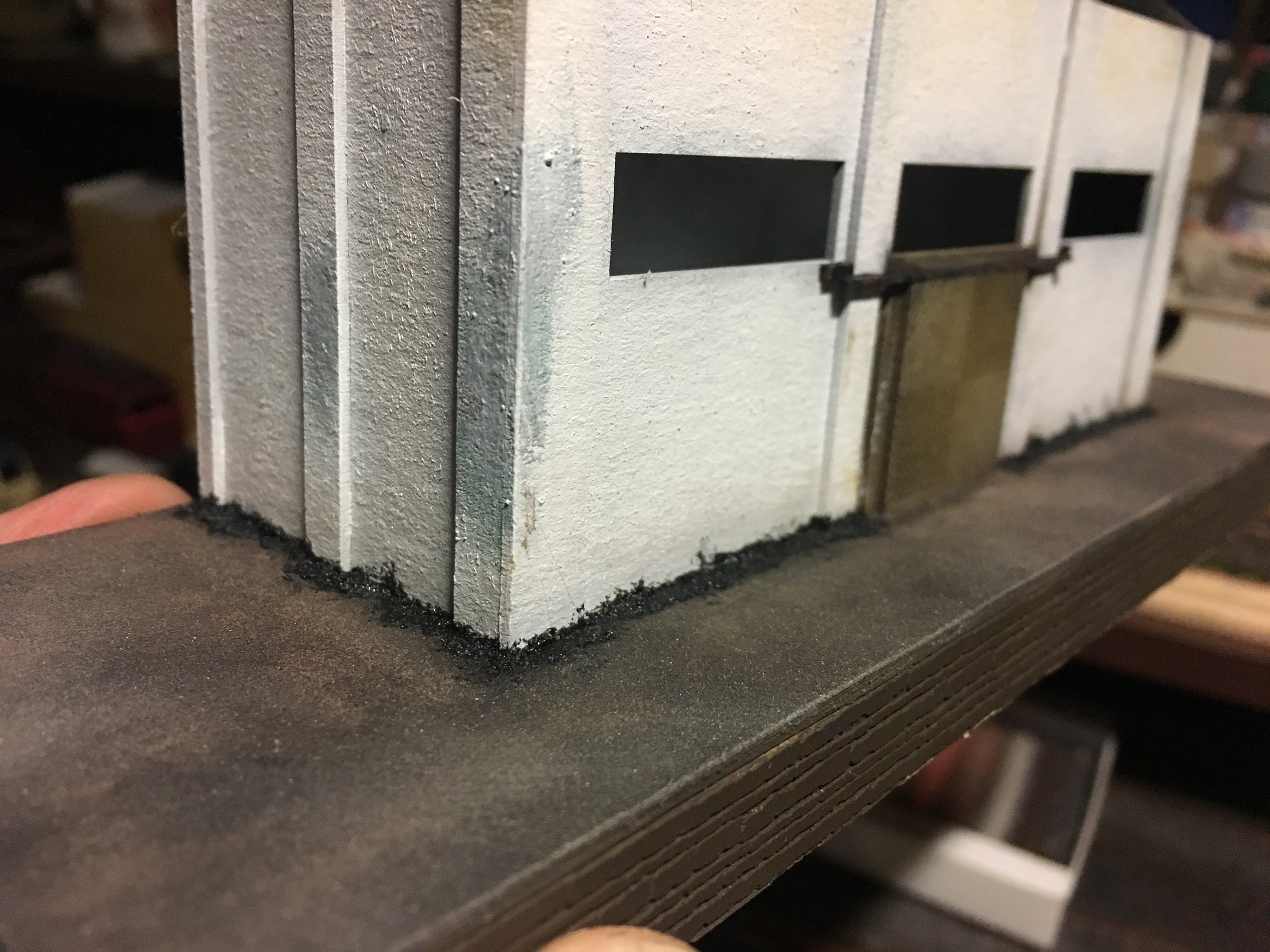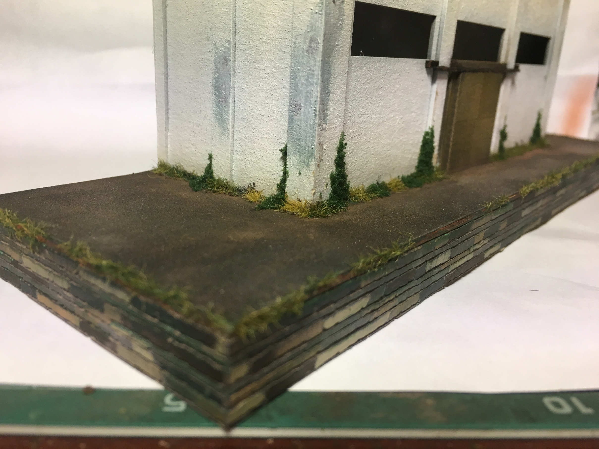 С покраской здания вроде бы всё ясно. Покрытие под асфальт, сделал из наждачной бумаги 220. Далее нанёс специальную замазку на стыке нождачки и стен. Попытался имитировать землю и пыль, которая всегда собирается в таких местах. Далее покрасил фундамент в разные тона камней. Затем пигменты из пастельных мелков и далее сухая кисть. Потом смывками прошёлся. И в тоге имеем, что имеем. Далее трава и мох. Помимо стыков стен с асфальтом, траву нанёс на края платформы. Она там частенько присутствует. Учитывая, что по краю металлический уголок идёт всегда, чтоб удерживать асфальтовое покрытие. Там она и растёт родимая. Потом мха накидал. В конце создалось ощущение, что местами перебрал с ним, но исправлять уже не буду наверное. Здание глубоко в нише стоит. Оно по сути второстепенное. Ещё вероятно, что частично будет закрыто вагоном и краном на путях перед ним. Ну и ниже фото процесса. На фотографиях поэтапный процесс, описанного выше. На крайней фото, на скорую руку, накидал всякого добра для "красного словца" так сказать. Критика, советы, как всегда приветствуются. Делайте поправку на то, что это моё первое здание в 1/87.