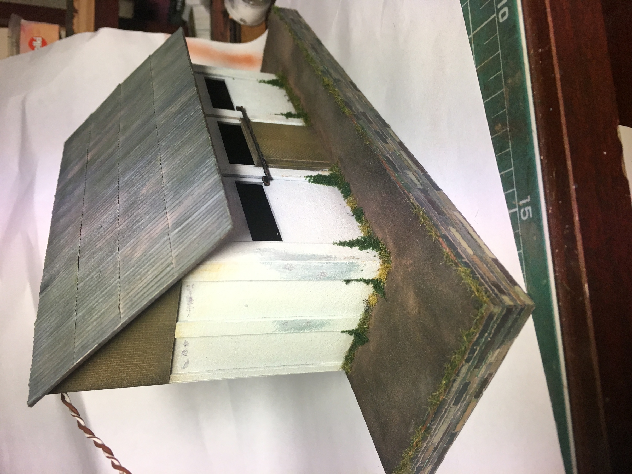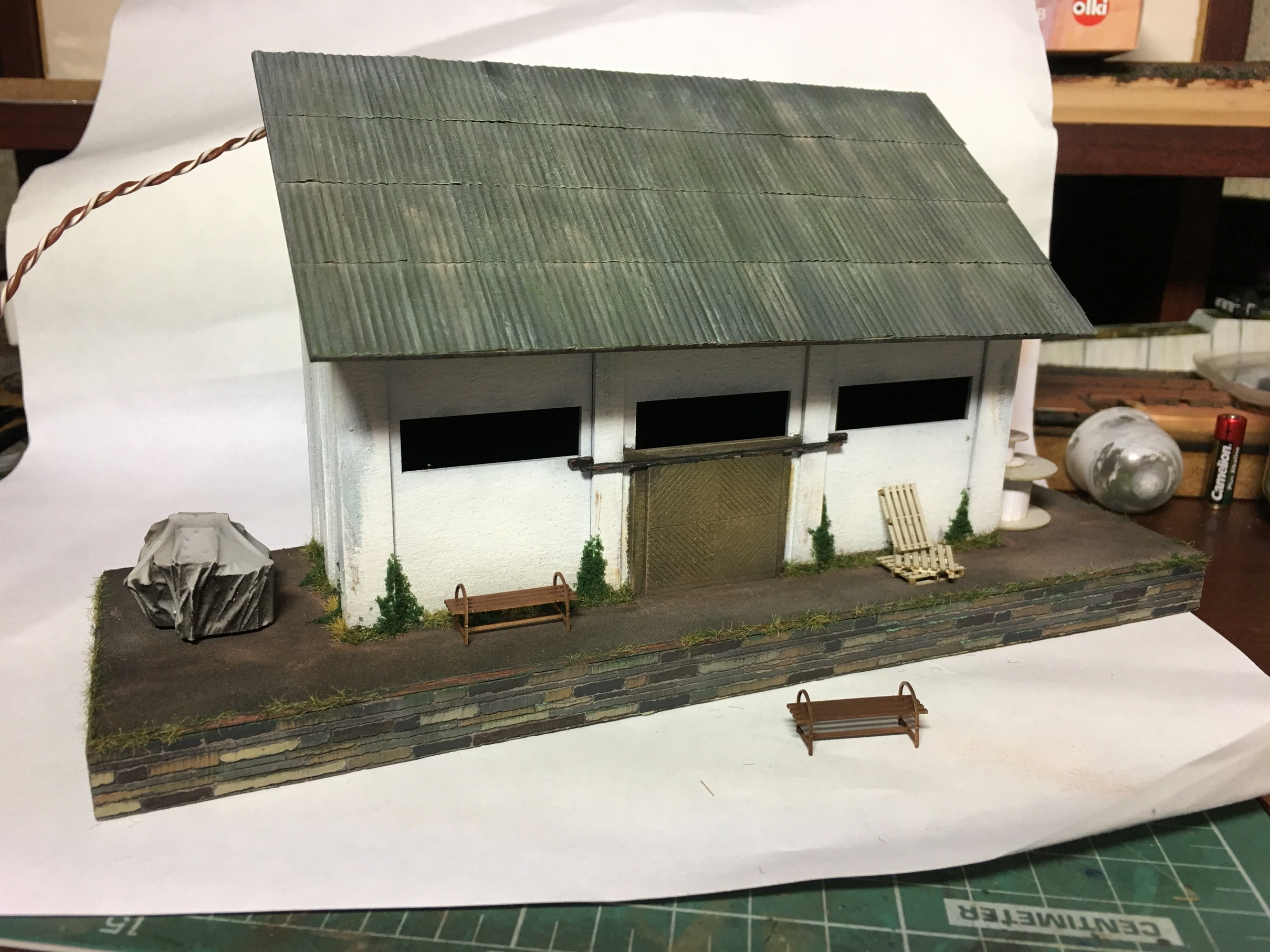 Пожарный щит, как и другие мелочи, ещё будут. Щит над лавочкой возможно будет. На оригинале, справа ещё труба вытяжки из стены, лестница приставная и так далее. До всего этого, руки пока не дошли. Так же не закончил декорирование. Ещё крышу отработать до конца. Возможно немного мха туда добавлю. Ещё пожухлая листва будет и так далее. Под рукой нет нужного фото. В оригинале, рядом нет деревьев. Но на фото с другим пакгаузом, есть дерево и часть листвы осыпалась на крышу пакгауза. Мне очень понравилось. Но проблема в том, что у меня планировался макет, больше на июль-август. То есть совсем немного желтой листвы, пожухлая от солнца трава местами. А там прям осень на фото. Но композиция очень интересная. Если не здесь реализую, то идею просто возьму на заметку.