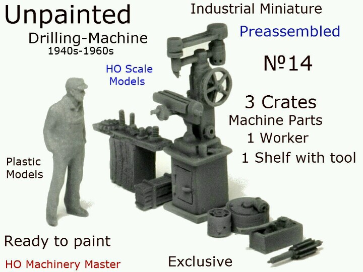 На счёт станков. Это готовые станки. По производителю точно не скажу. Упустил как-то набор Preiser, но там токарник был больше. Заводская модель. Я буду их дорабатывать. Вентили, рукоятки и сопутствующая станкам обстановка. Токарный станок буду подсвечивать. На фото ниже, видна лампа. Хочу её рабочей сделать. Она не в комплекте, потому тоже самому пилить и смд вставлять. Была возможность стеллажи и верстаки взять, но это всё у меня и так разработано. В придачу, под наши реалии.