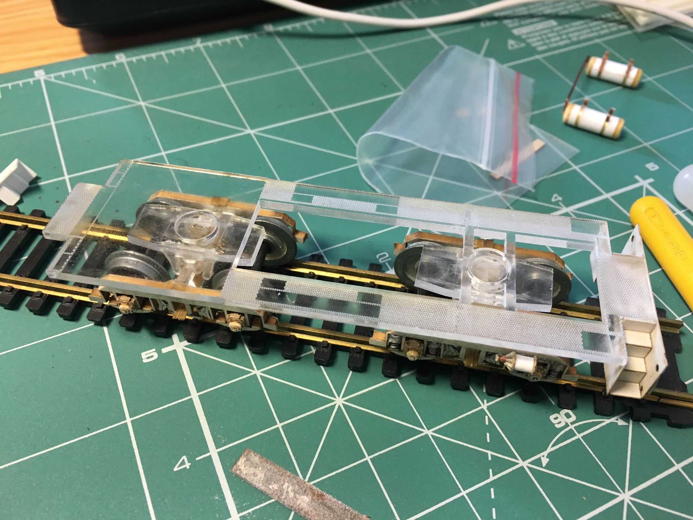 1. Пластик на тгм, частично нарезан, частично просто размечен. Лазеры акрил режут хорошо, а вот полистирол плавят. То есть, получить деталь возможно, но не будет совпадать с размерами и края будут сильно изуродованы. Возможно, кто-то смог подобрать настройки. Но все результаты, что видел я и то, что получалось у меня, это печаль. А вот с акрилом всё отлично. Но в продаже, тоньше 1мм не видел. У меня пока, только 2мм. Нашёл 0,5мм примерно и вроде как пишется, что хорошо поддаётся обработке лазером. Но пока не смог доехать и купить. На фото ниже, рама и настил тгм, сначала сделал из полистирола 2мм. Разметил лазером и резал руками. Потом, ко мне попал акрил 2мм. Итог на фото. Рифление настила и полностью вырезанная рама. Так же, детали из акрила, присутствуют на тележках. Но по тгм, я позже напишу, с позволения общественности.