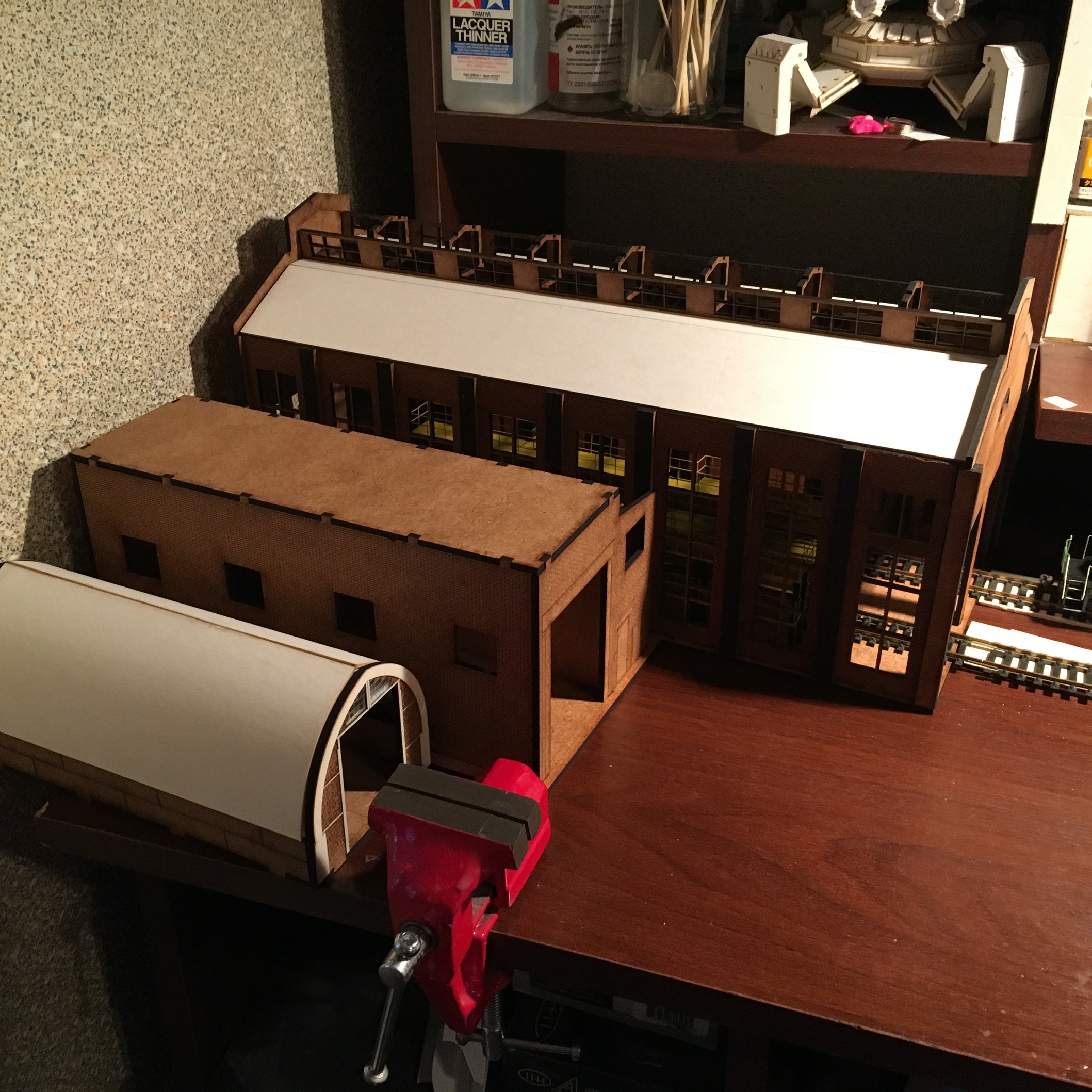 Итак, предварительно расставив на макет подручными средствами то, что планировал, начал воплощать это в жизнь. Так получилось, что к тому моменту, были готовы тесты трёх депо. Большое вы видели. При помощи нашего с ЮрСанычем общего друга Артёма, свет увидели ещё два депо. Оба промышленные, на одно стойло. Рассчитаны на локомотивы от тгм40, до тгм3, тгм4 и прочую маневровую малышню. О них тоже позже. Ниже на фото, все три депо, когда примерял их на столе и думал над сюжетом макета.