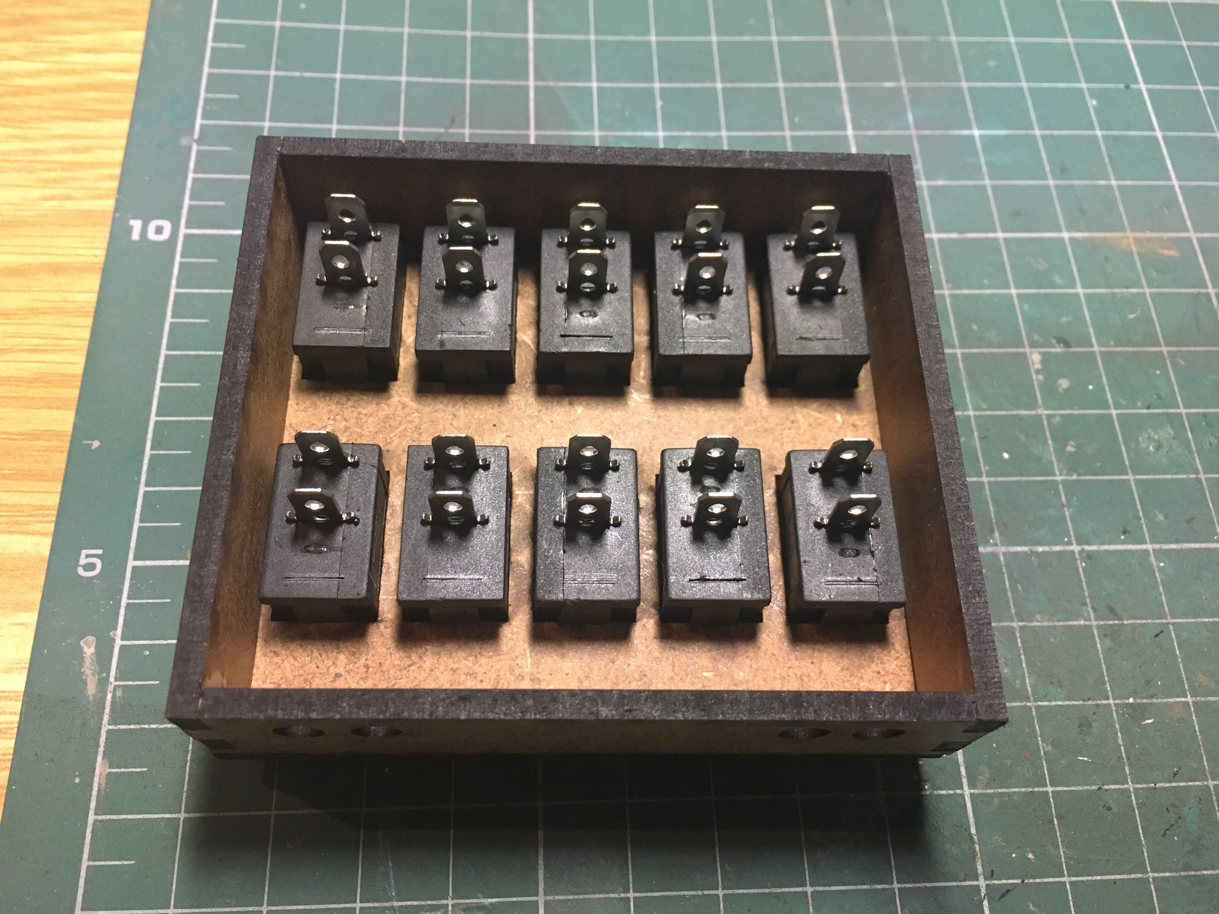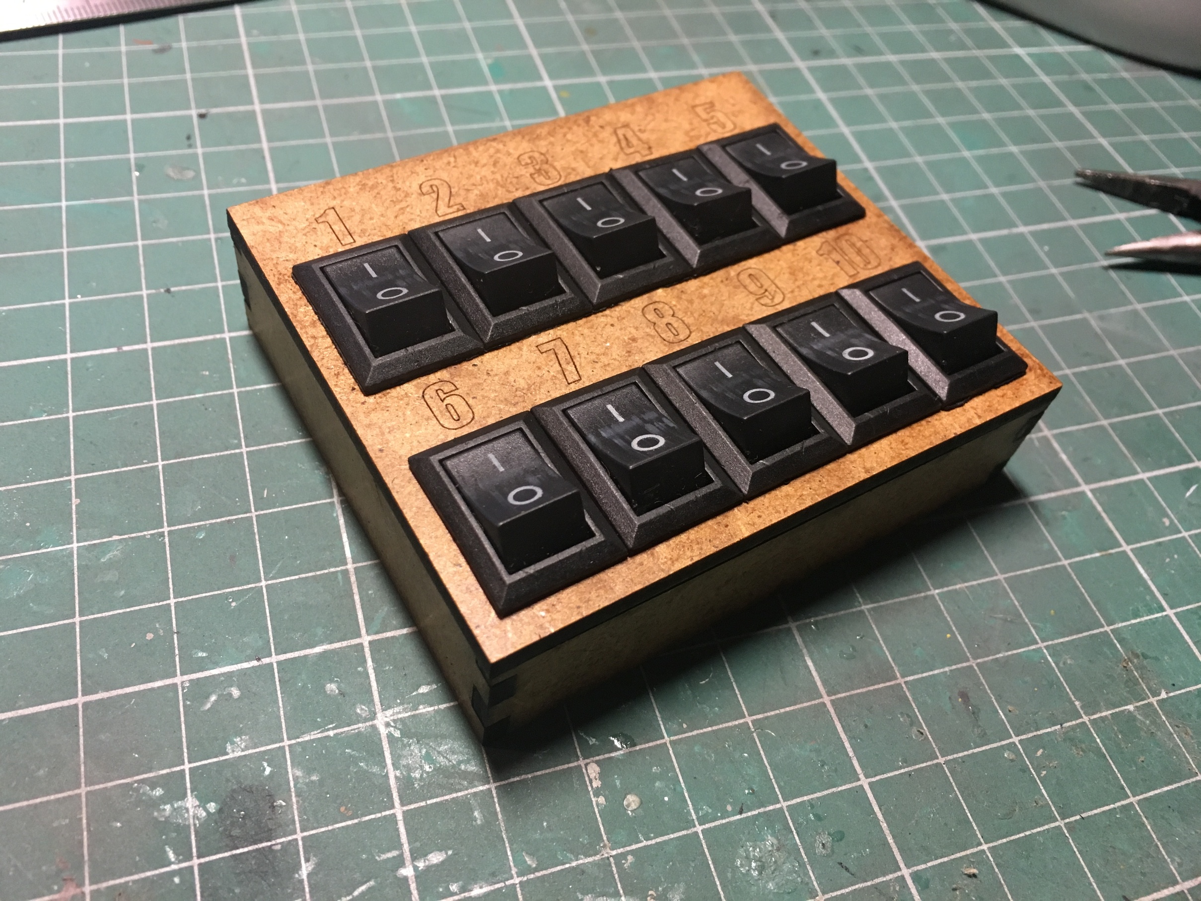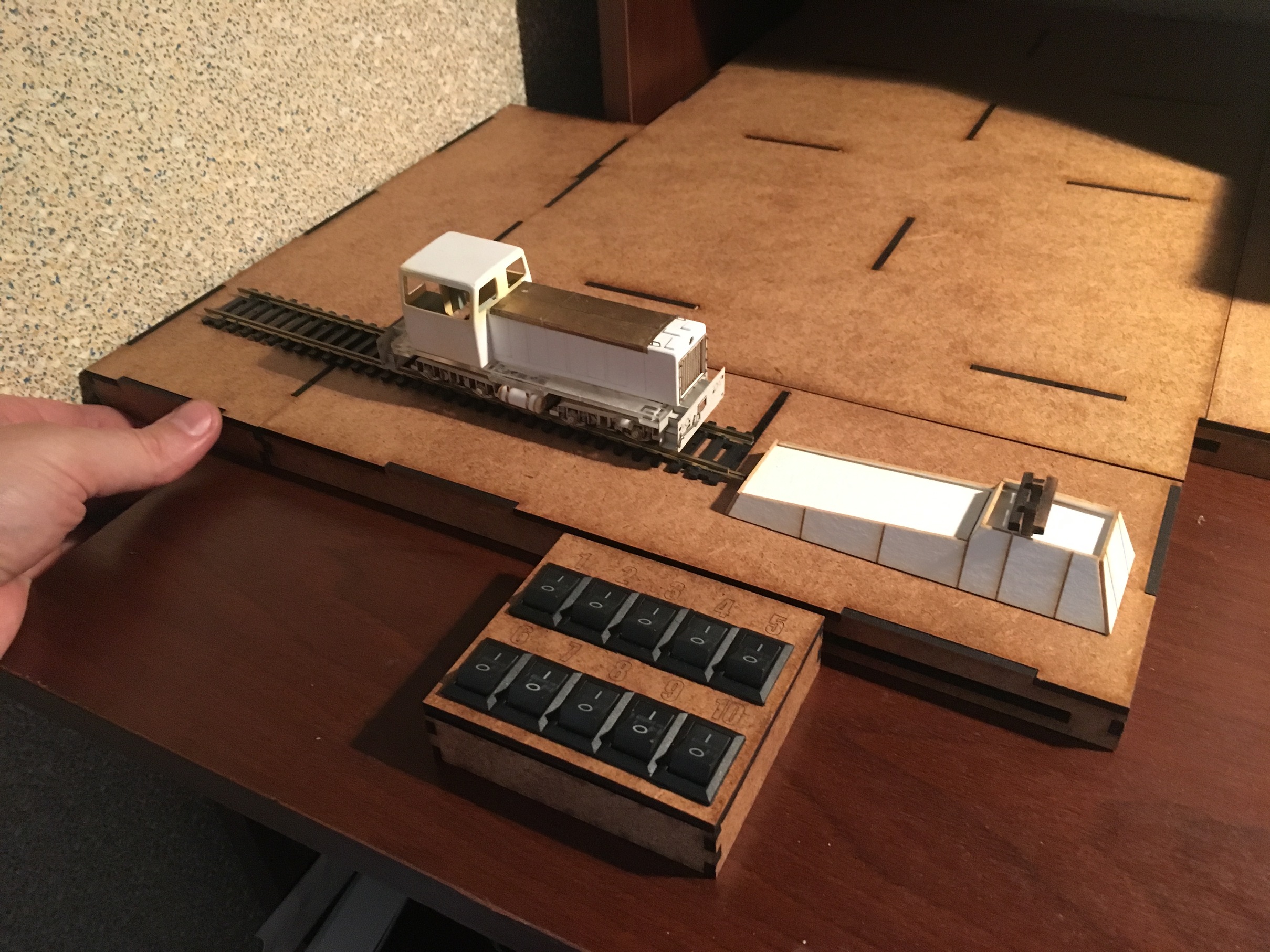 4. Забегая вперёд, раз был поднят вопрос, покажу пульт, который себе под освещение сделал. Выключатели из Китая. 20 штук, буквально 1,5-2уе с бесплатной доставкой. На макете они избыточны. Штуки 3 лишние точно. Но вдруг, что-то добавится. Хотел с индикаторами купить, но там цена, моментально вырастает до глупых цифр. Схема не сложная, перепутать будет почти невозможно. Тем более, всё пронумеровано. Коробочка на ладони помещается. Высота вровень с макетом. Материал - 3мм мдф.