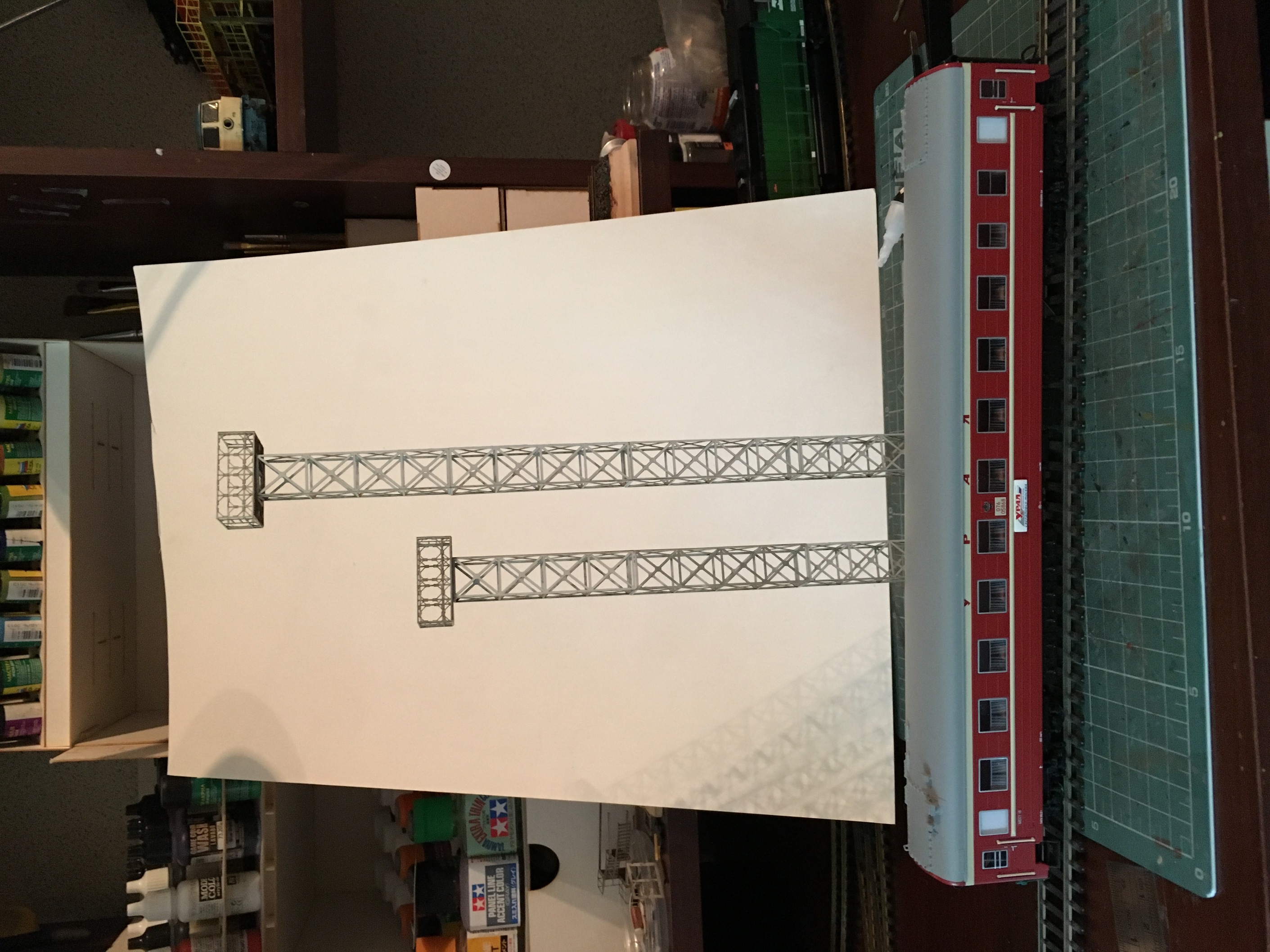 Далее продолжу по макету. Раз уже упоминалась часть мелочёвки, пробегусь по ней. Мачты кс, ригель с опорами, тупики. Мачты и ригель, это всё та же бумага 0,35мм с дальнейшей пропиткой цианакрилатом. На всё доставал в инете чертежи, потому, всё соответсвует схемам и размерам. По крайней мере, старался максимально следовать чертежам.