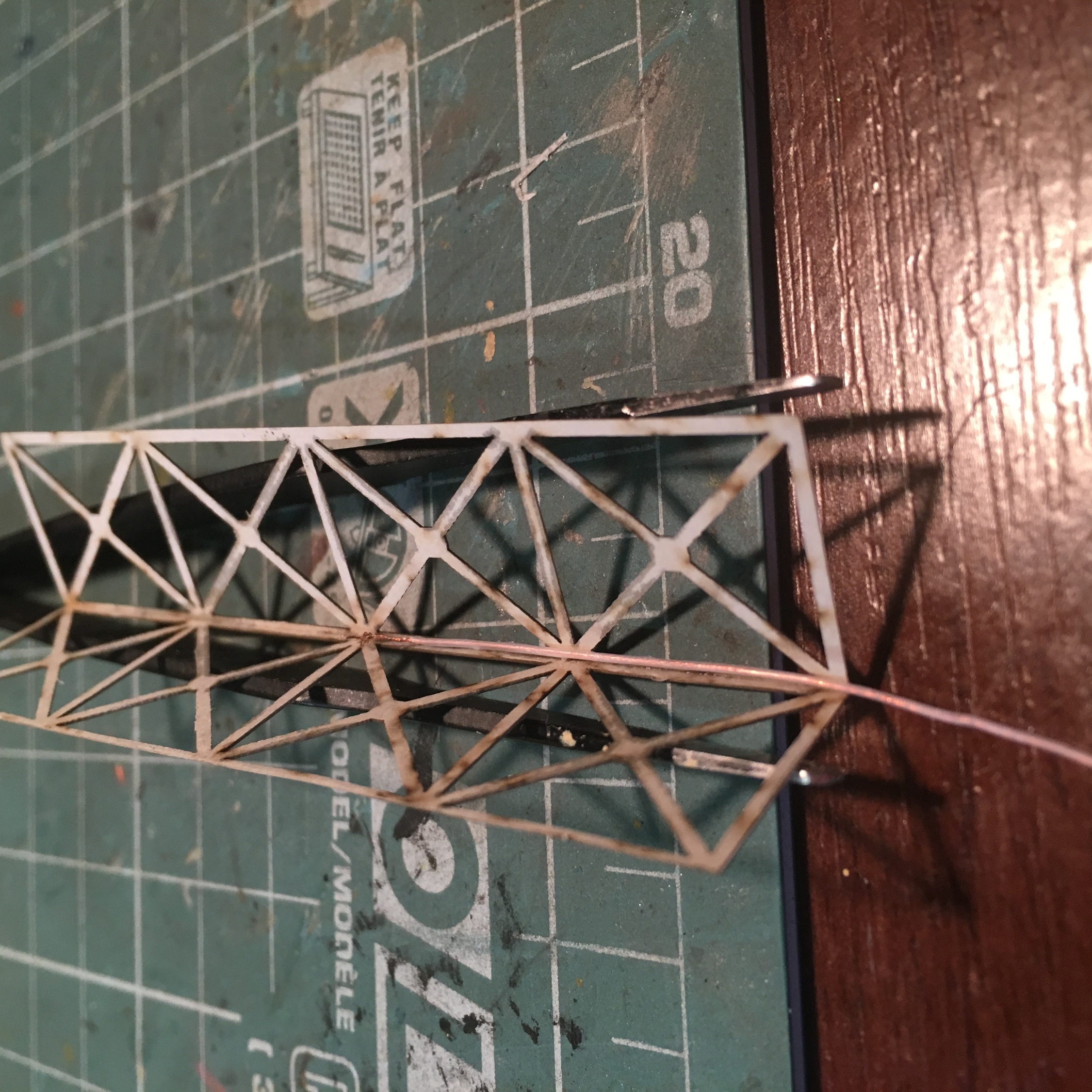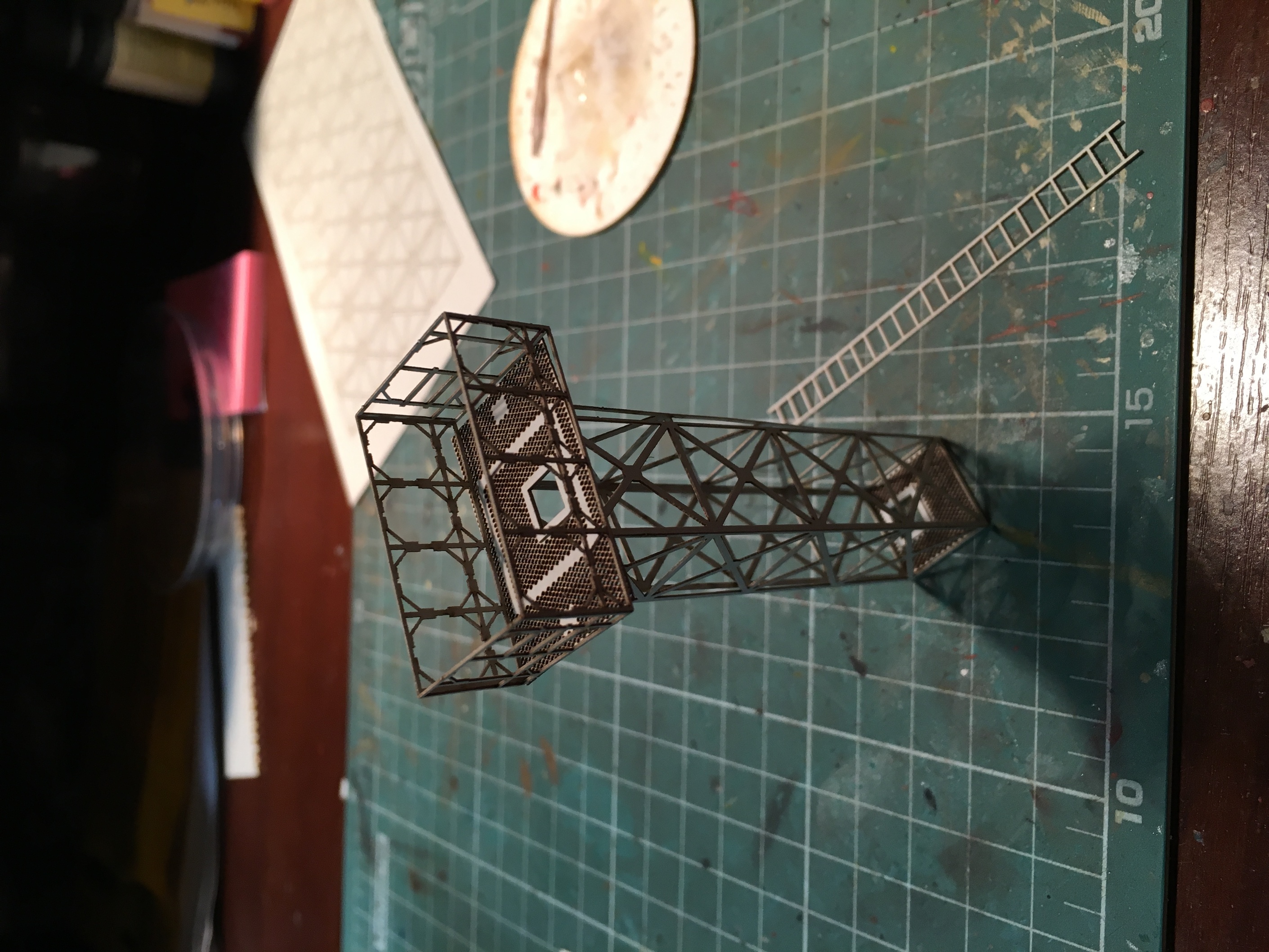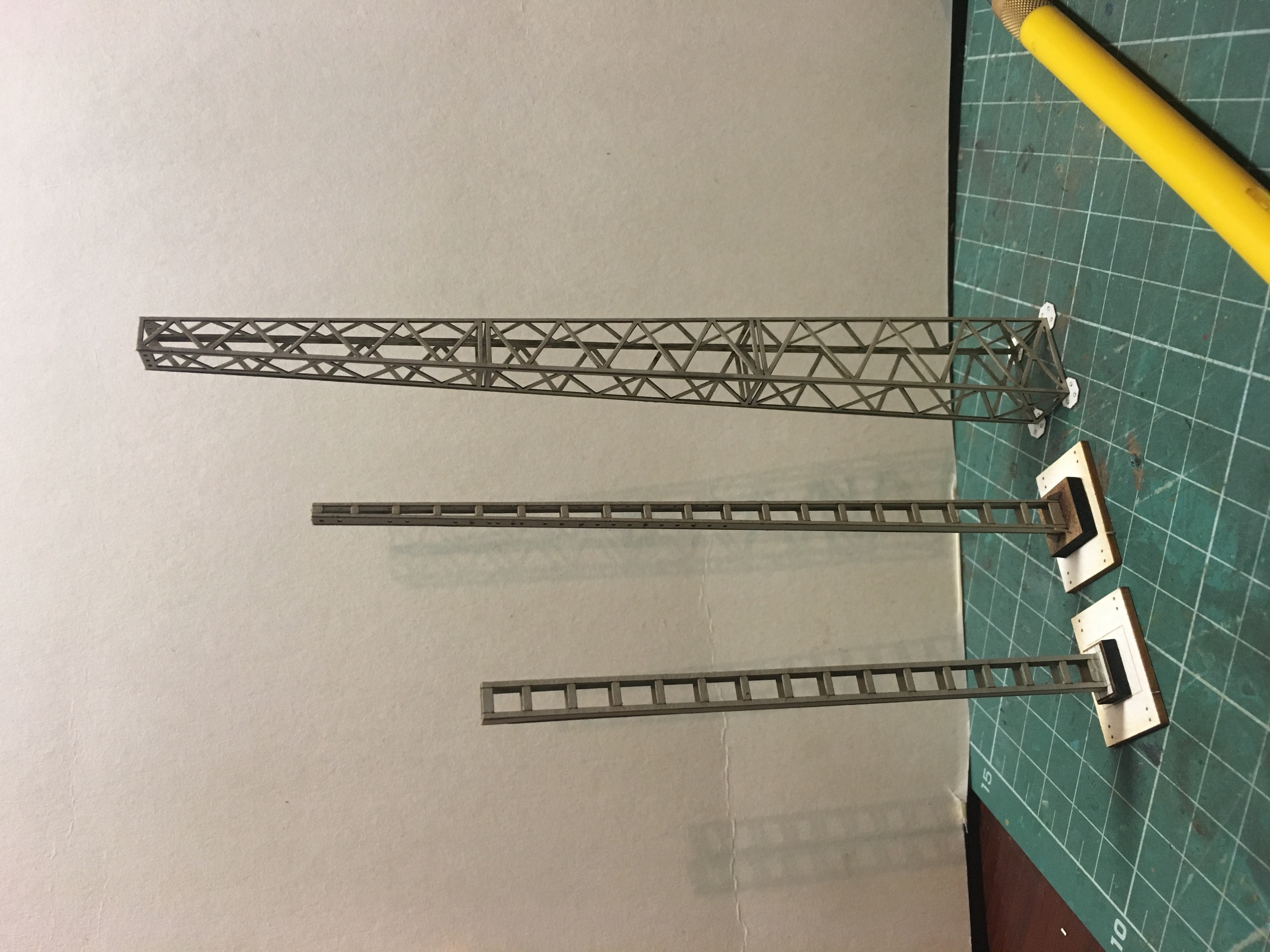 3. Ригель и опоры. Покажу просто подробные фото, а как буду писать по нефтекачке, распишу, что да как. Размер по длине, подгонял под свои нужды, максимально стараясь, не отходить от найденных чертежей. Опоры по чертежам, без изменений. На одной из фото, опора, в сравнении с мачтой кс. На второй фото, примерка по месту. Сам ригель, просто прихвачен цианакрилатом в нескольких местах. Его нормальная сборка, ещё впереди.