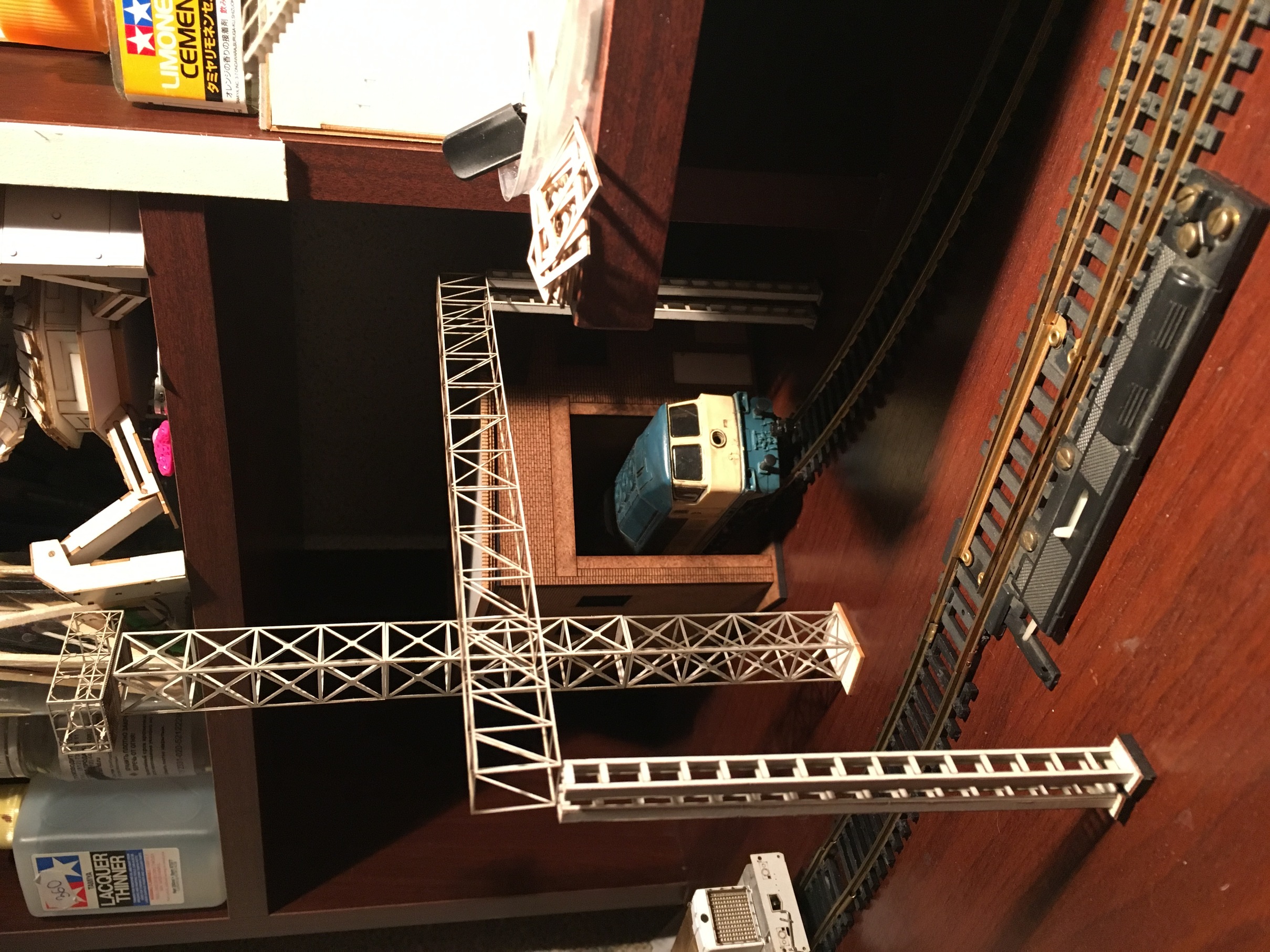 Ригель через пути, это опоры для труб от нефтекачки. Мачта освещения будет слева и справа на макете. Чтоб ниши освещать. Малый цилиндр, это условно песочница. Забегая вперёд напишу - за песочницей, добавится два отрезка путей. И за ними пакгауз. Кажется напичкано, но в итоге, на мой взгляд, выйдет очень гармонично.
