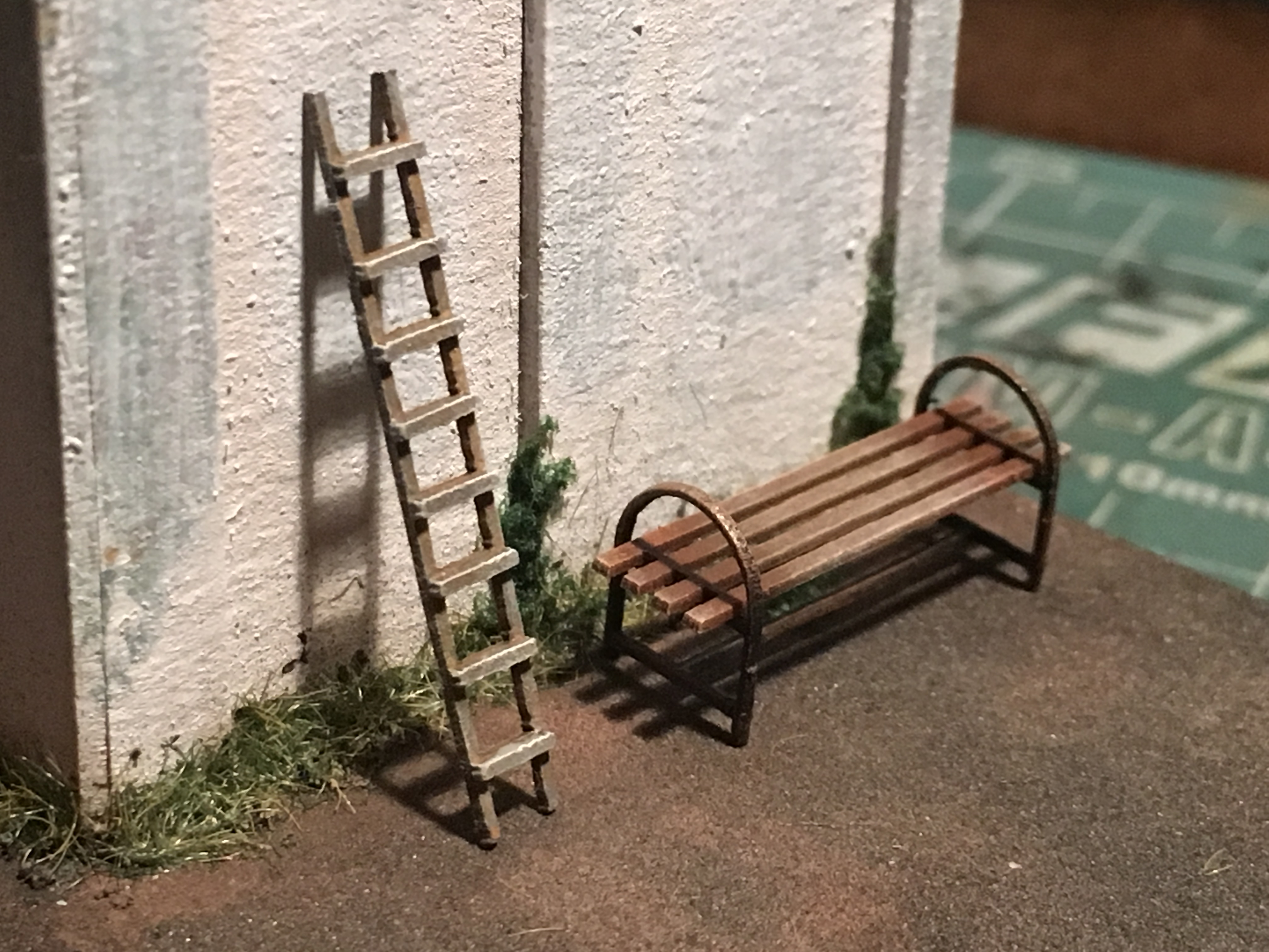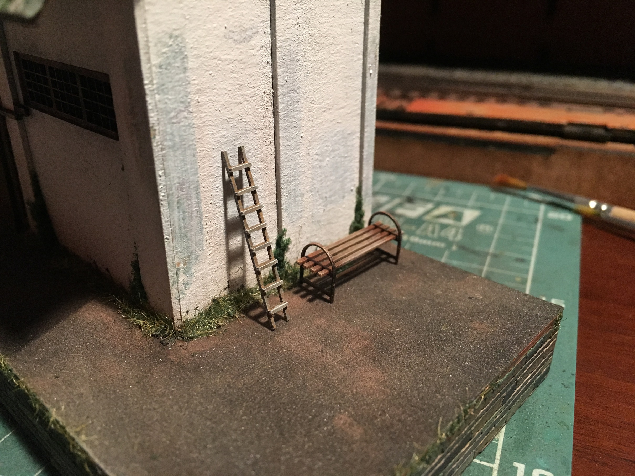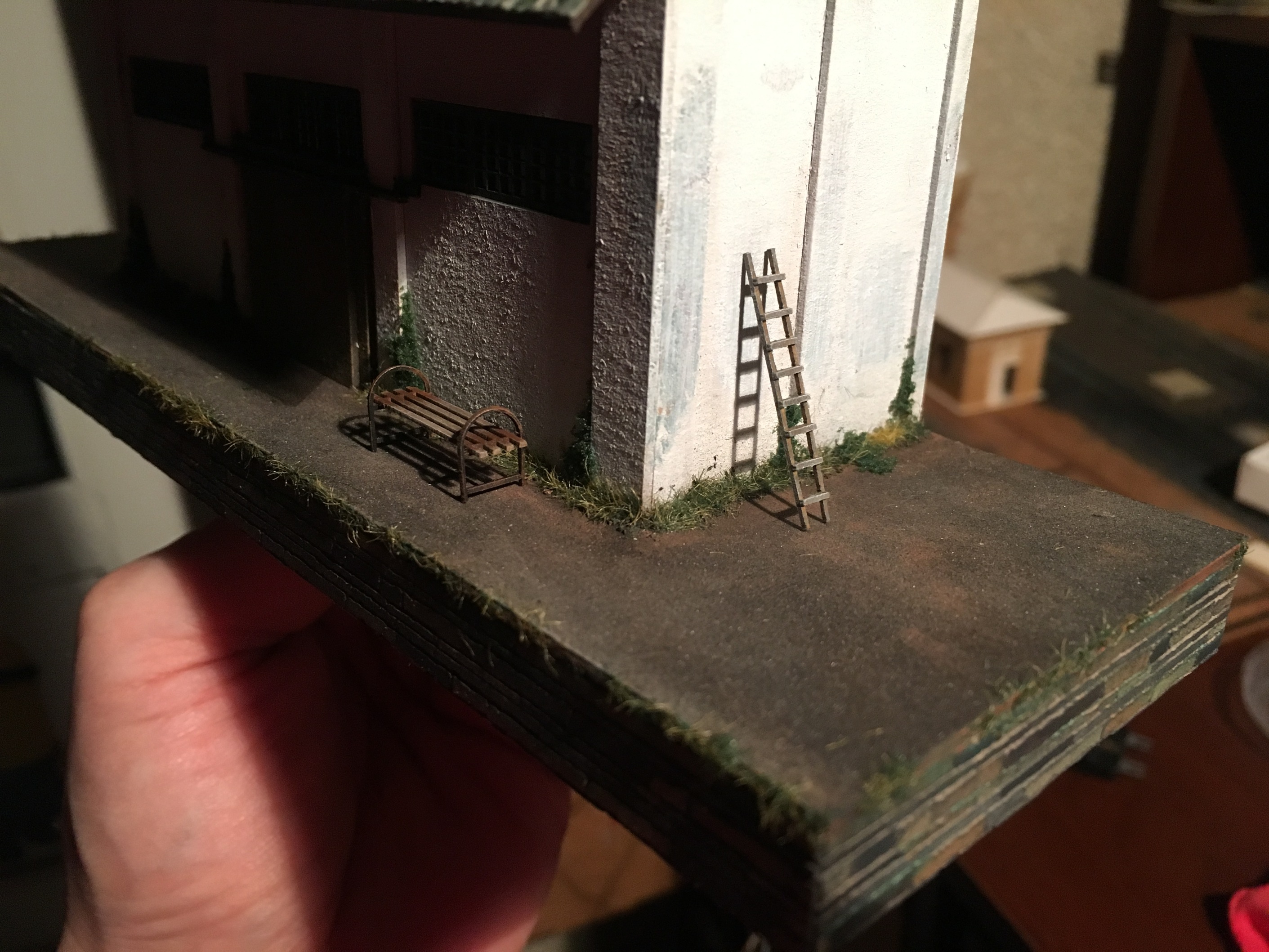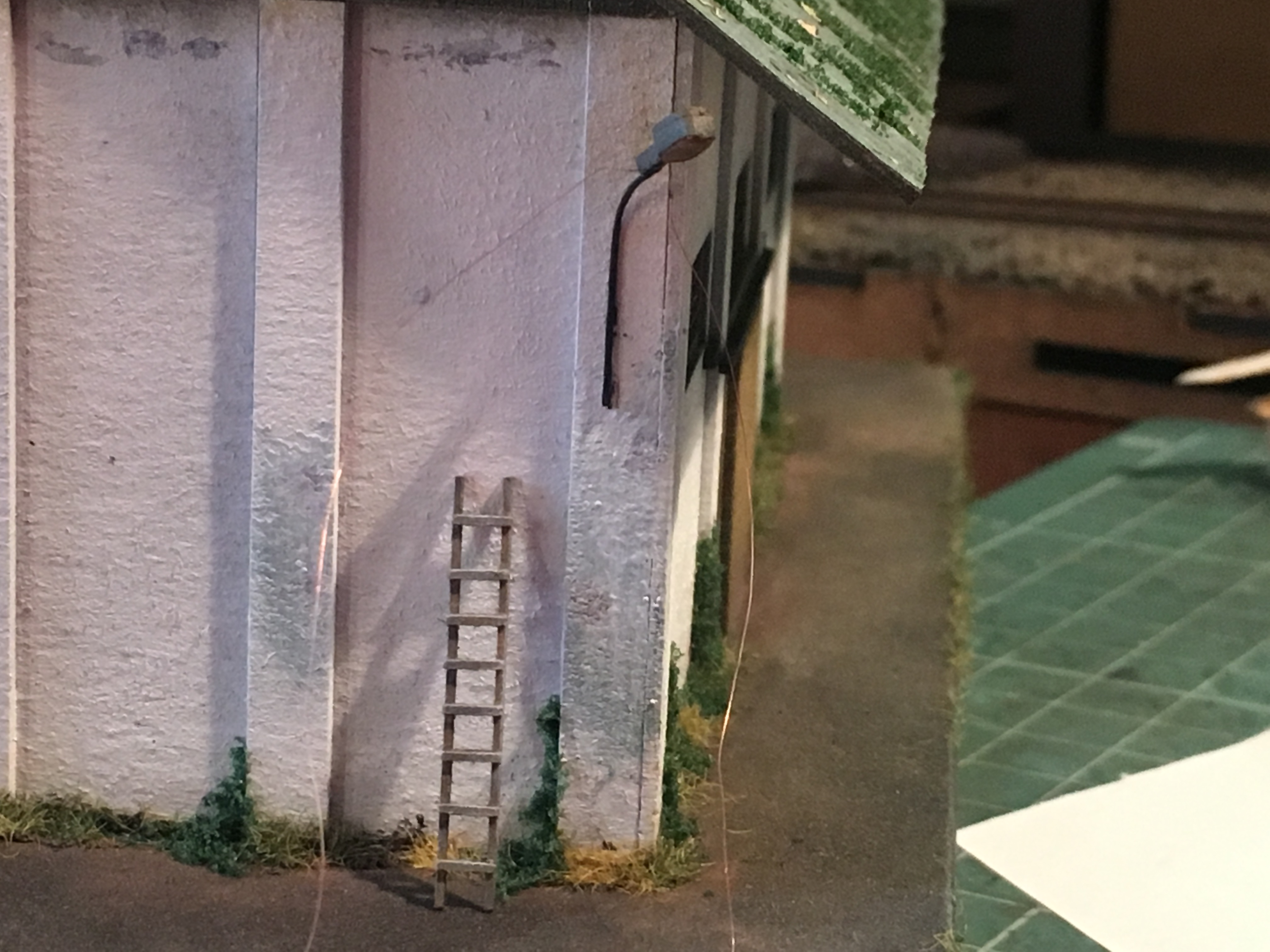 Доброй ночи. Посидел немного перед сном. Закончил освещение, крышу установил. Но пока сомнения гложут. Свет приближённый к оригиналу, но для макета мне кажется бледным. Позже попробую фото сделать. Либо не переделывать, а компенсировать наружным освещением. Пока не решил. И немного мелочи сделал и покрасил. Фото ниже.