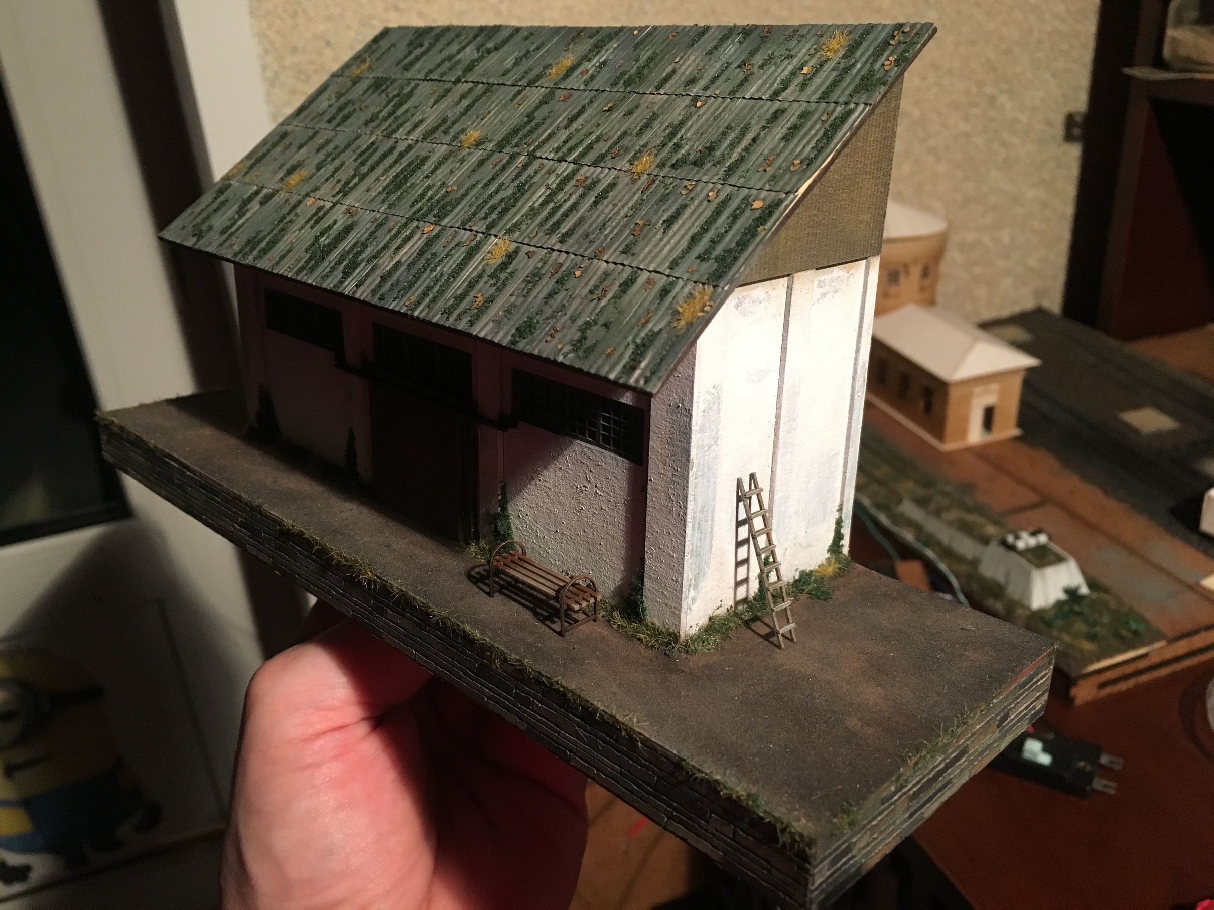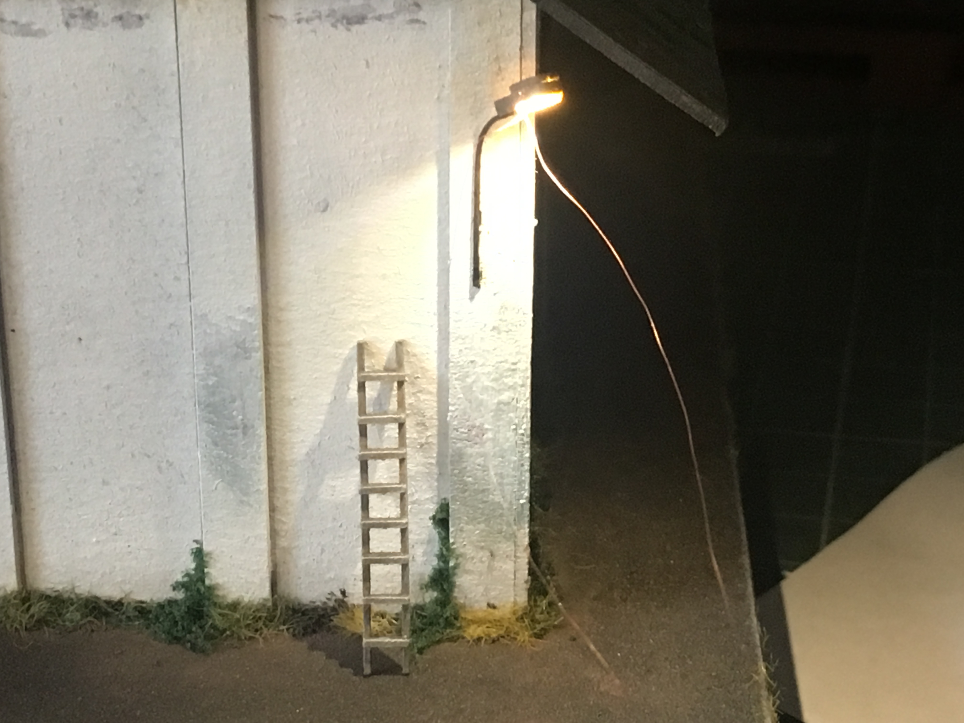 Добрый день. Учитывая, что сегодня праздник и как следствие - выходной, в дневной сон детей, удалось посидеть. По итогам, склоняюсь к тому, что придётся потрошить пакгауз и менять внутри освещение. Ну а пока, был произведён тест уличного фонаря и освещения у пакгауза. В целом доволен. Возможно, я что-то доработаю, но в целом, такие фонари будут установлены по всему макету. Смд светодиод с тёплым желтым. И подобрал мощность освещения, чтоб устраивала меня. И не било как прожектор, и не было тусклым. Ниже фото результатов.