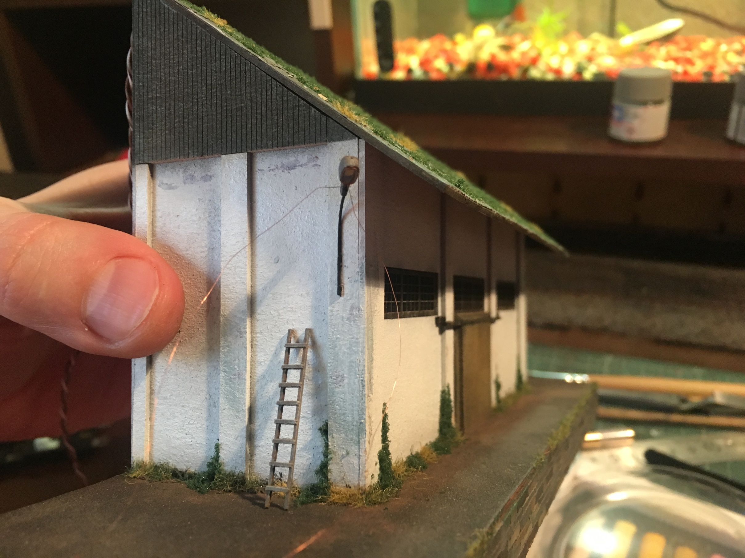 Что касается пакгауза. Видны просветы по краям оконных рам. Залил клеем изнутри уже. Как высохнет, закрашу чёрной краской и ликвидирую этот момент. В целом, пакгауз наверное завершён. Трубу справа из стены, как на оригинале, я не буду ставить. Ее просто не будет видно. Позже покрашу разного груза и расставлю по платформе пакгауза. Ну и таки пару-тройку фигур туда. Если убирать вагон, либо платформу, фигуры будут отлично видны и оживят постройку.