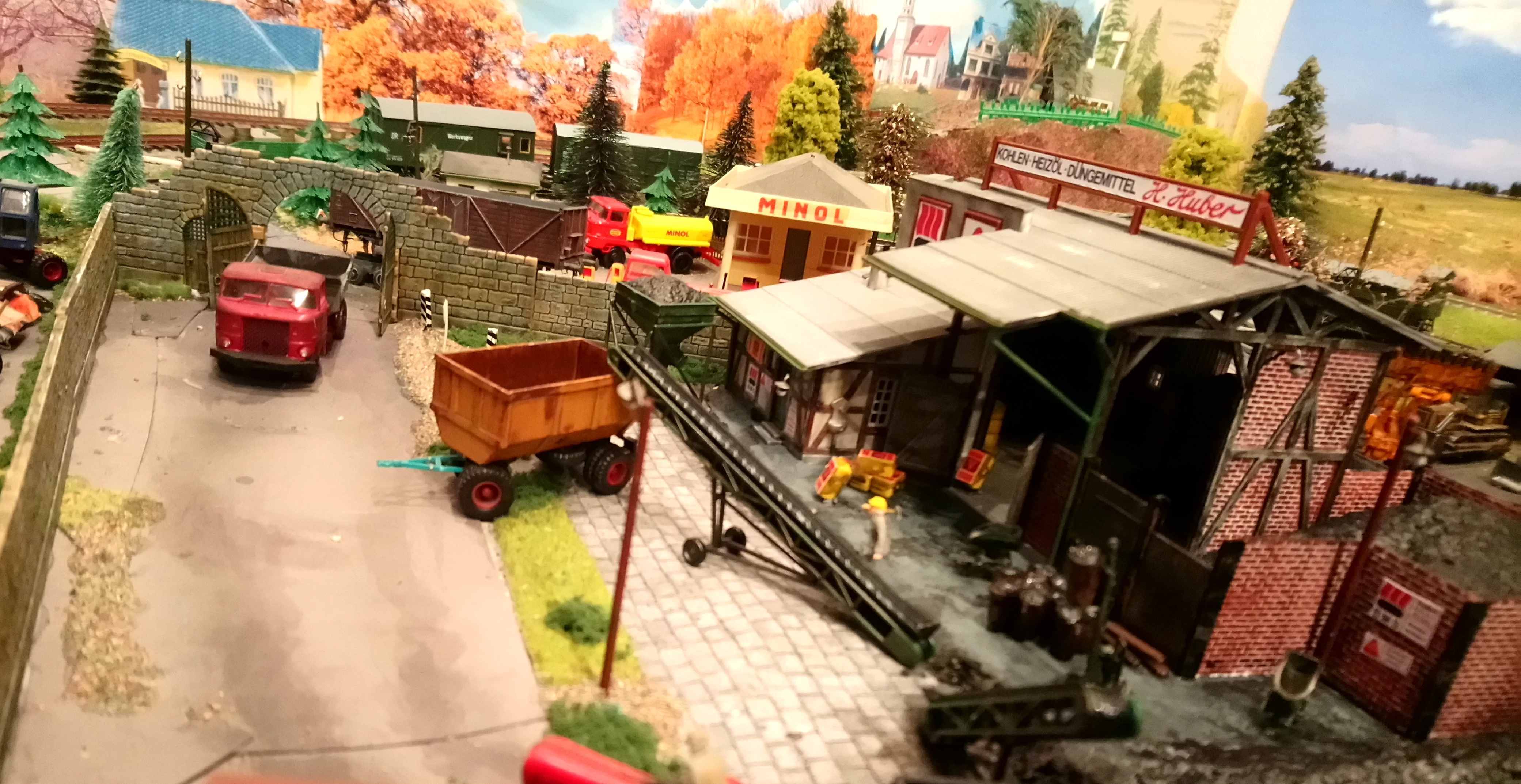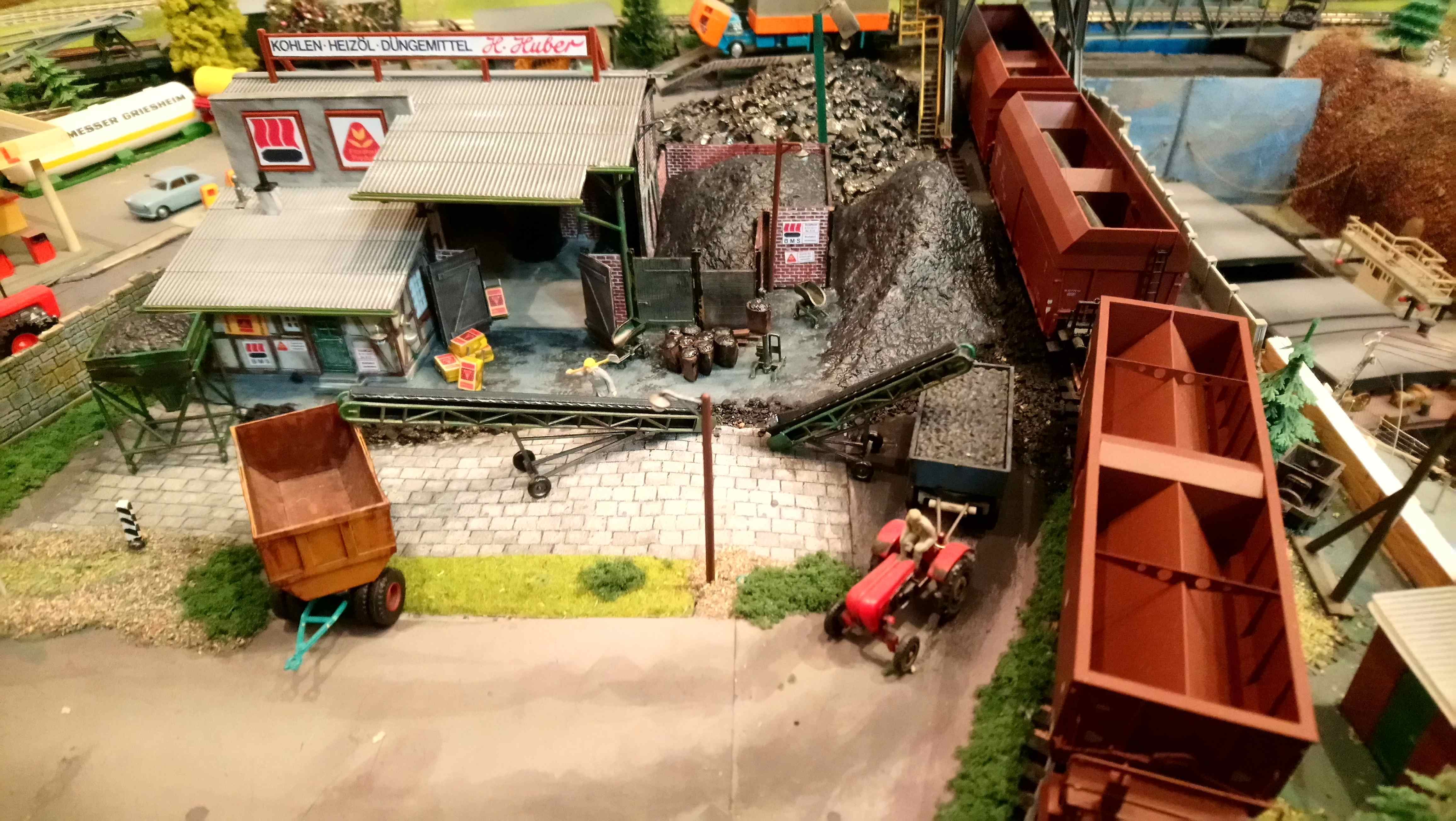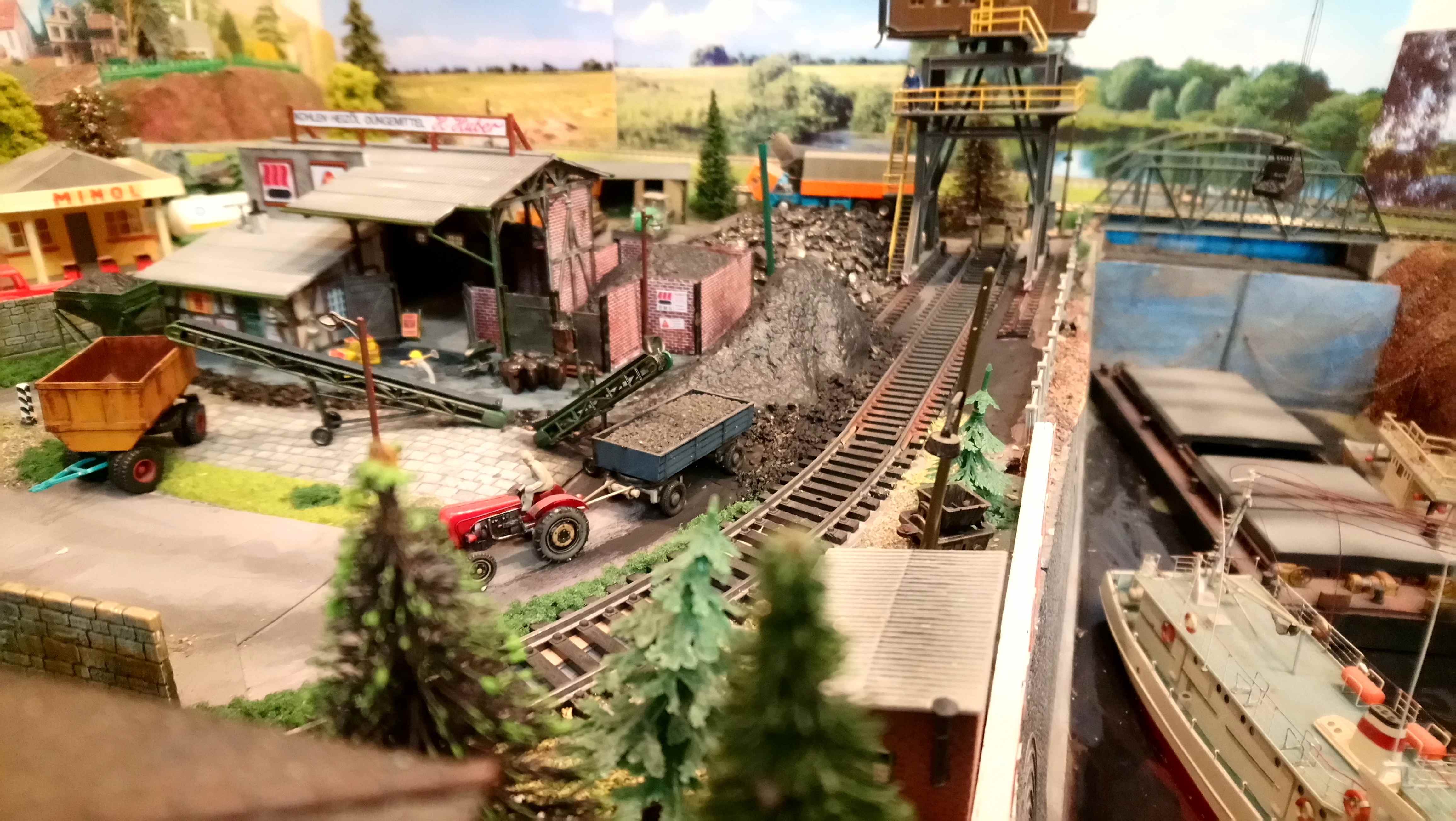 отсыплю угольные кучи дробленым натуральным углем.На пока все выглядит так. Многие элементы не приклеены и можно моделировать разные сценки. По легенде в данной пром зоне производится разгрузо погрузочные работы угля с вагона на баржи.