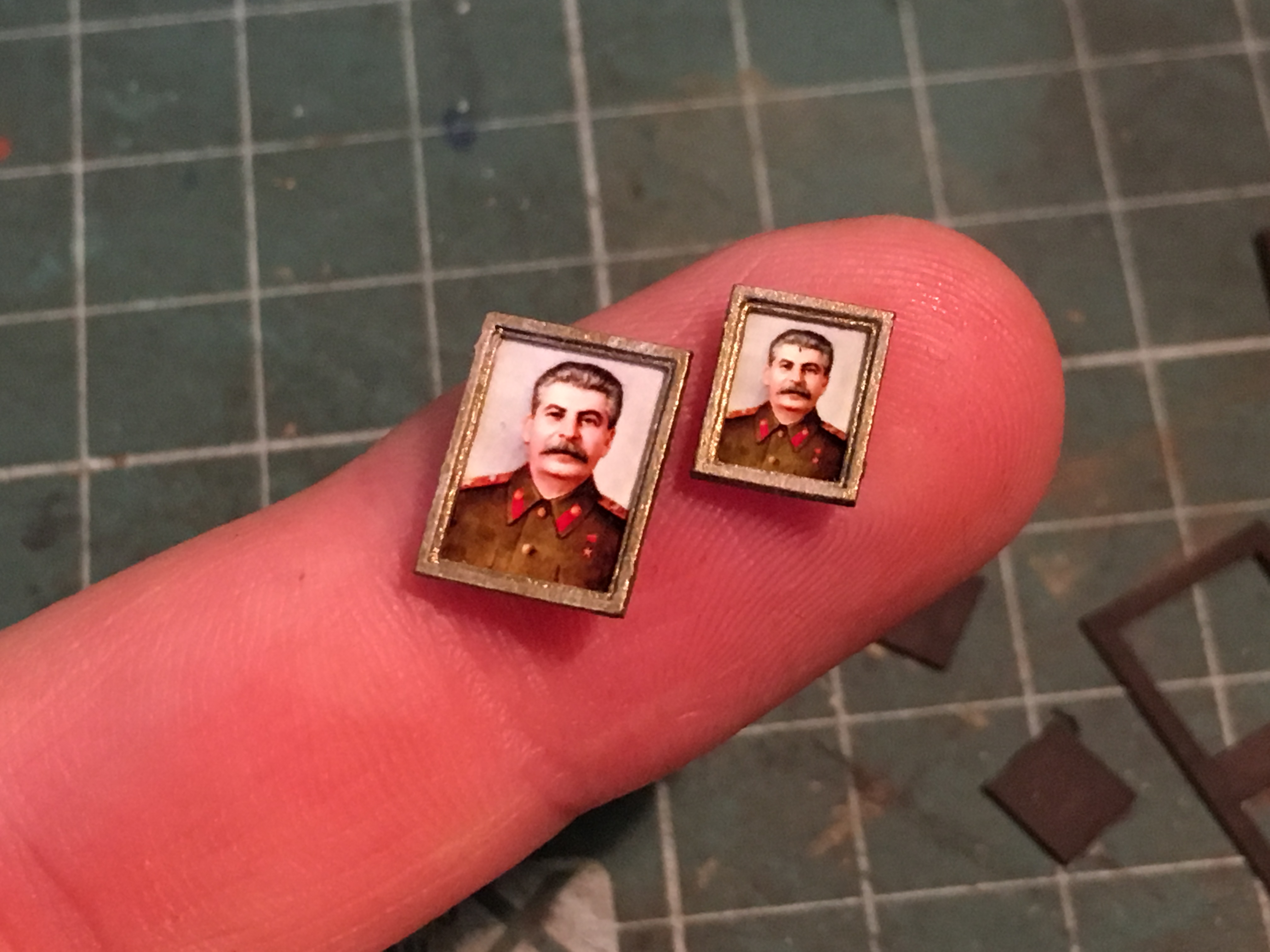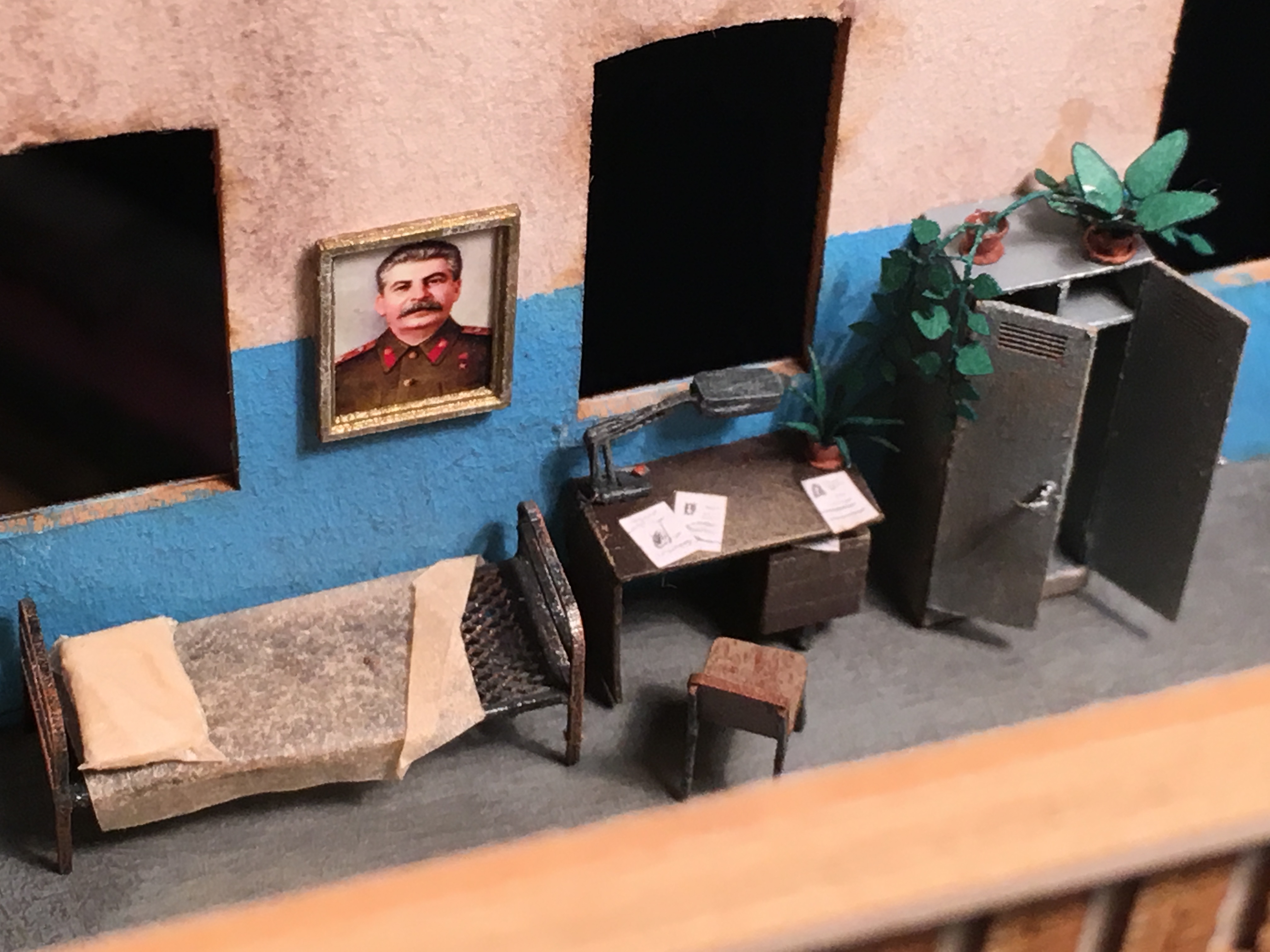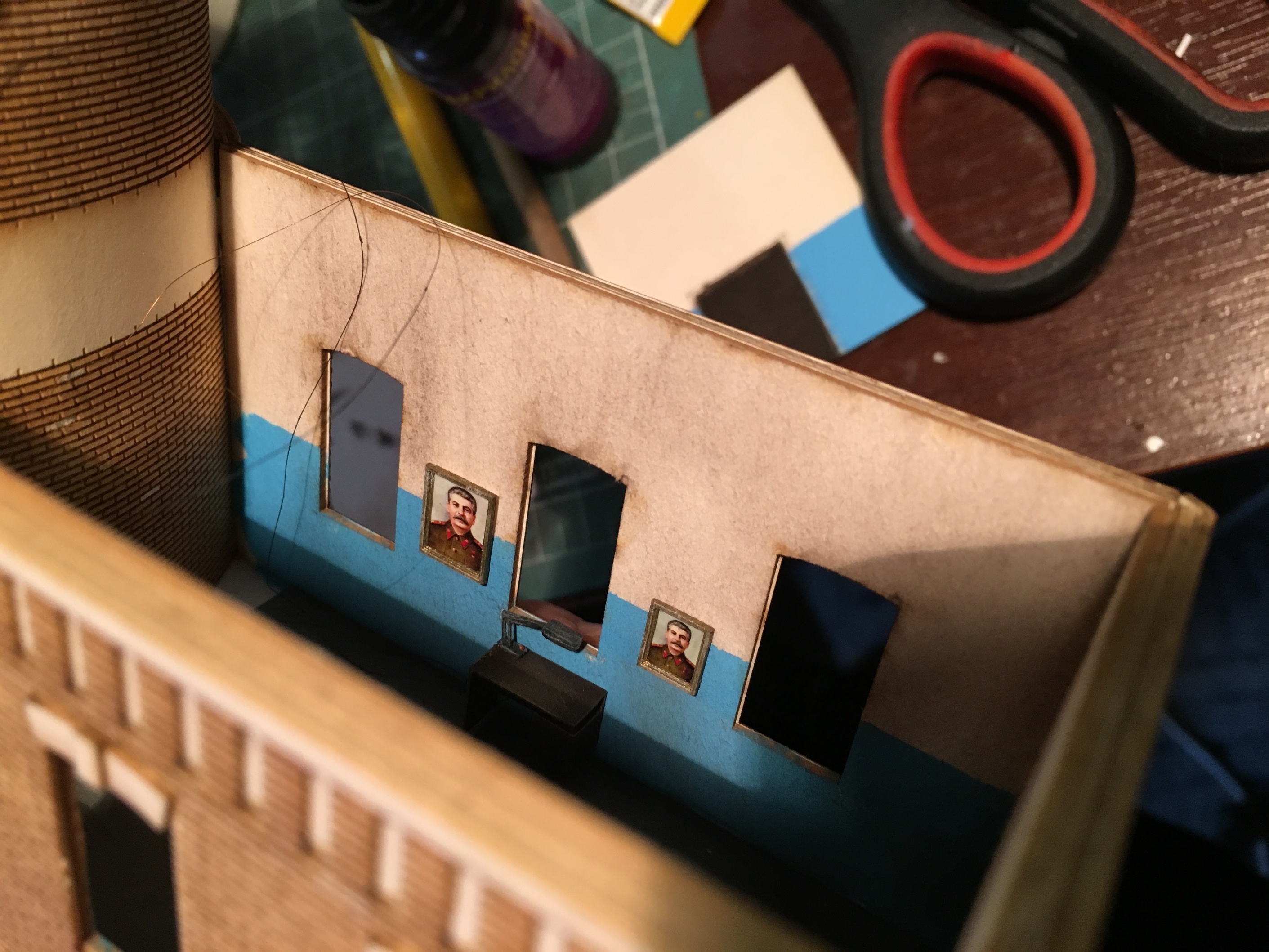Добрый вечер. Благодарю администрацию, что почистили тему. Продолжу неспешно. Не могу сказать, что сильно продвинулся. Вывел проводку наружу здания, да занимался интерьером. Это ещё не всё, но основная часть закончена. Прошу выбор личности на портрете не политизировать никак. Мне так захотелось и не более. Дежурный на нефтекачке, дедушка, который чтит персону на фото и значит так тому и быть. Портрет на стене и дедушка рад,и счастлив. Изготовление было более чем простым. Печать на струйнике, на фотобумаге с прочими плакатами, табличками, знаками и постерами. Далее нарезал две детали рамки. Собрал, покрасил бронзой, чуть состарил и подложкой наклеил портрет. В итоге, вроде бы ничего так вышло. Сделал два размера, но выбрал крупнее. Поясню - дедушка очень уважает личность на портрете и у него плохое зрение. И ещё не менее весомый аргумент - нужно, чтоб через окна, вблизи от макета, было хоть что-то видно. А так, если отбросить вышеперечисленное, маленький портрет, тоже неплохо бы смотрелся. Ниже пара фото.