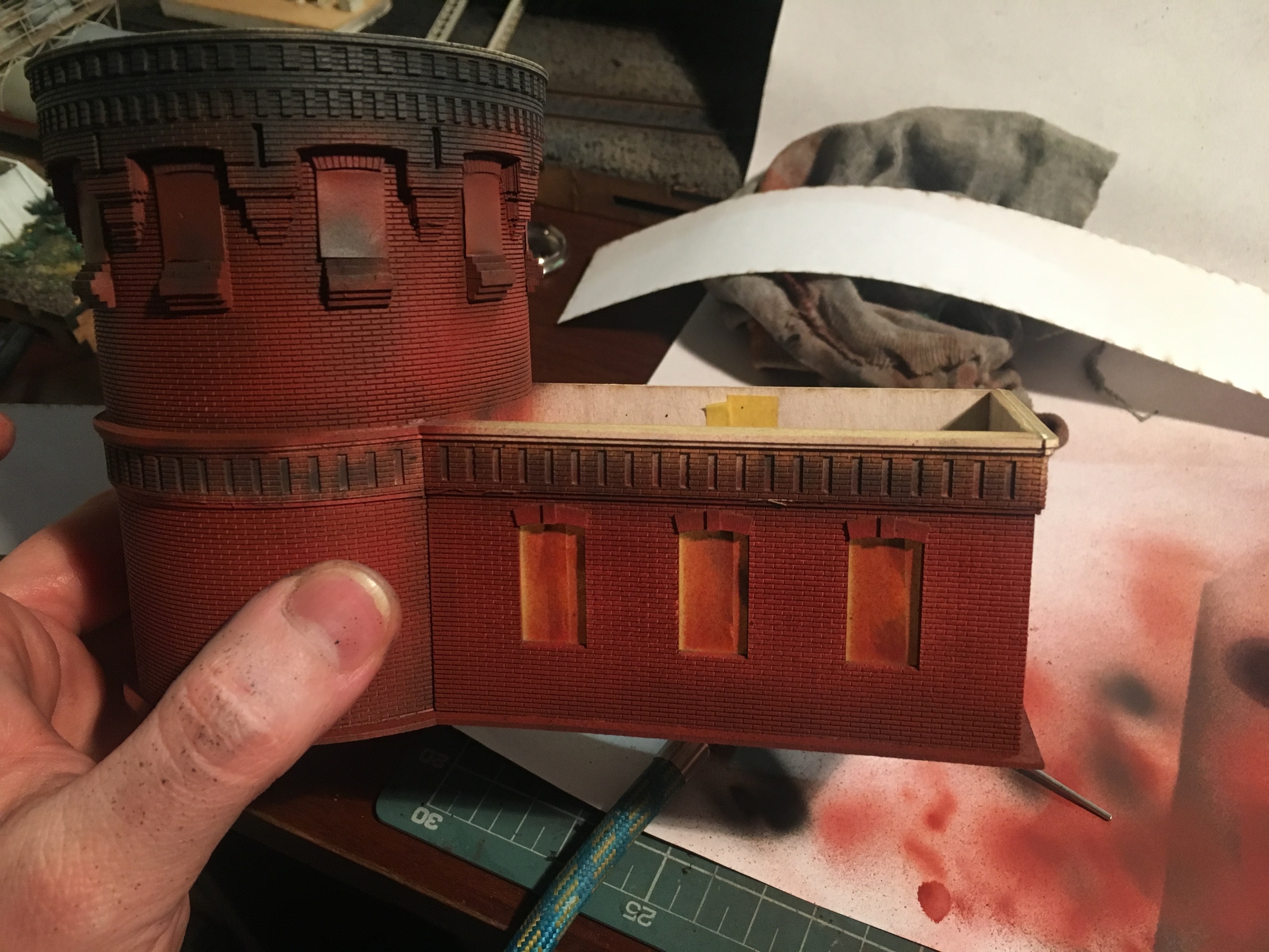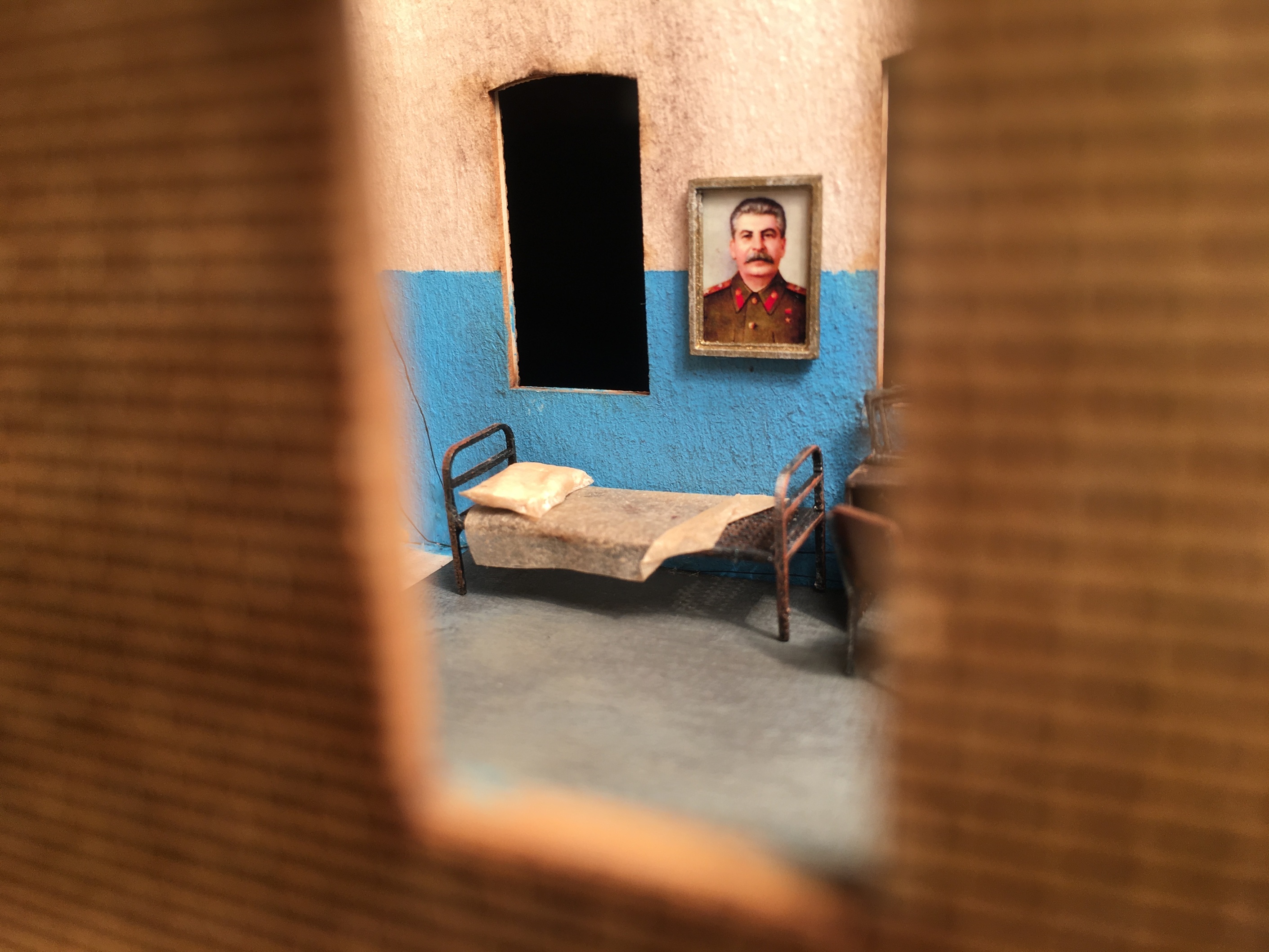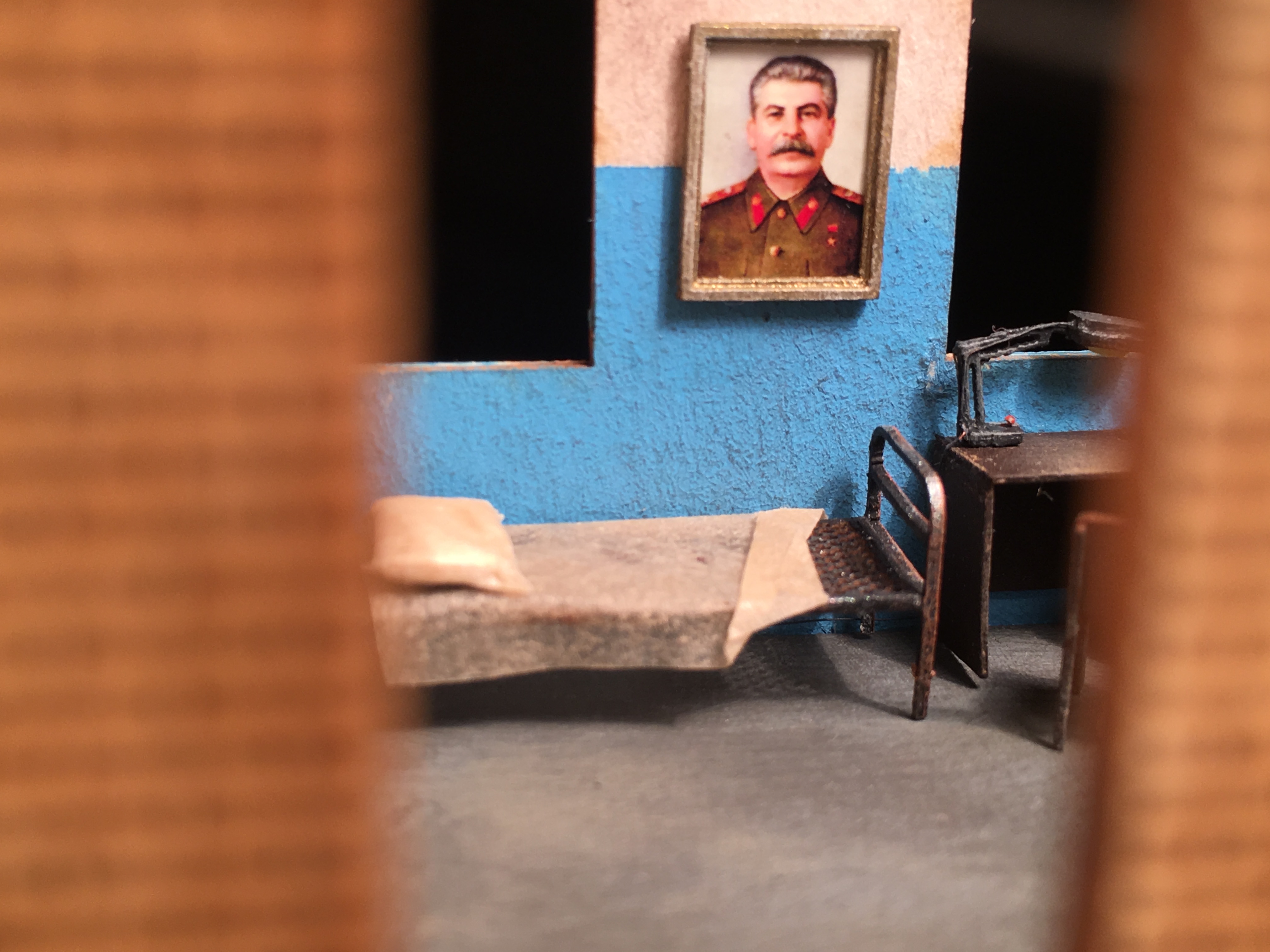 Добрый вечер. Благодарю администрацию, что почистили тему. Продолжу неспешно. Не могу сказать, что сильно продвинулся. Вывел проводку наружу здания, да занимался интерьером. Это ещё не всё, но основная часть закончена. Прошу выбор личности на портрете не политизировать никак. Мне так захотелось и не более. Дежурный на нефтекачке, дедушка, который чтит персону на фото и значит так тому и быть. Портрет на стене и дедушка рад,и счастлив. Изготовление было более чем простым. Печать на струйнике, на фотобумаге с прочими плакатами, табличками, знаками и постерами. Далее нарезал две детали рамки. Собрал, покрасил бронзой, чуть состарил и подложкой наклеил портрет. В итоге, вроде бы ничего так вышло. Сделал два размера, но выбрал крупнее. Поясню - дедушка очень уважает личность на портрете и у него плохое зрение. И ещё не менее весомый аргумент - нужно, чтоб через окна, вблизи от макета, было хоть что-то видно. А так, если отбросить вышеперечисленное, маленький портрет, тоже неплохо бы смотрелся. Ниже пара фото.