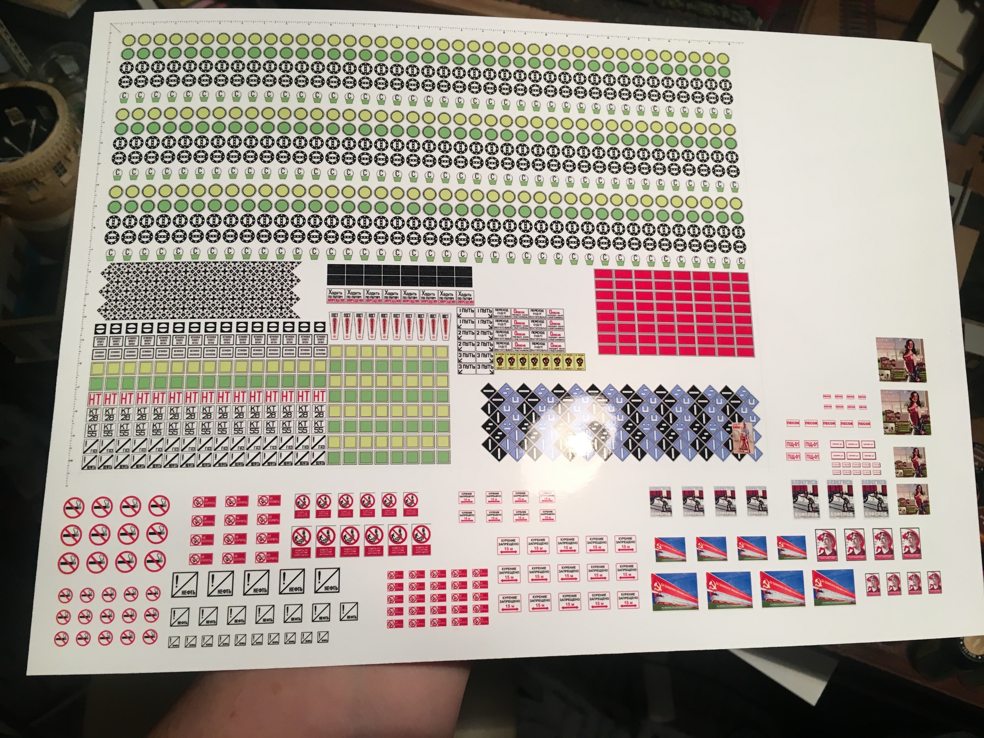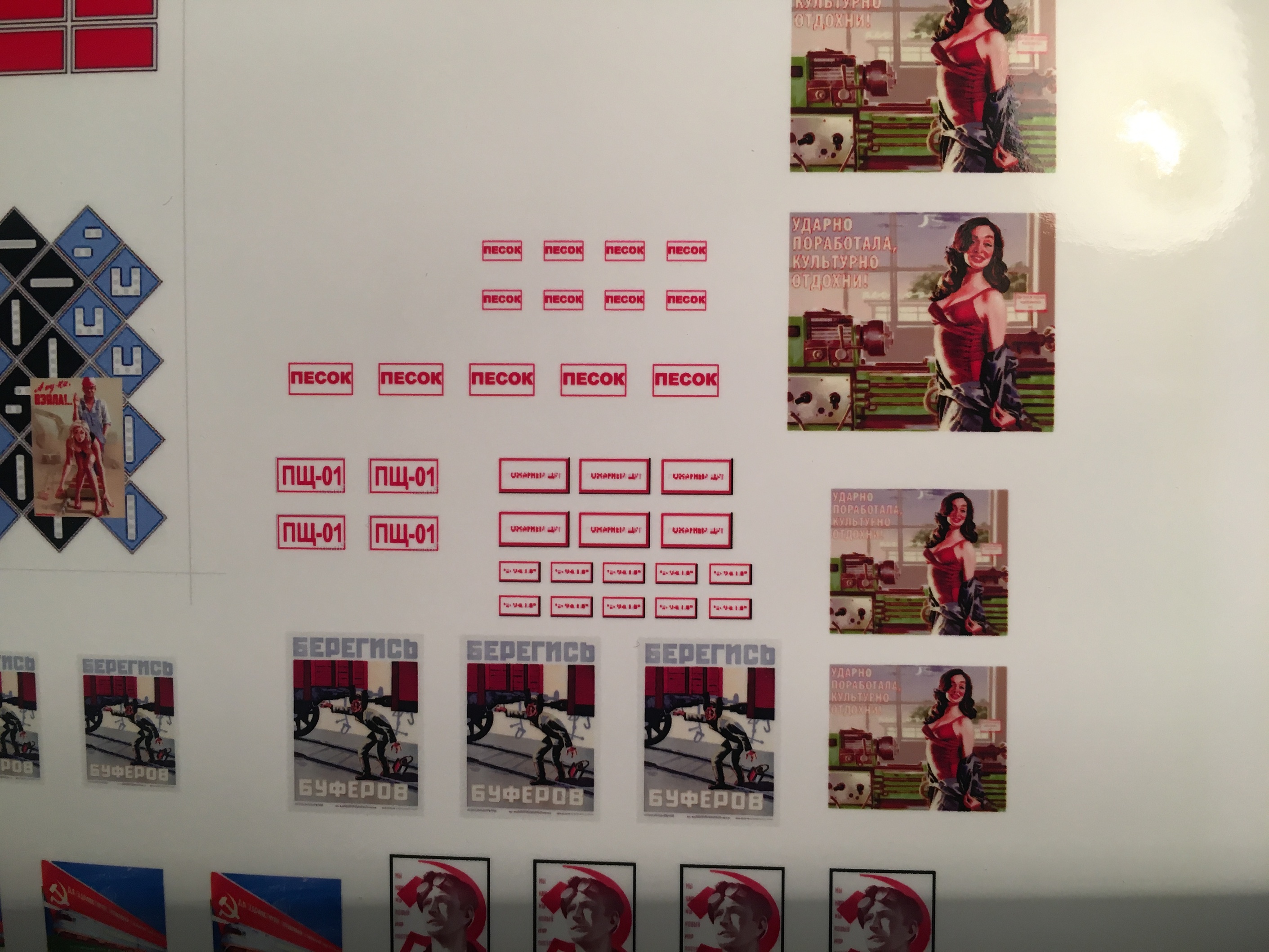 На распечатках порно нет. Это несколько плакатов в стиле Советский Пинап. Там много юмористических рисунков на тему работяг и девушек. Скажем барышня на фоне станка, это у меня для беседки плакат. Есть идея, у депо сделать беседку для отдыха, домино в перерыв и так далее и там повесить этот плакат. Мужики в депо тоже люди ведь :-) календари и плакаты на тему женщин, им не чужды. Ну а засовывать в макет откровенную порнуху, нет никакого желания. А пинап, это идеальный выход. Хорошая стилизация и много идей. Хотя конечно, душок Американской культуры от пинапа тянет, но не вижу ничего в этом криминального. И синее, это не забор. Это знаки, разложенные на макете, встык. Чтоб меньше работы ножиком/ножницами было. Для удобства так сказать.