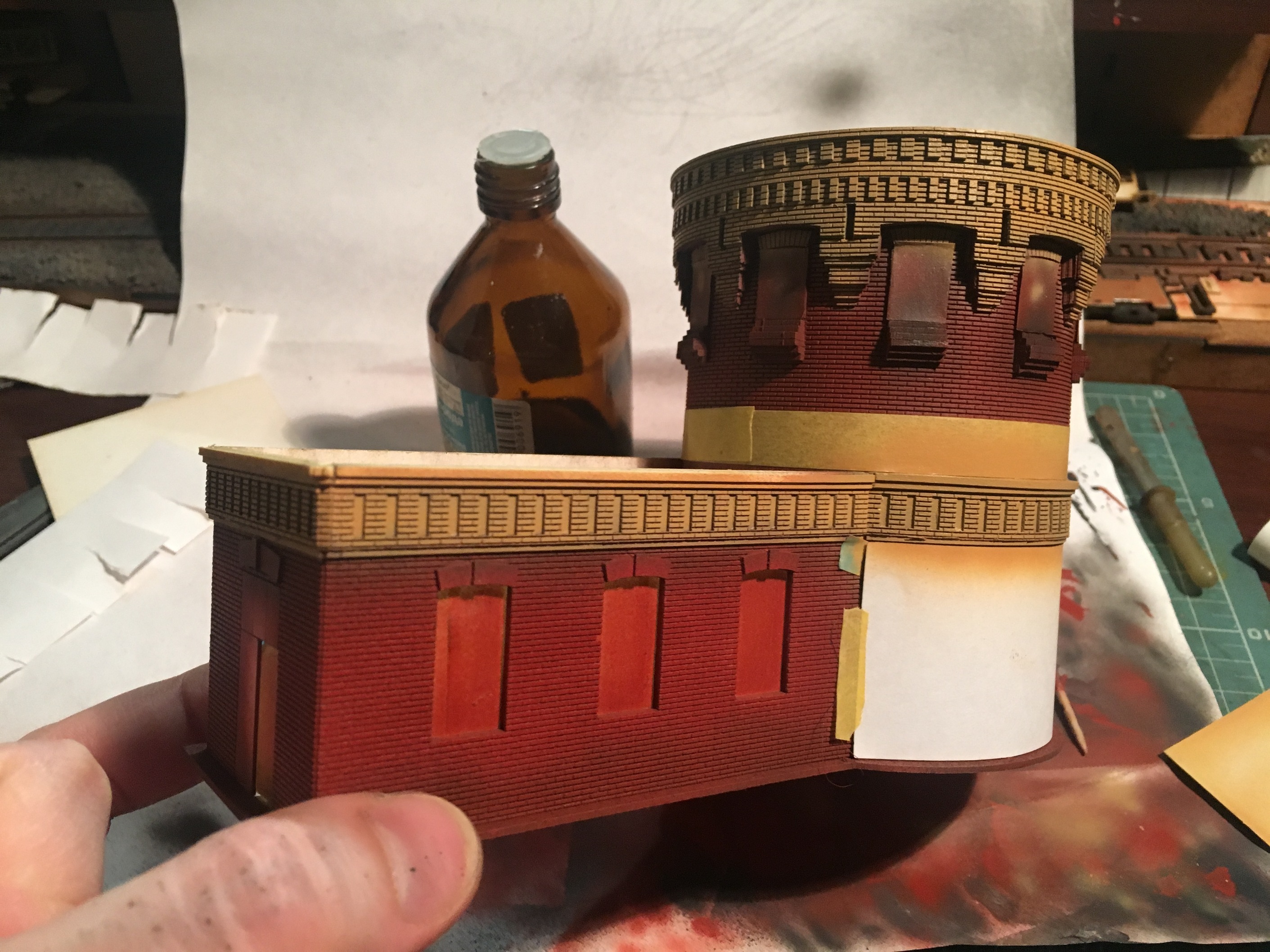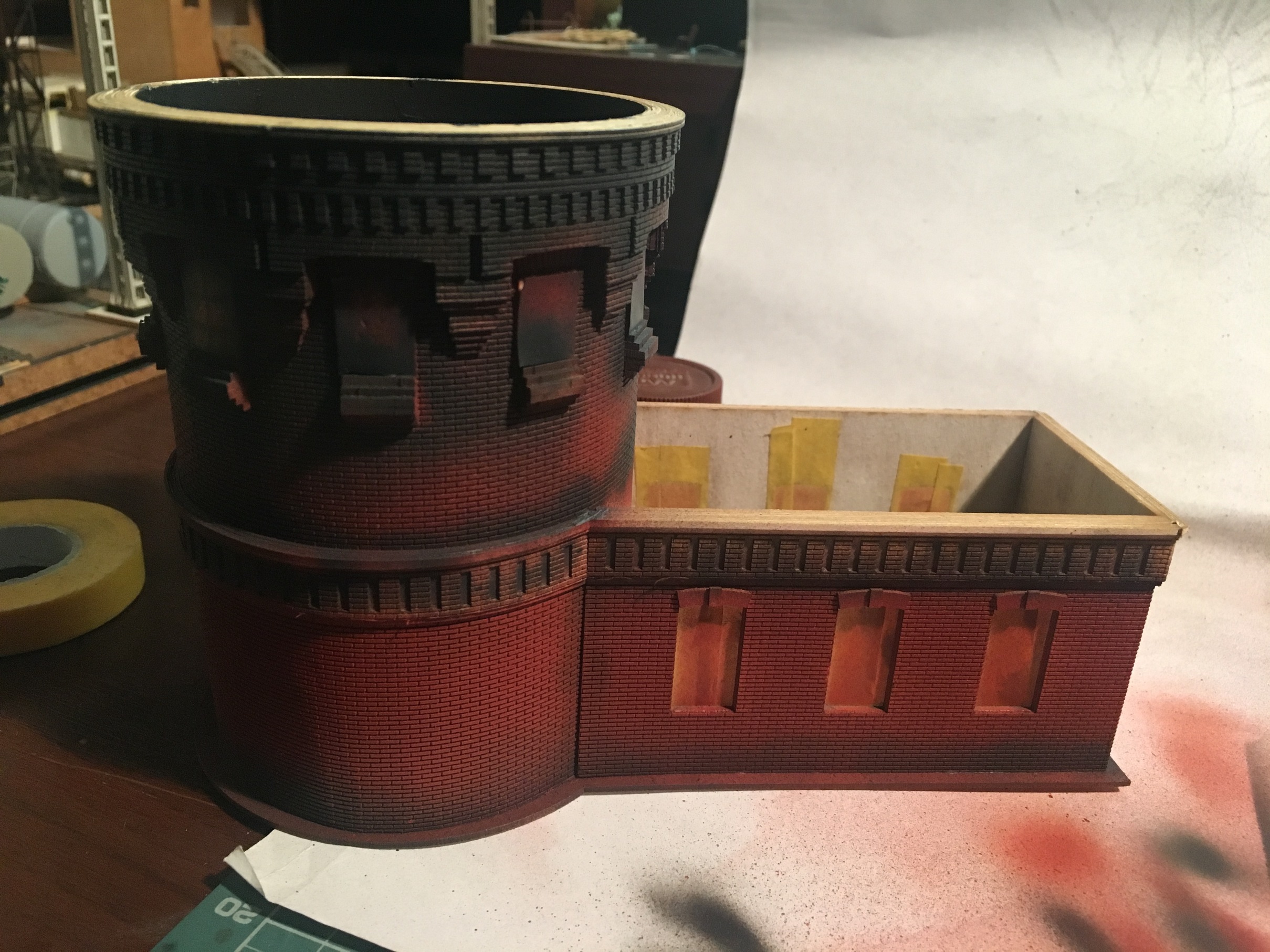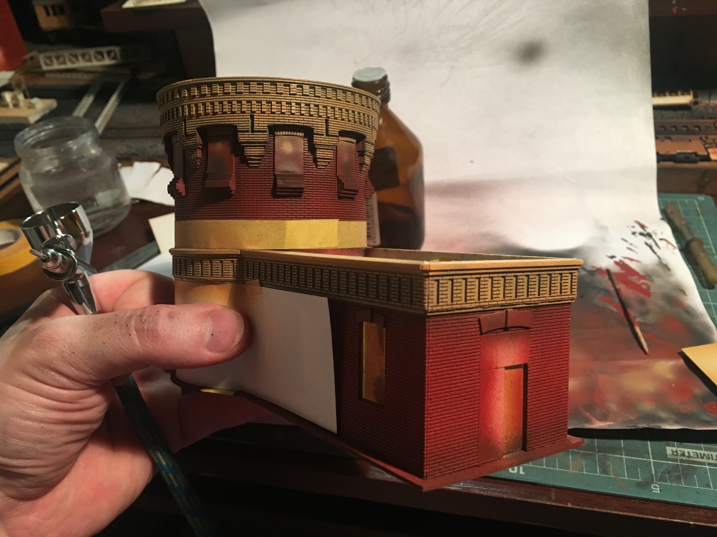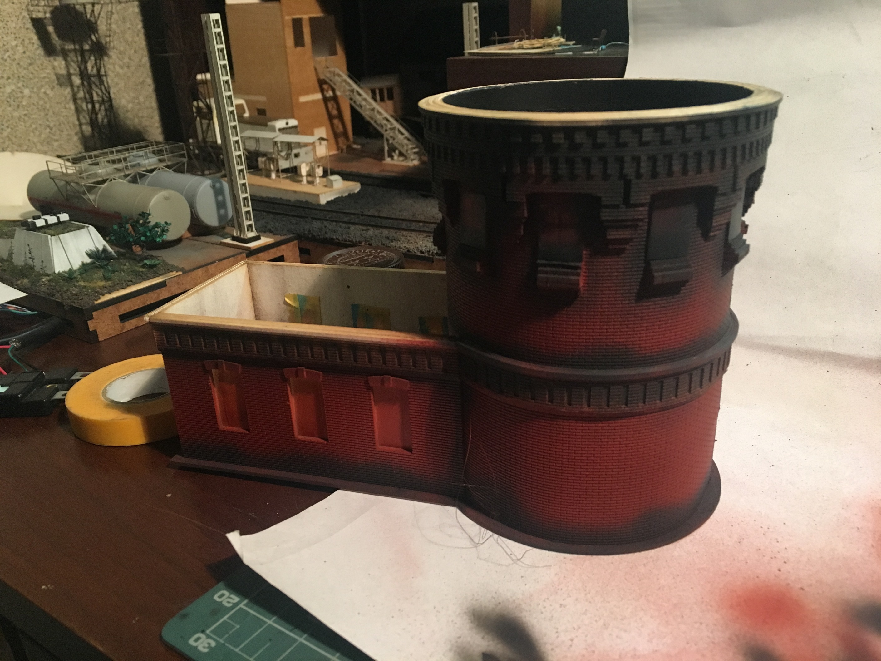Ну а далее, нарисовал и вырезал выкройки под горшки и подставки для них. Нарисовал несколько видов цветов, собрал и стал всё устанавливать. Так же, подготовил стенку и двери на ней, выходящие в саму башню нефтекачки. На фото ниде, вроде бы всёпонятно. Постельное белье делал из пергамента. Угол завернул специально, чтоб просматривалась сетка кровати. Ну скажем отвернул дедушка, чтоб не садиться на чистую постель в рабочей одежде. Подушка из фигурно вырезанного ножницами куска картона и сверху обтяжка на клей, всё тем же пергаментом. Листки на столе нарезал ножиком из офиски и тонким карандашом нарисовал всякие загогулины, имитируя какую-то информацию по работе нефтекачки скажем. Из мебели скорее всего, будет ещё стеллаж с различными запчастями, трубами и вентилями. Благодарю Артёма, что подкинул идею. Обставлять вторую стенку не планирую, так как её не будет видно, даже если вытащить макет и смотреть с другой стороны. ПТОЛ и прочее, просто не дадут что-либо увидеть. Да и не должно там быть ничего особо. Может несколько труб, какой-то компрессор и не более. А то не помещение нефтекачки будет, а какая-то кладовка. Ниже несколько фото процесса и итоговый результат.