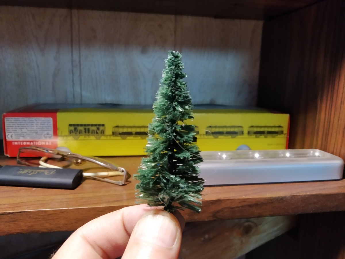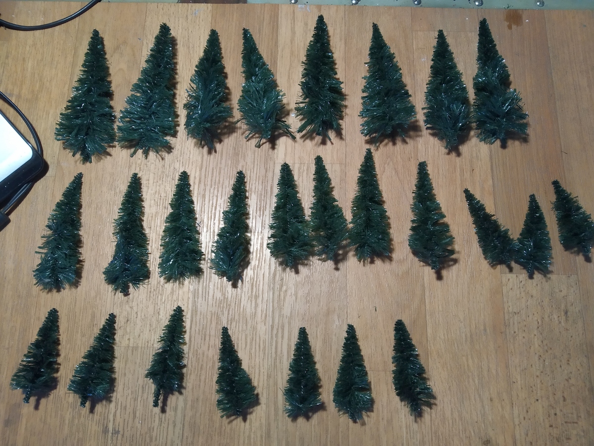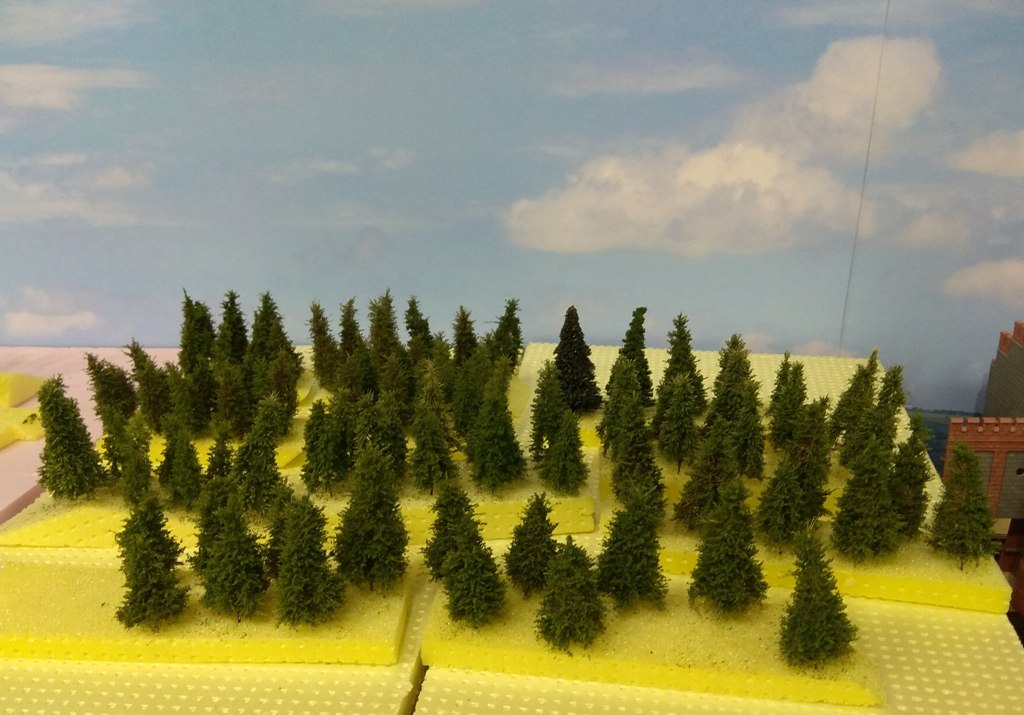 Ёлки, указанные ранее в примерочно-прикидочном варианте, меня не устраивают. Ещё имеются 40 шт. вот таких. Тоже не супер, но третьего не дано... Блеск конечно надо приглушить хотя бы просто матовым лаком. Можно и присыпку попробовать. А пока нарастил стволы деревьям заднего плана и сделал очередную прикидку. Установил 12 шт. Наверное маленьких можно добавить, но это никогда не поздно. У этой возвышенности имеются две совершенно конкретные задачи - организовать выход автодороги из села и визуально разорвать радиусный участок верхнего уровня, поэтому над проработкой мелочёвки на верхушке не особо озадачивался. Полагаю, сподвижники при посещении смогут внести свои штрихи, оставить автограф, так сказать...