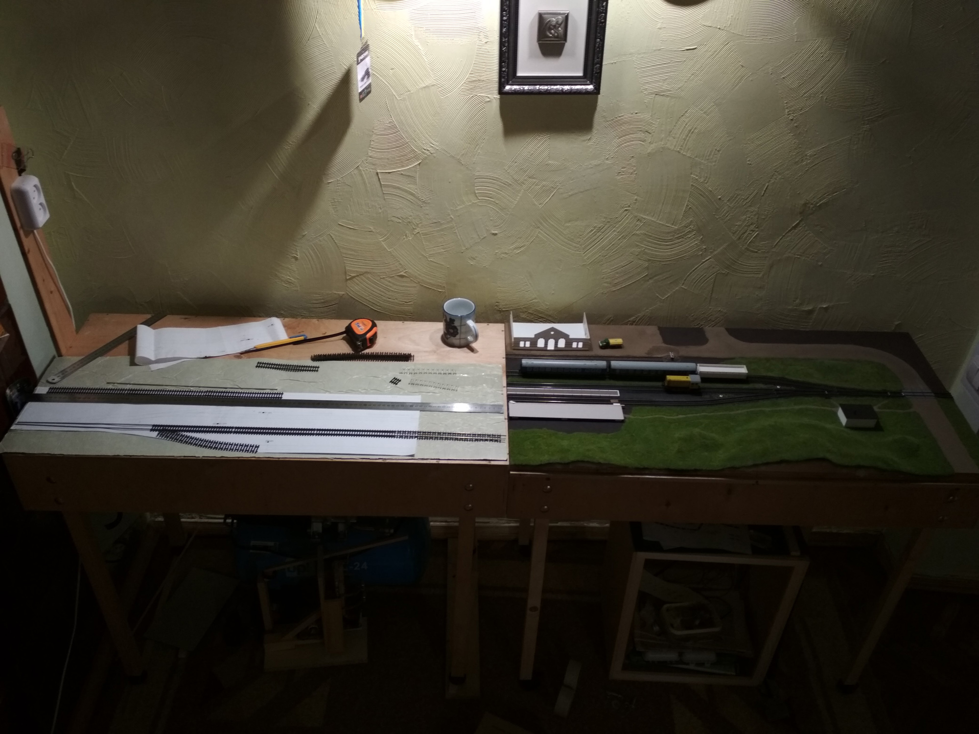 А вчора зрозумів, що пора розширятись, щоб місити хоча б маневри. Модуль скручений давно, ще порізана фанера на поворотні і прямі чекає свої черги в шафі. Тому зістикував оба модулі докупи і, поки жона Катя в святковому настрої після Катерини і передсвятковому до Миколая