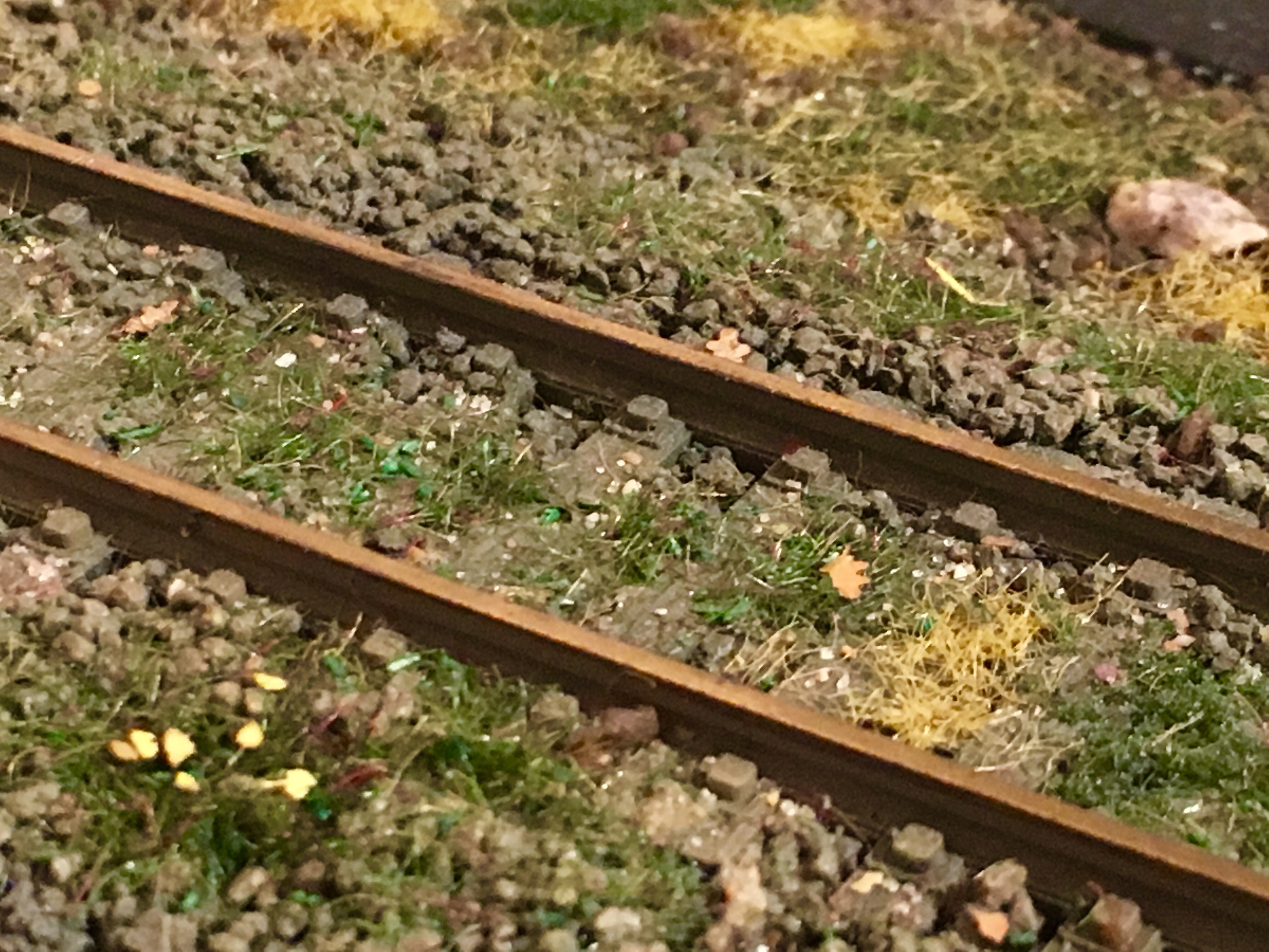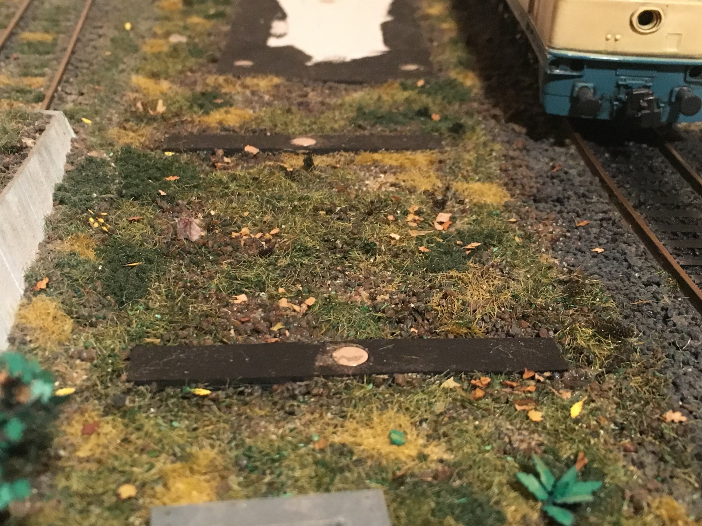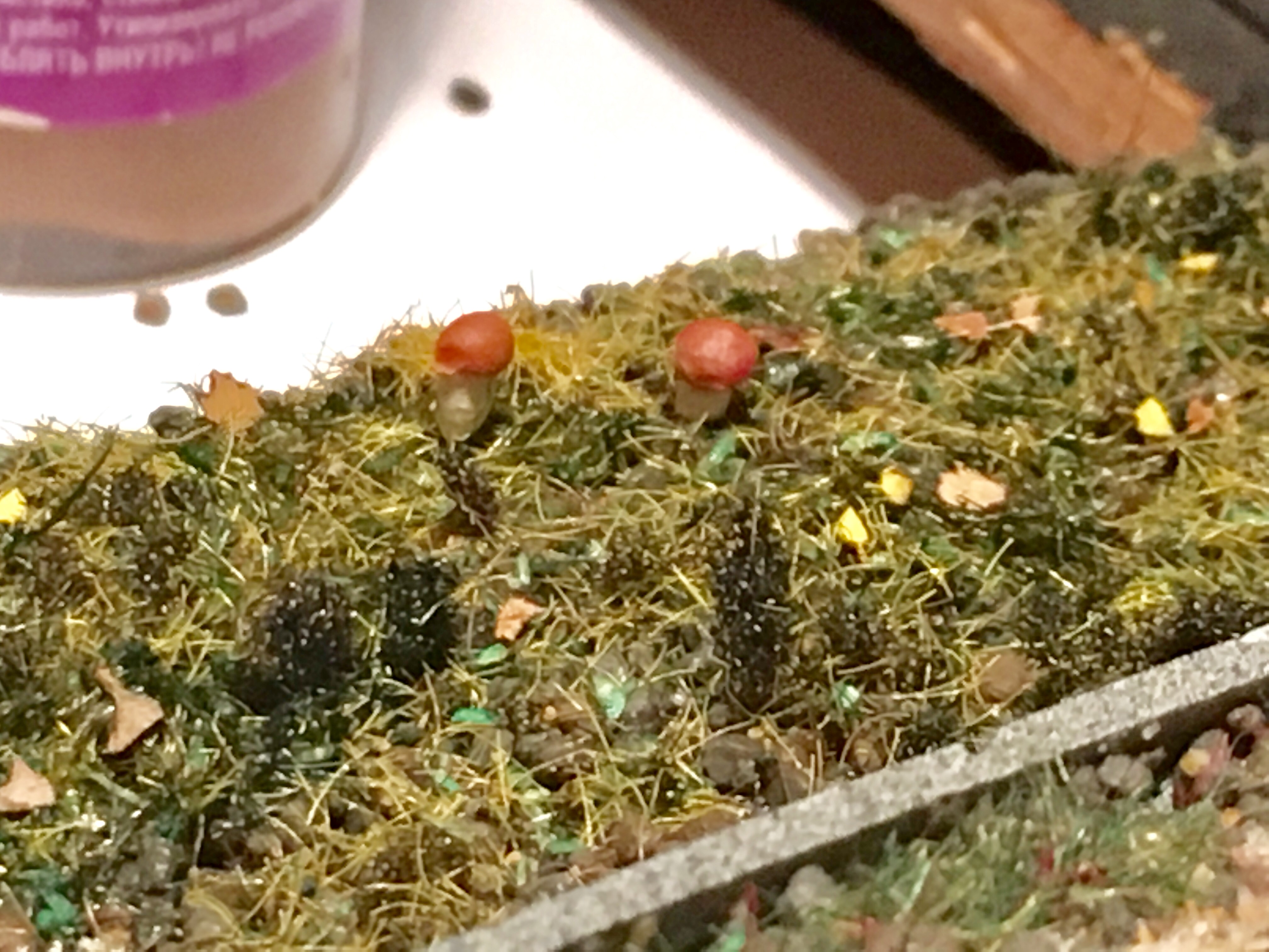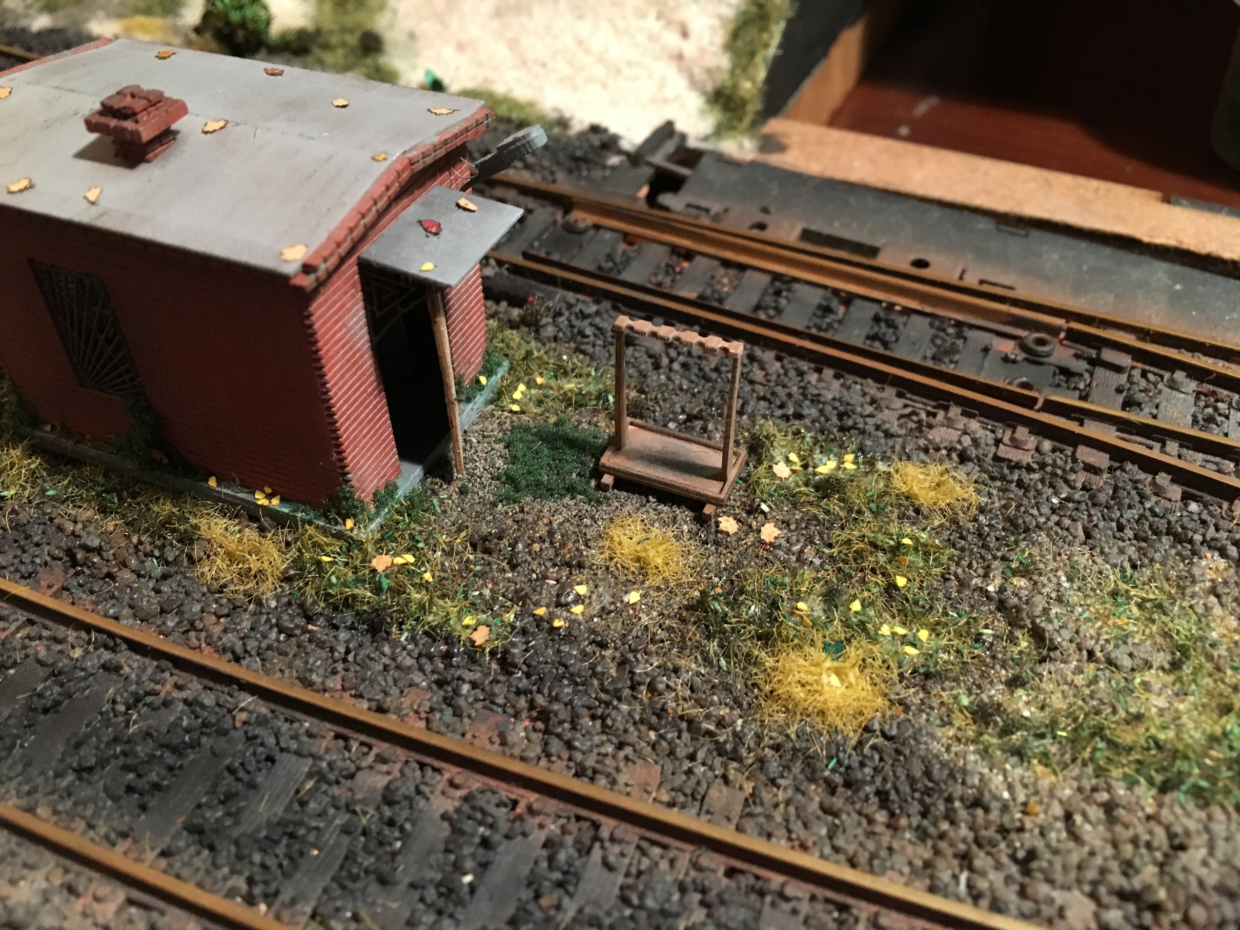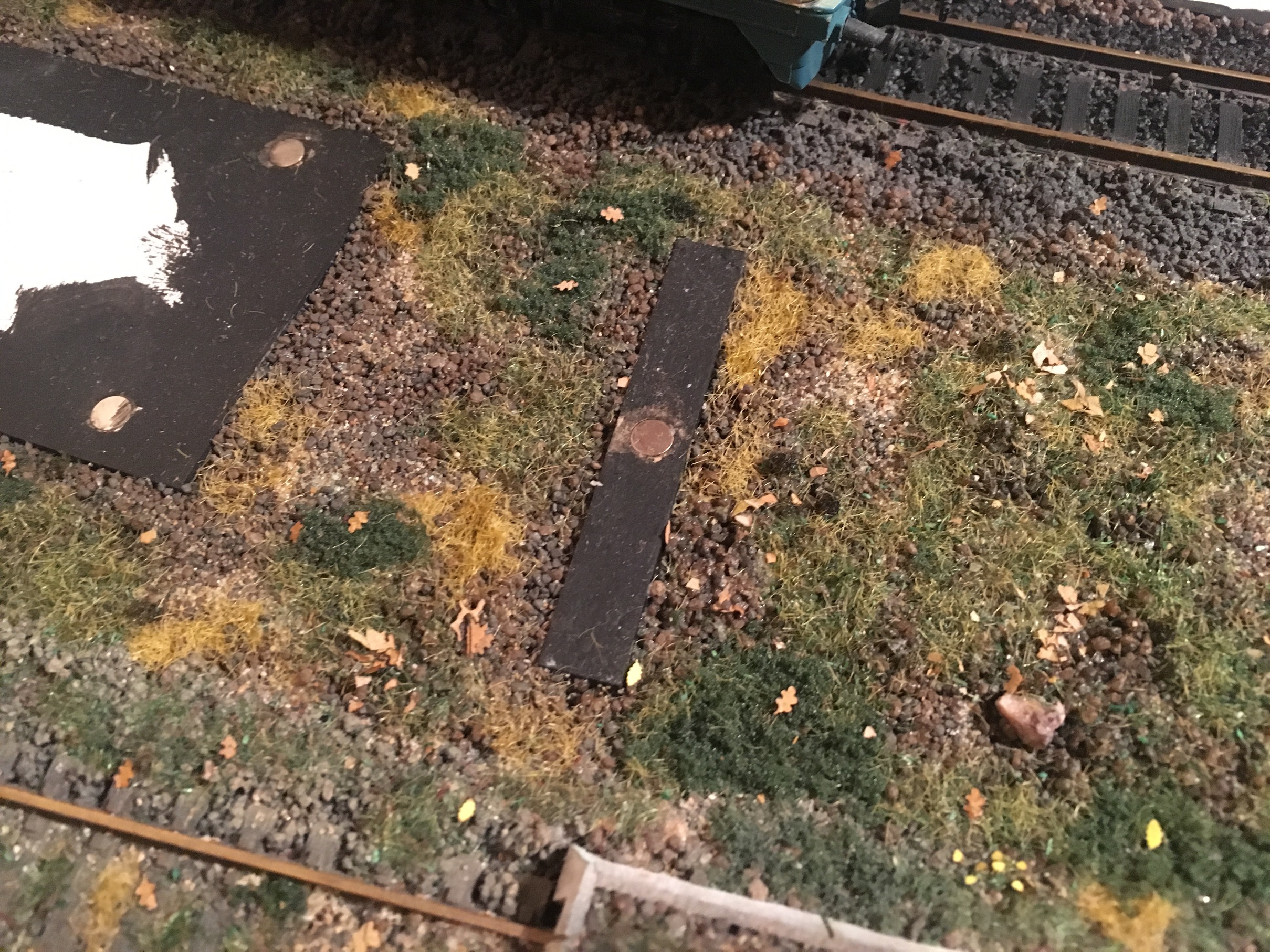 Всем доброе утро. Продолжаем шутить. Подключил и оформил путейку до конца. Оформил пространство вокруг. Не до конца. Даже на этапе написания сообщения, уже существенно больше сделано. Занялся плотно перешейком. Установил тупик, обсыпал основную часть перешейка до конца балластом и оформил. Ради всё той же шутки, на макете появились самодельные грибы. Ну и планомерно, на макете приходит осень.