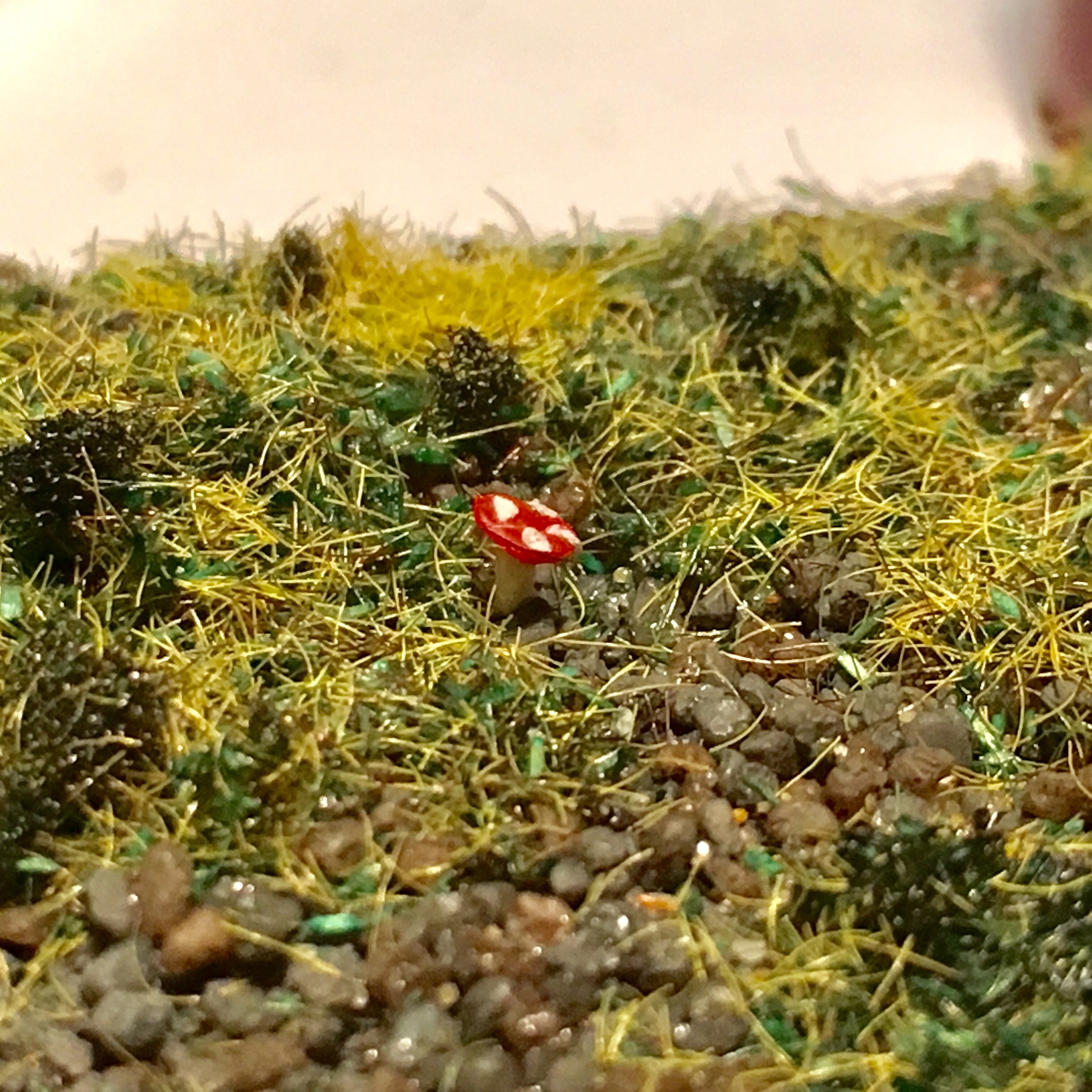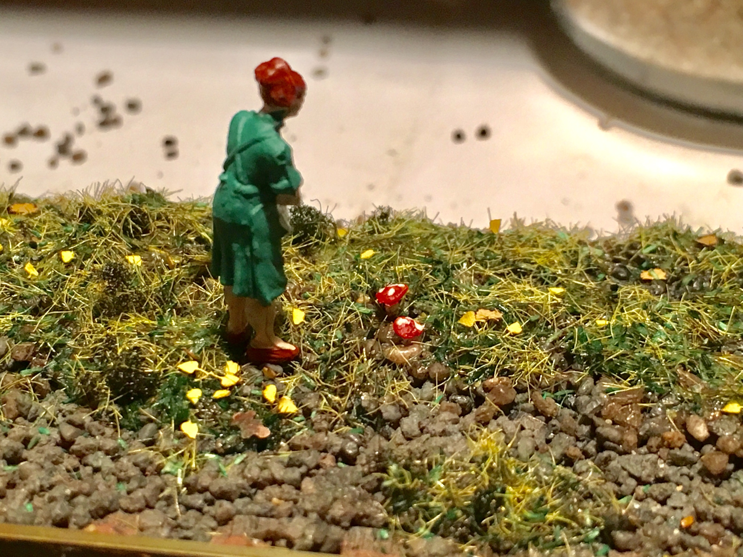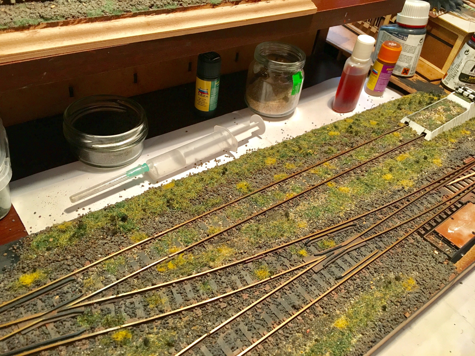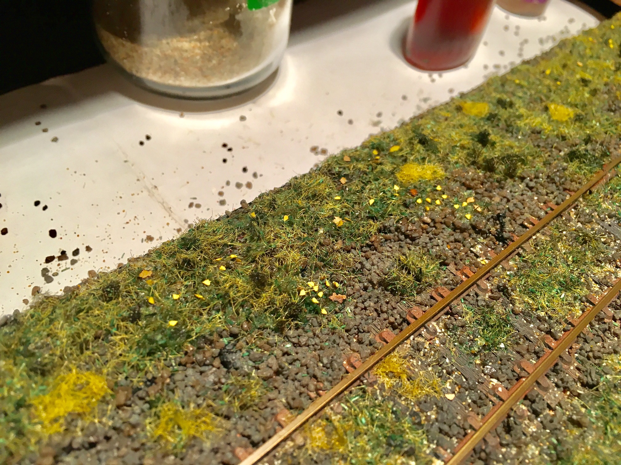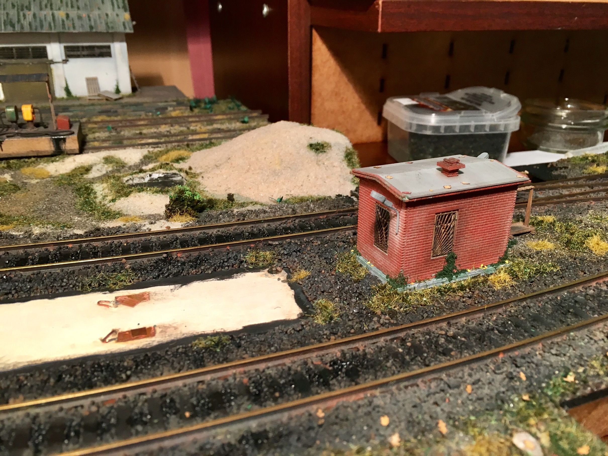 Всем доброе утро. Продолжаем шутить. Подключил и оформил путейку до конца. Оформил пространство вокруг. Не до конца. Даже на этапе написания сообщения, уже существенно больше сделано. Занялся плотно перешейком. Установил тупик, обсыпал основную часть перешейка до конца балластом и оформил. Ради всё той же шутки, на макете появились самодельные грибы. Ну и планомерно, на макете приходит осень.