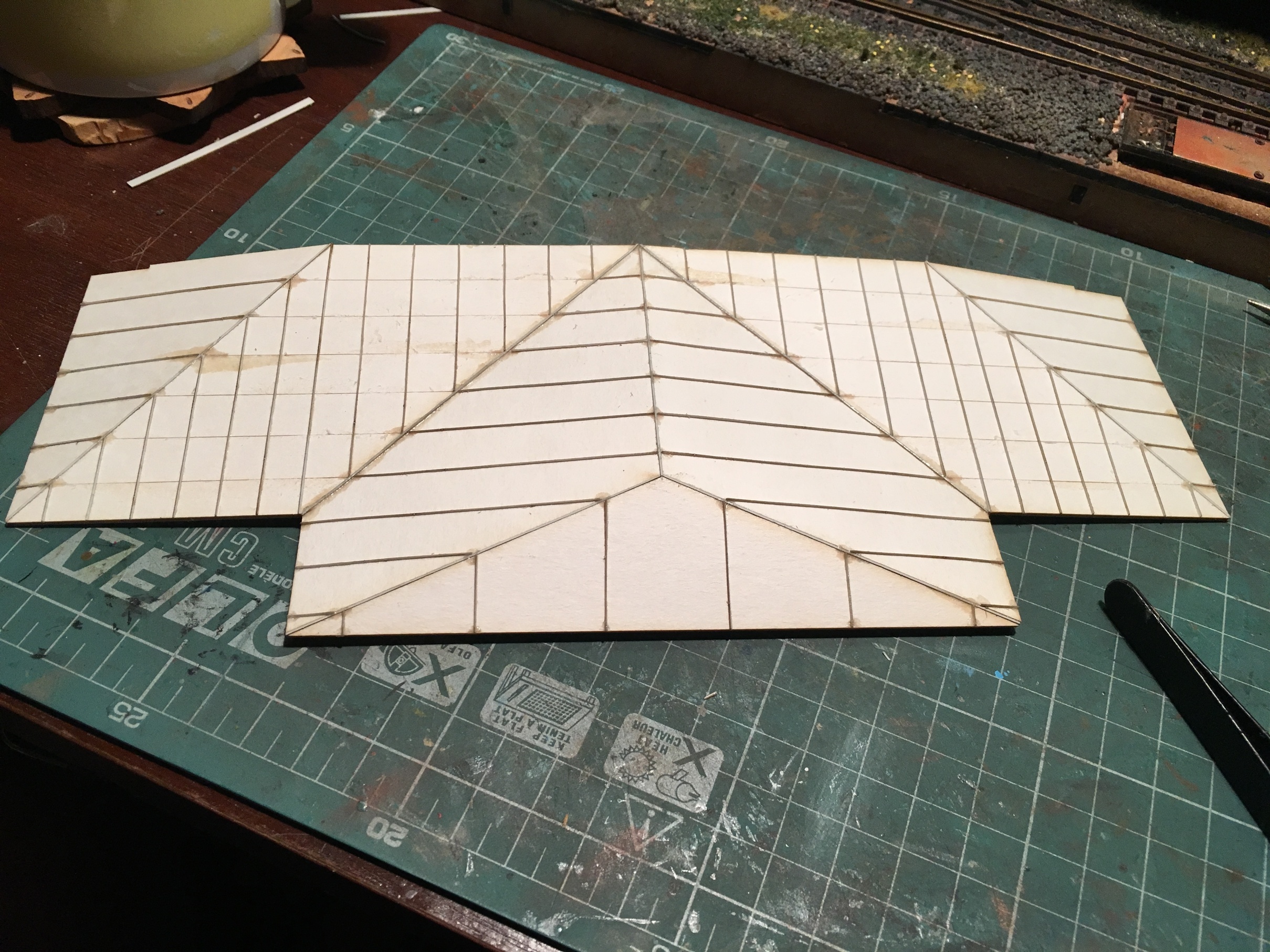 Крыша депо. Фальцы, отмеченные красным надо бы развернуть на 90 градусов, чтобы стекала «вода».