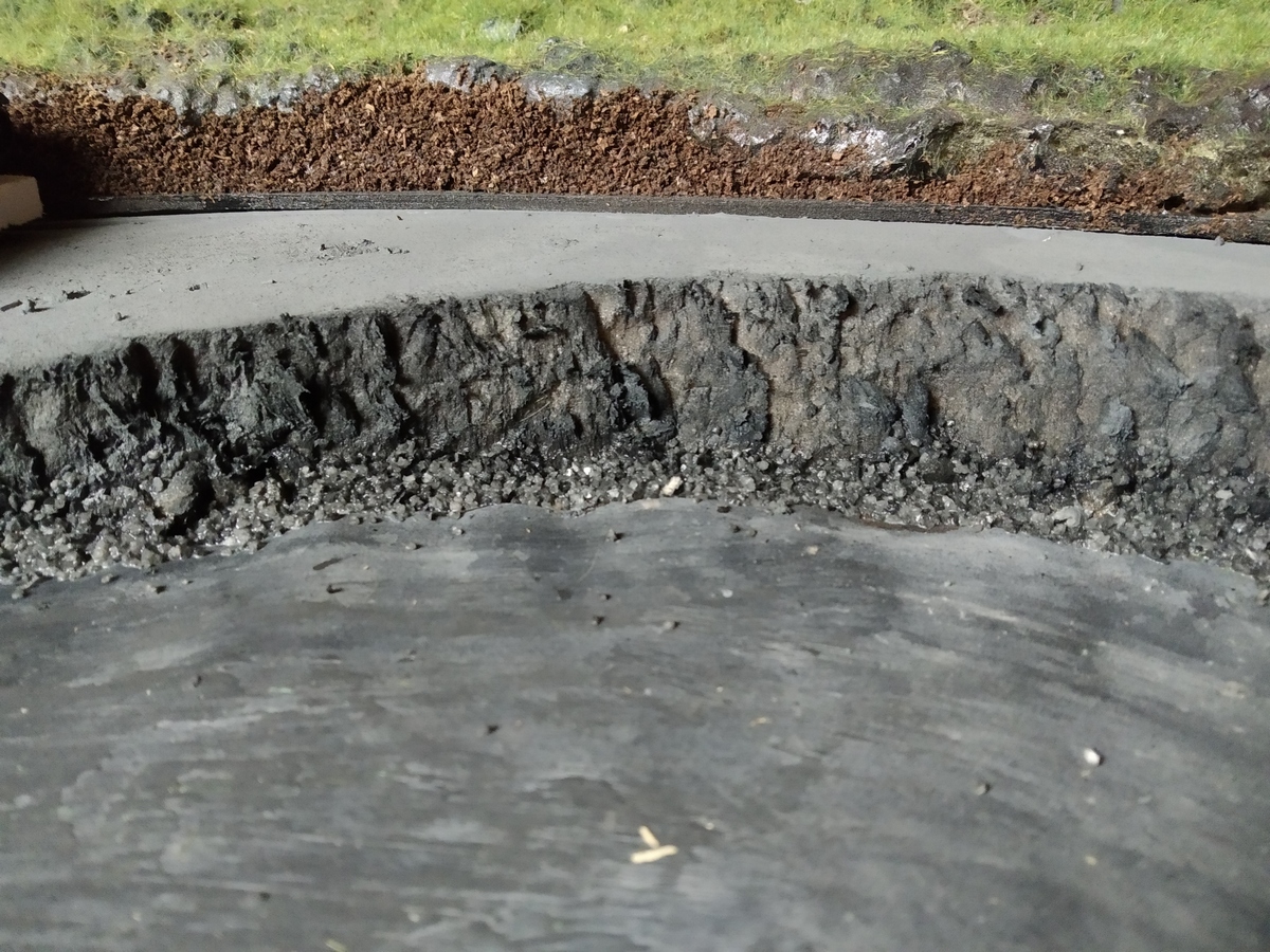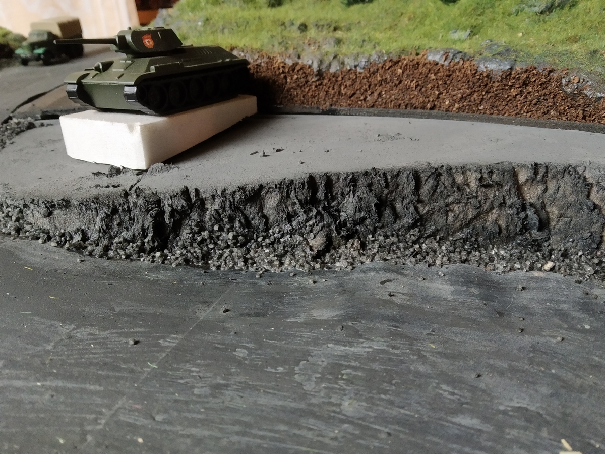 С цветом окончательно ещё не определился. Преобладает тёмный потому, что подразумевается настил из деревянных шпал. Расшивка сделана исходя из размера шпал под этими переездами, а они у меня 30,5 мм в длину и 3 мм в ширину.