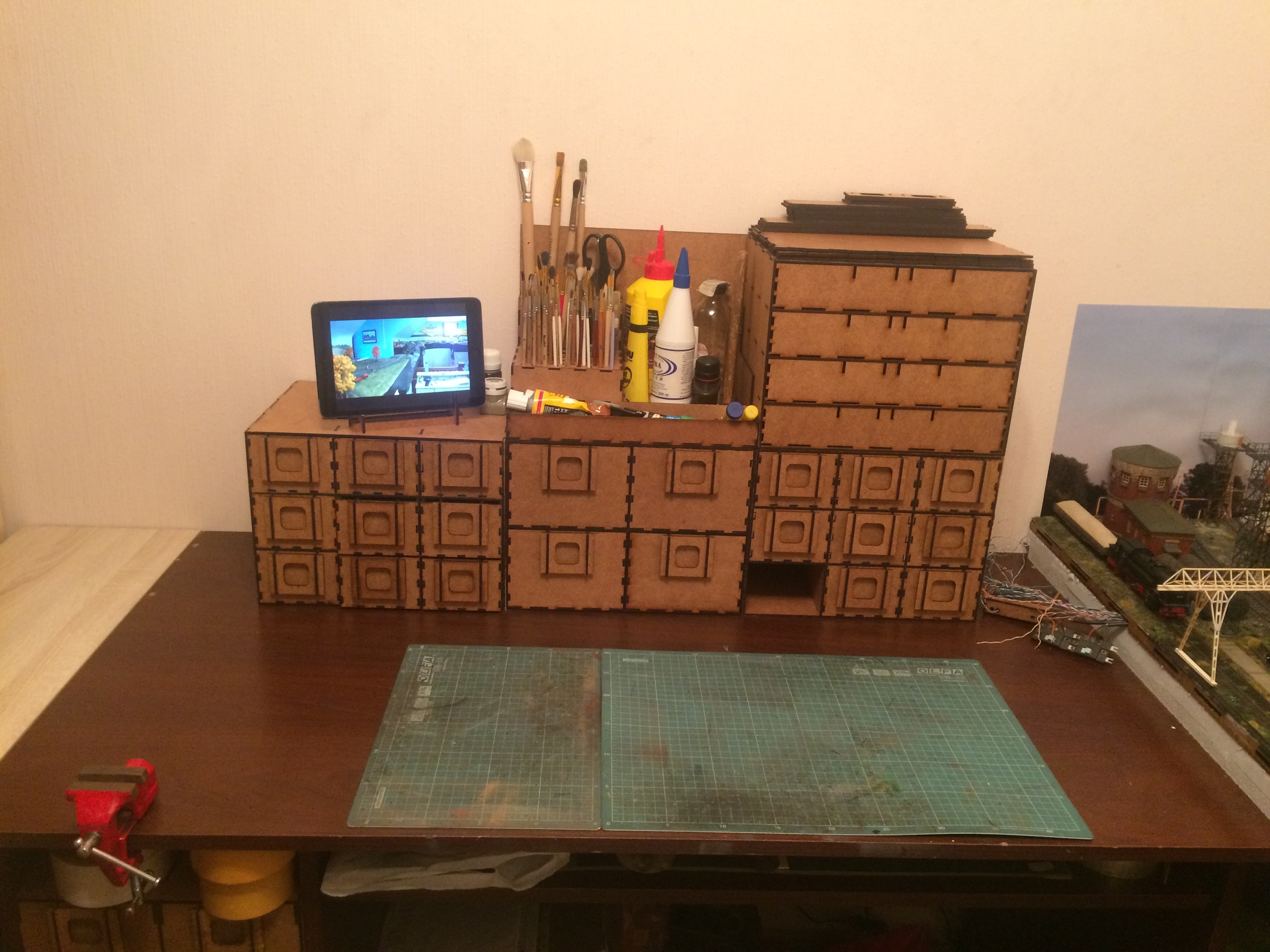 И наконец, принялся за обустройство рабочего пространства. Сформировалась наконец общая концепция обустройства моей коморки. Начал с оборудования стола. В помойке, которая образовалась после переезда и складирования всего моего добра, муза категорически отказывалась приходить, а руки опускались. Модульный органайзер в итоге вырисовывается. Будет ещё левый блок сверху. Он пока в процессе рисования. Не стал делать от края до края. Входило не три, а четыре секции. Но тогда, селва и справа, органайзер закрывал бы собой пространство. То есть не было бы хорошо видно часть макета и левую столешницу. Этого я никак не мог допустить, потому ограничился тремя секциями. Ящиков тьма, рассчитаны на то, чтоб внутри можно было даже локомотивы и вагоны хранить при необходимости. В довесок к органайзеру, те ящики, что у меня уже есть и в итоге, получилось более чем достаточно мест, где я могу сложить модели, краски, мелочь и так далее. Коврики оставлю пока эти, в перспективе, застелю стол парой А2 ковриков.