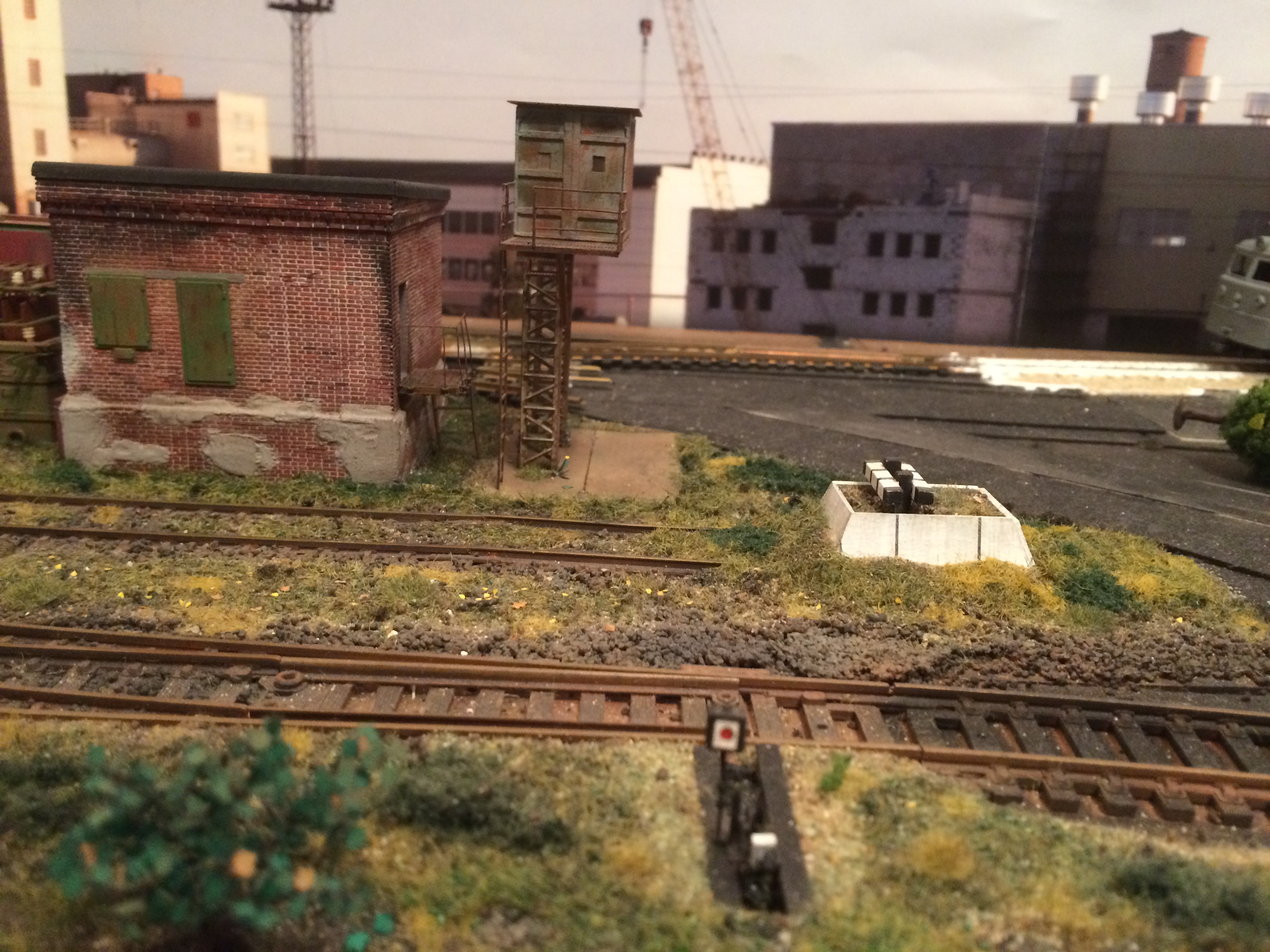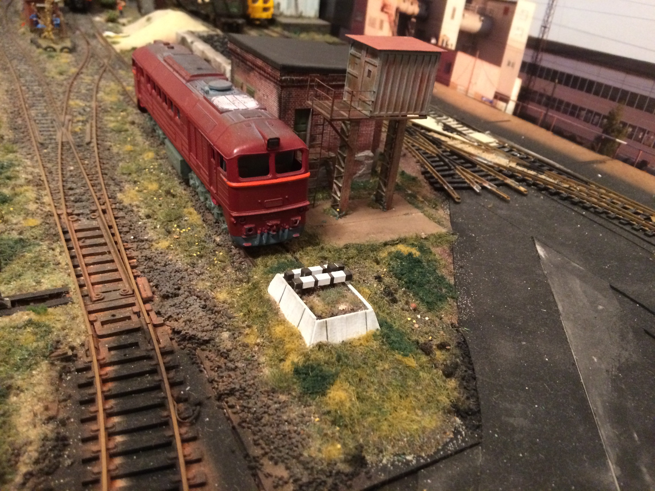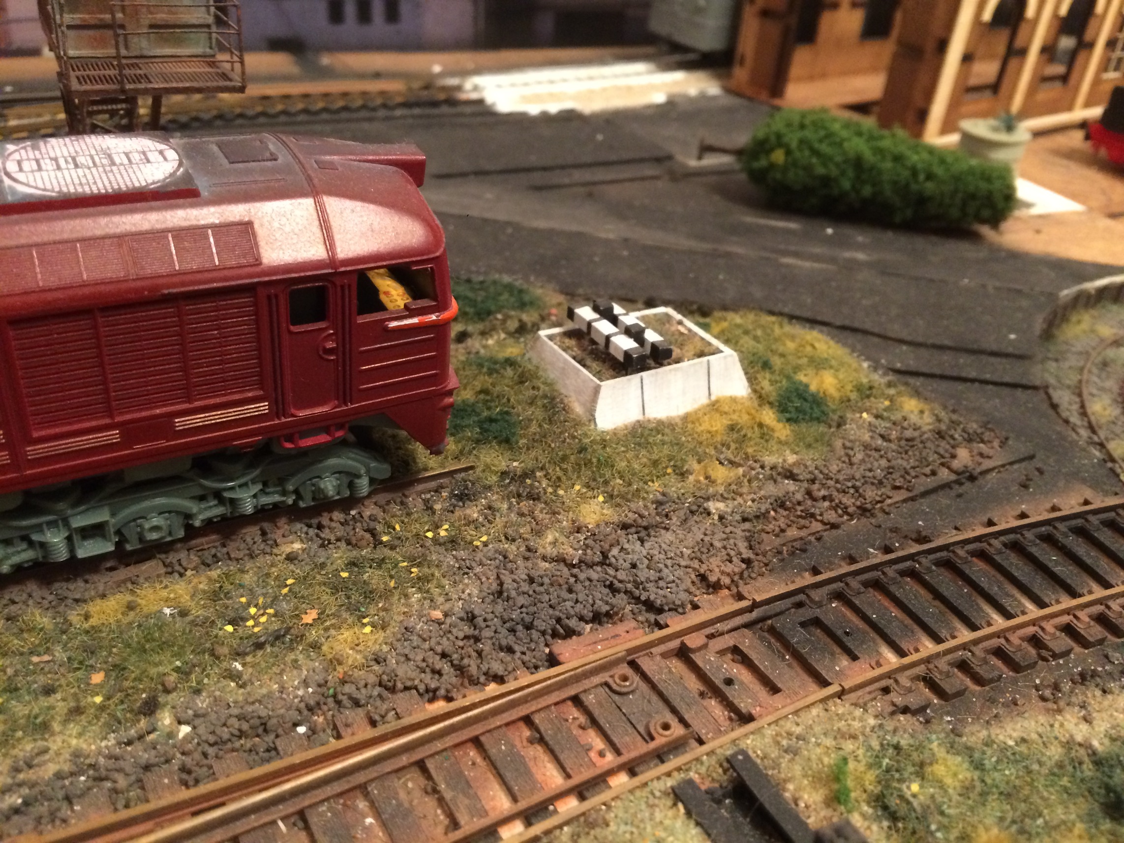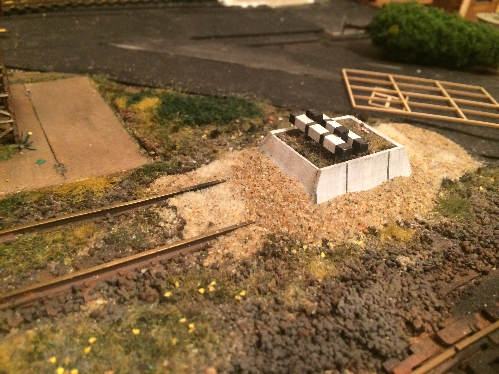 Оформляя реостат, смахнул пыль с одного из тупиков, которые снял ранее. Срезал верхнюю часть, сделал под ней насыпь. Руководствовался фотографией из депо Петрозаводск. Видна насыпь тупика и сверху из шпал, или просто из досок ограничительные указатели. Мне подумалось, что с призмой будет сочнее. Ещё не оформлял и не тонировал вокруг, так как сохло на момент фотографирования. На мой взгляд, вышло интересно и один из тупиков снял не совсем аккуратно, он был под выброс. А так в дело пошёл.