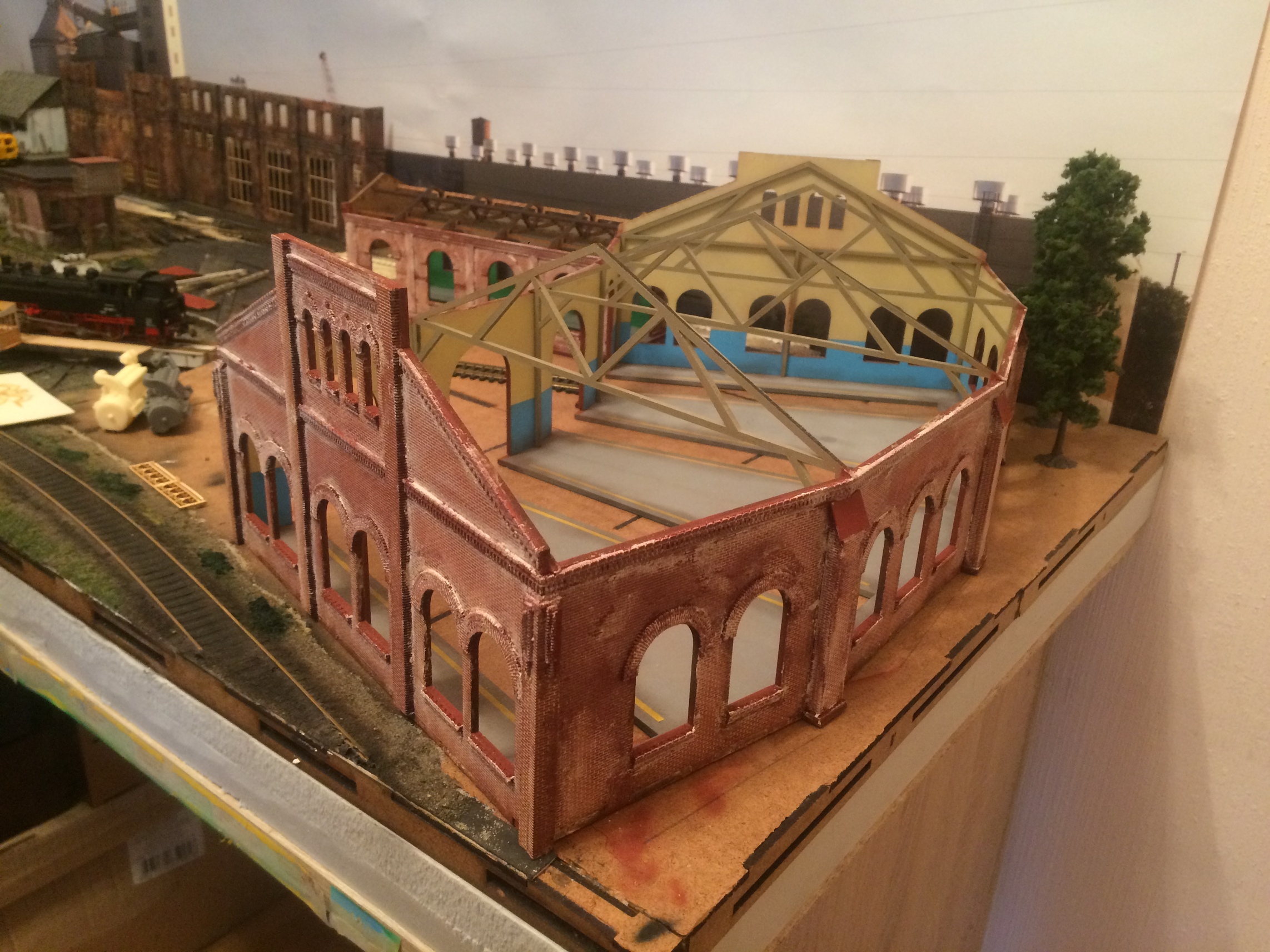 Поступило предложение, убрать пакгауз. Надо собраться с силами и спилить его. Жаль, привык уже к нему. Но уже не вписывается в концепцию макета. Думал, что постройка фасада в виде мастерских, а не в виде депо, как-то сгладят неувязку. Но что-то шло не так :-) пакгауз продолжает выбиваться из общей картины увы.