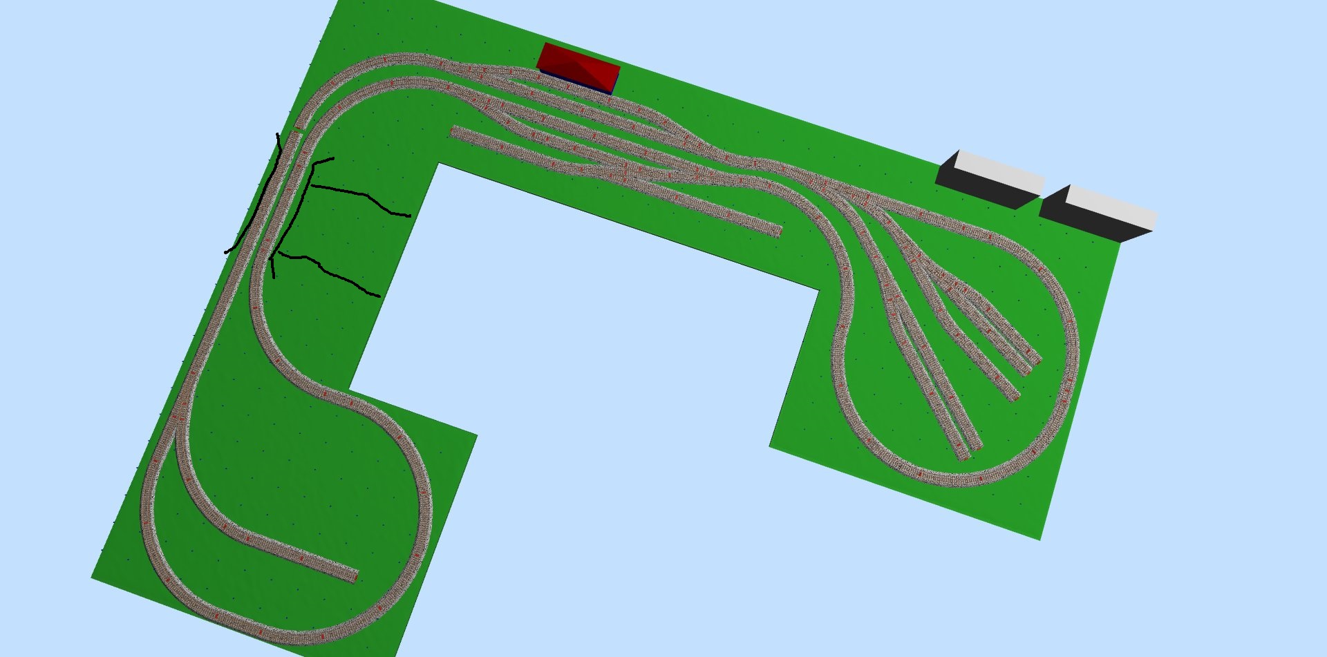 С мостом хороший вариант! Я бы в углу где поворот еще поставил гору с туннелем. Сразу после выхода из тоннеля поезд заходит на мост. Получится небольшой перегон и он будет визуально отделен от станции. А там где второй разворот можно сделать небольшой разъезд с ответвлением в промзону. На СЖД не бывает съезд посреди перегона, только в пределах станции или разъезда.