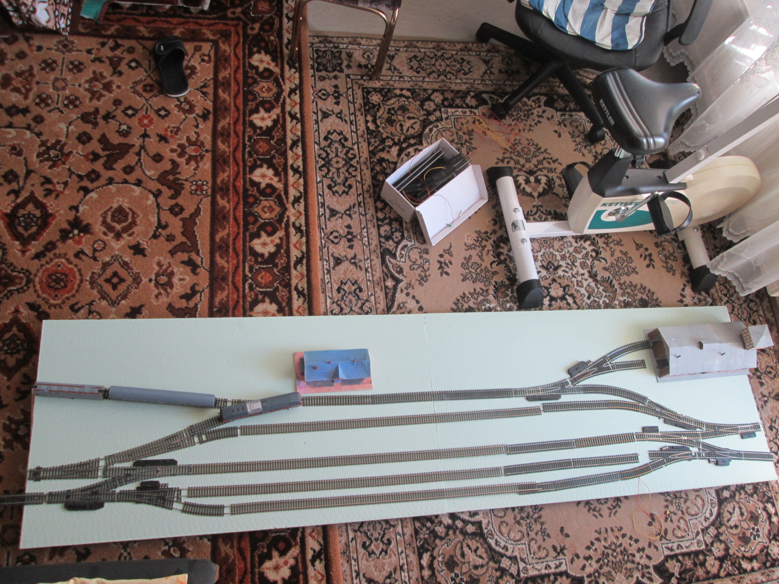 для модульного может быть вариации: обычного овала размером 340см*120 или П-образного длиной 340см и шириной 180 без опускания под вокзал, а оставить тот же уровень, но добавить еще пару плат с какими-нибудь строениями. конечно можно и опускать, но не нравится уже вид поворотной части, особенно еасли использовать их для закольцовки