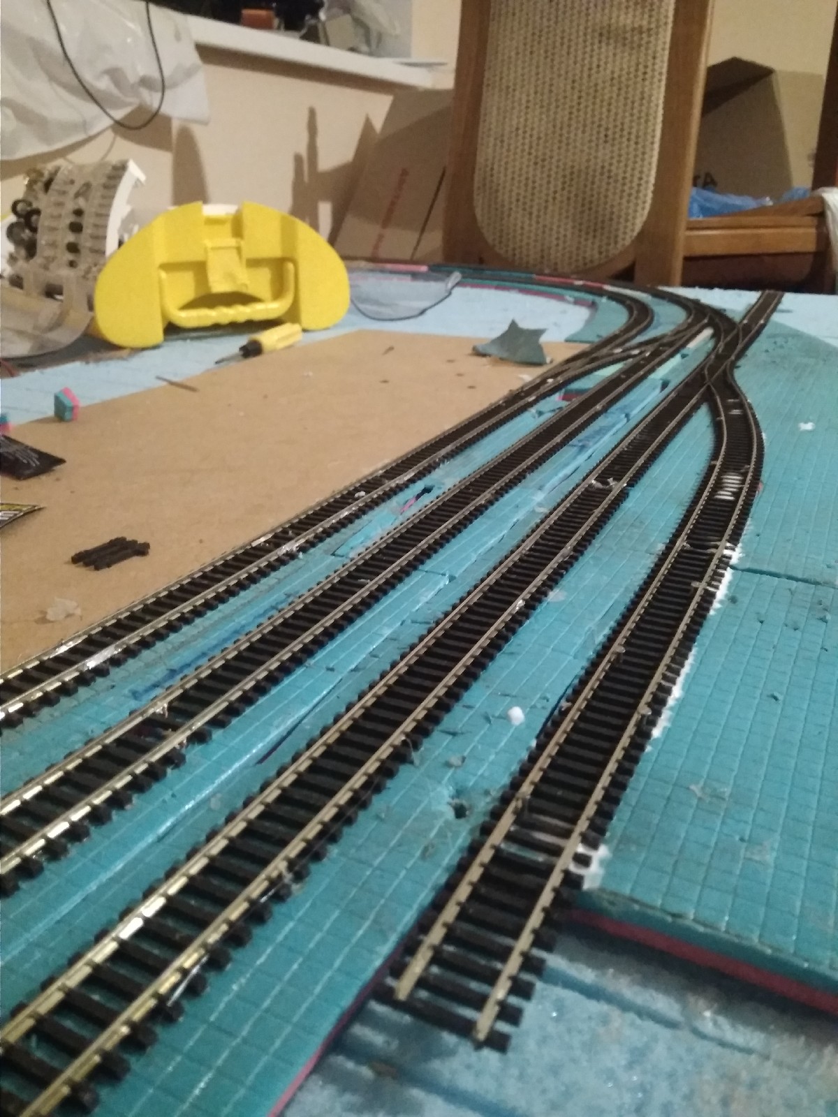 Трохи просуваємось. Доштукував спереду 12см підмакетника, проклав третю колію та тупикову четверту. Справа буде вихід за межі макету через тунельний портал.