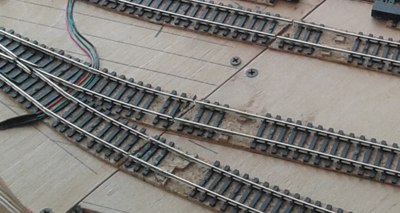 Конечно деление на куски добавило порцию геморроя при укладке путевого: ввиду развитой путевой схемы (3 станции, 2 перегона) на трёх стыках между четырьмя модулями "разрезаются" 50 (!) путей...