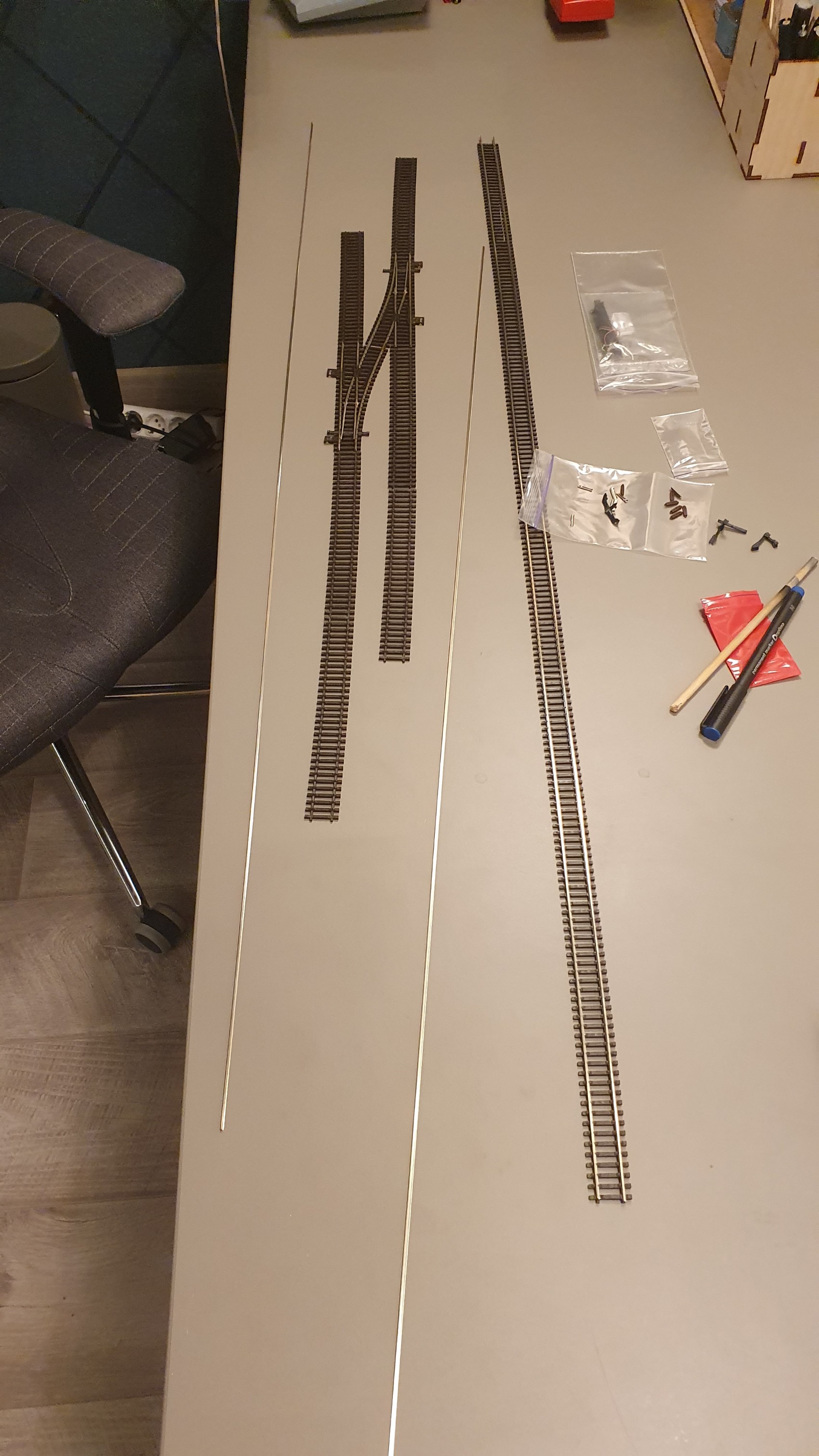 Пока нет места для макета, а коллекция по немногу пополняяется, решил устроить не большой участок, для настройки моделей, ну и просто в свое удовольствие катать, туда назад. длинна 1300, ширина +/- 120мм.