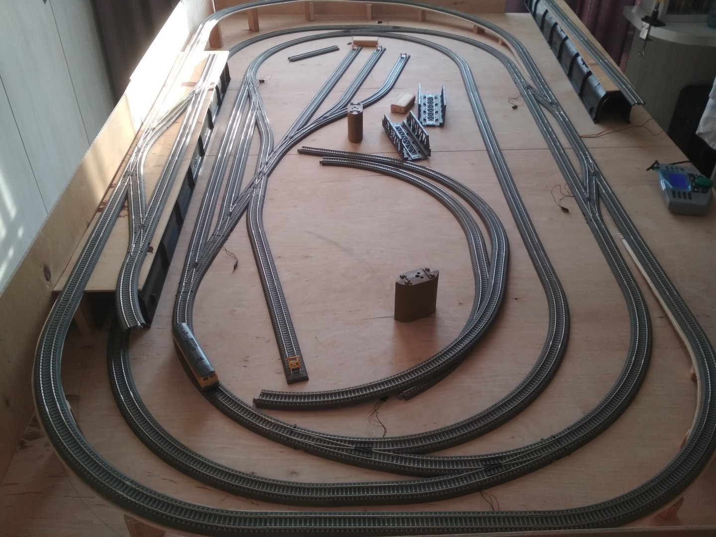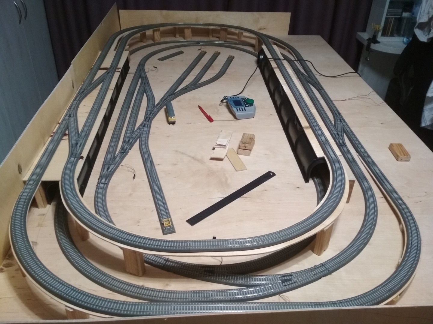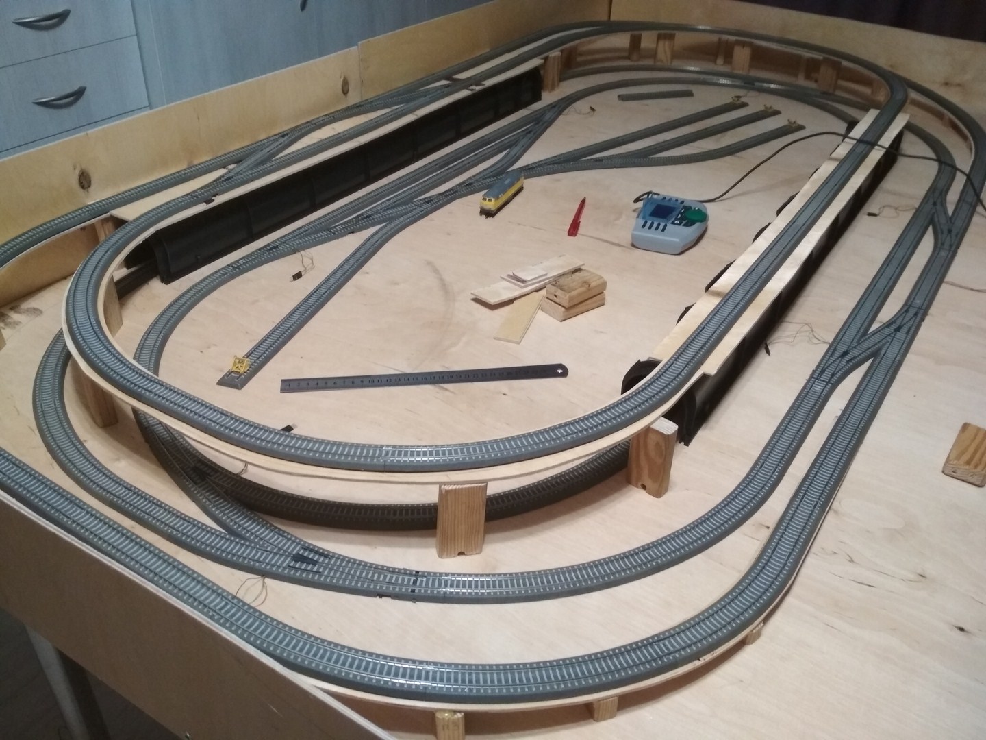 Таким образом был куплен и распилен толстый лист фанеры, куплены 6 ножек. Из этого был собран стол 200х120, который был покрыт бильярдным сукном и на нем был выложен стартовый набор и пара стандартных наборов путевого от Тиллига. Не считая мелких проблем, успех был ошеломительным. Не останавливаясь на достигнутом и принимая во внимание наблюдения описанные выше я пришел к текущей схеме. Купил тонкой фанеры, вырезал электролобзиком бортики и подставки под редьсы 2-го уровня, купил в эпицентре 2 туннеля.
