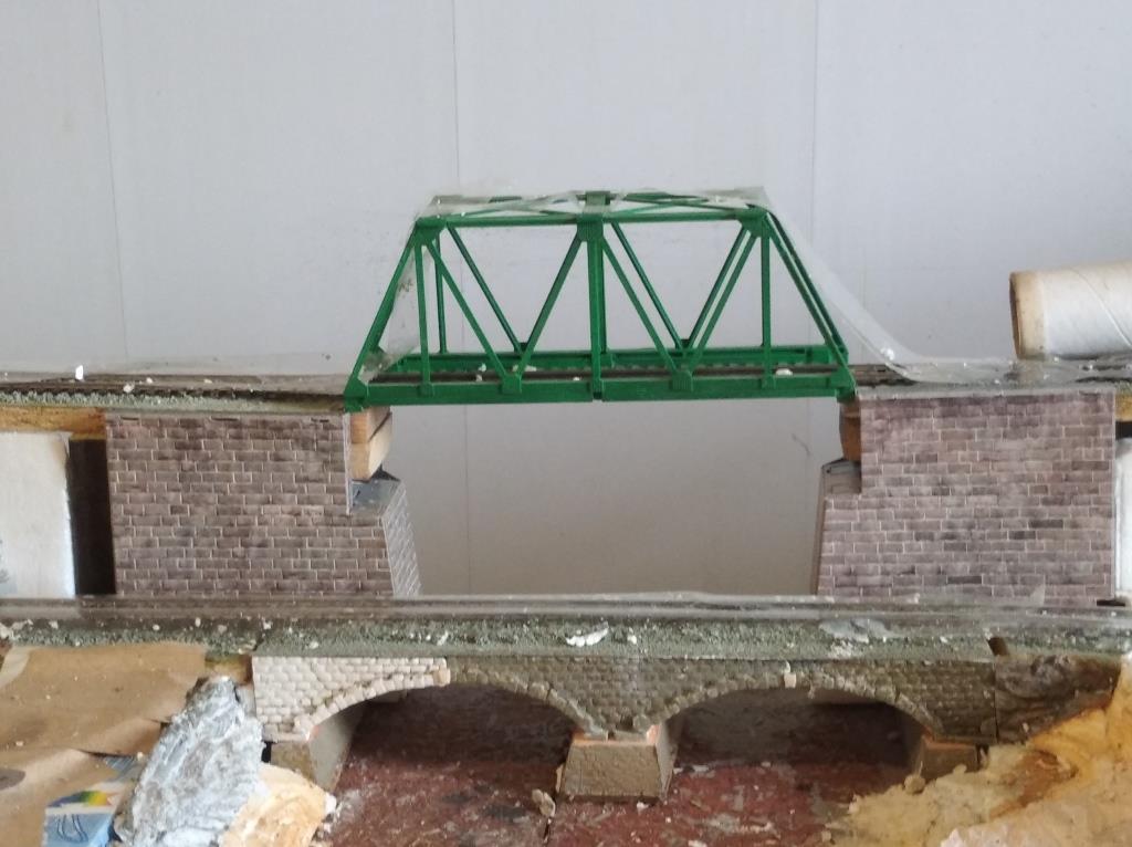 Каркас подмакетника заполнил 50-ти мм пенопластом как основу для будущего ландшафта. С целью облегчения конструкции пустил в ход всё, что под руки попалось: всякие коробки, гофрокартон, обрезки пенопласта. Клеил на ПВА и клей типа Дракон. Для придания рельефа сделал терморезак из картофелечистки, питание 6 V от автомобильного зарядного устройства. Причём, резать им горы упражнялся «на кошках», создавая горную деревушку. Установил мосты, один - от Bachman, другой самопал из пенопласта со стенами из гипса, отлитого по матрице из силиконовой формы.