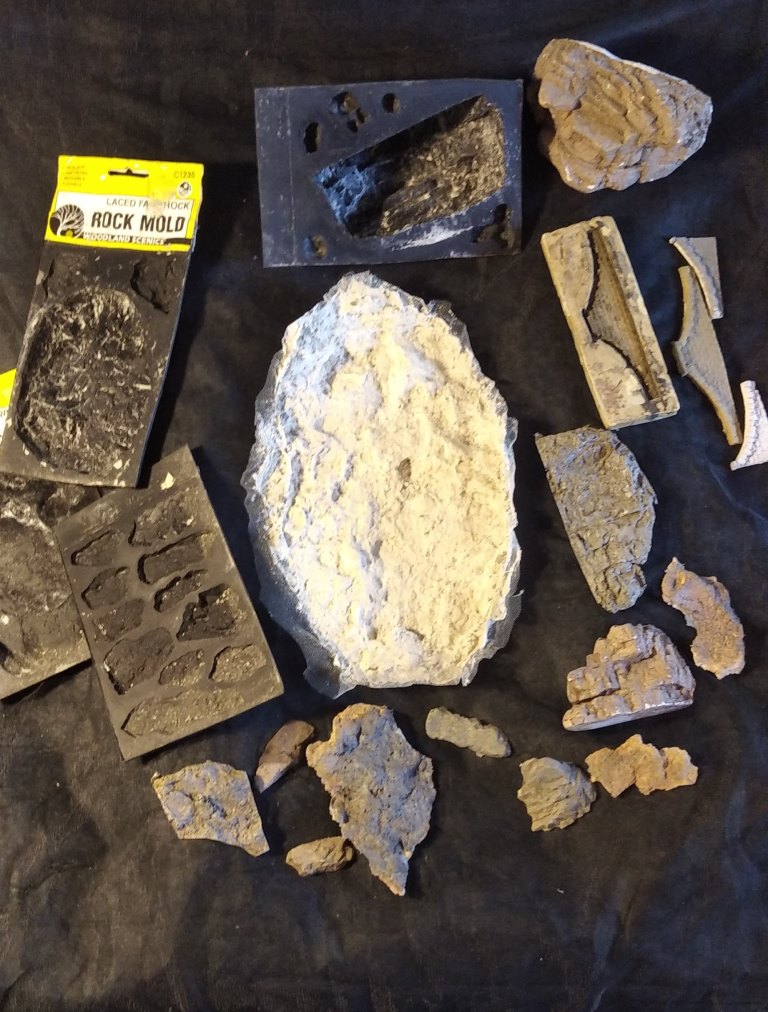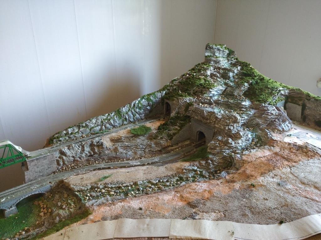 Для постройки ландшафта использовал заливочные формы WoodLand Scenics и свою (DIY): из силикона и природного камня (с личного сада). Из алебастра отлил лишь небольшие фрагменты скал, всё остальное сделал из папье-маше. При этом сначала обмазывал формы сметаной из ПВА и молотого мела, а сверху доклеивал слои бумагой (всего 6-7 слоев). Кстати, в сметану добавлял или черную, или коричневый пигменты, чтобы меньше красить. После высыхания только тонировал и выветрил. Большой плюс таких форм в том, что их можно легко резать, формировать любую кривизну, клеить как душе угодно.