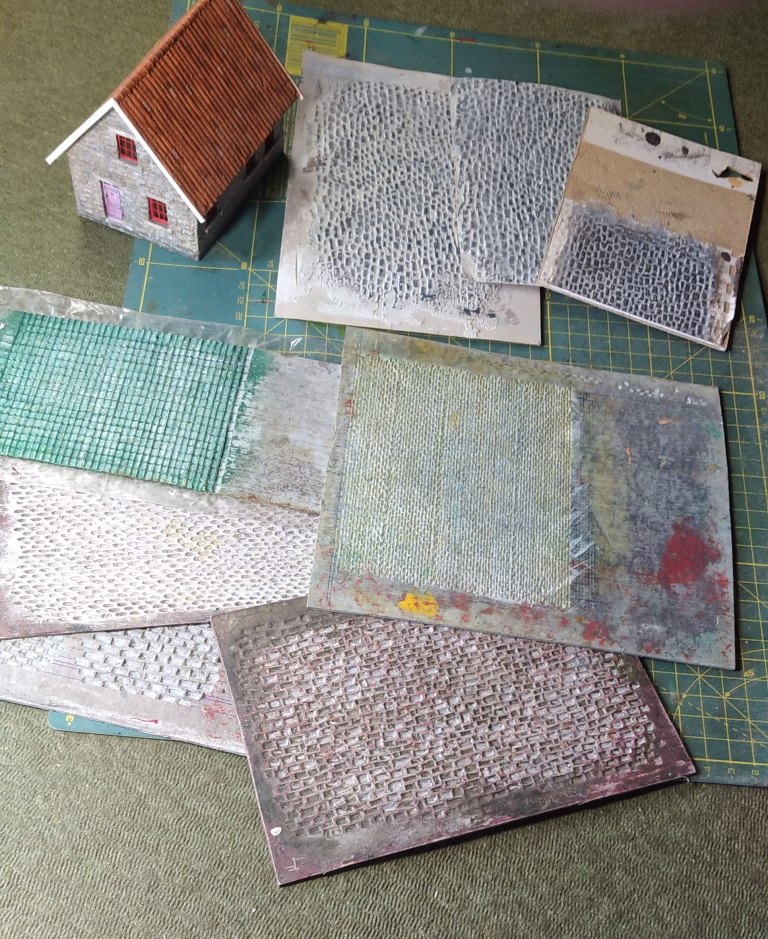 Для подпорных стен (как и для домиков) резал клише из линолеума и печатал по типу линогравюры, а именно: наносил ту же сметану на картон (только погуще и иногда с алебастром), форму обтягивал пищевой плёнкой и прикатывал подготовленный картон к форме или валиком, или столовой ложкой (любимый инструмент). Клал под пресс на полчаса, потом аккуратненько снимал плёнку с заготовки. Сушил. Тонировал. Резал. Клеил.