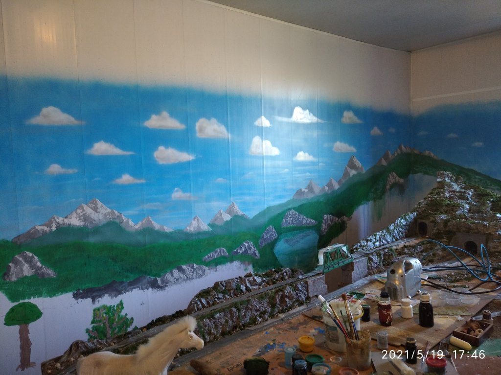 Пару весенних месяцев я мазал и мазал, стирал и снова мазал. Говорят, если пьянка мешает работе, бросай работу. Так и я бросил свои опыты. Задник получился в буквальном смысле слова. Что бы я переделал, так это озеро, скорее всего, вырежу из какого-нибудь постера и наклею с выгибоном. А если будет недостаточно голубым, придется перекрасить мост (слишком сливается с фоном)