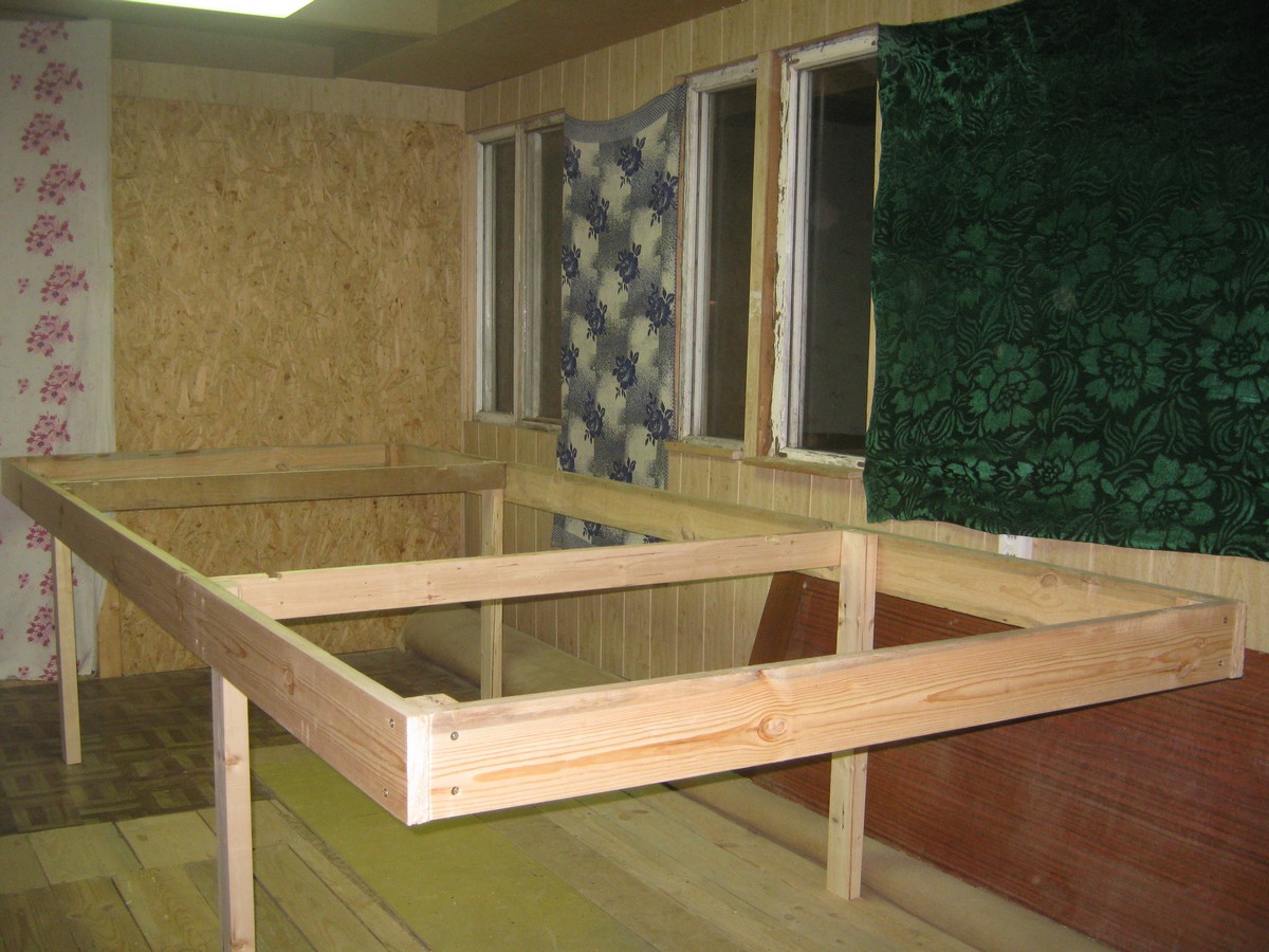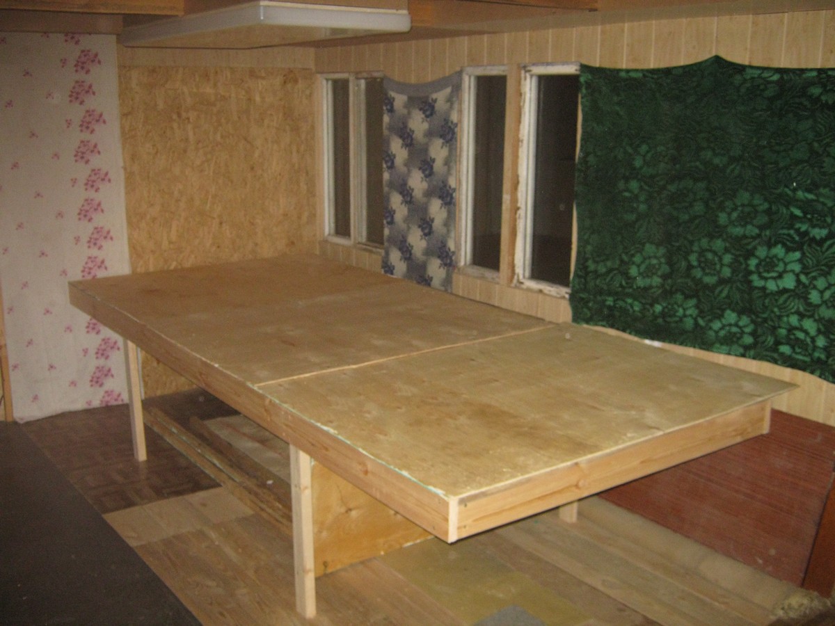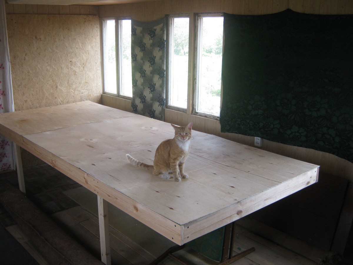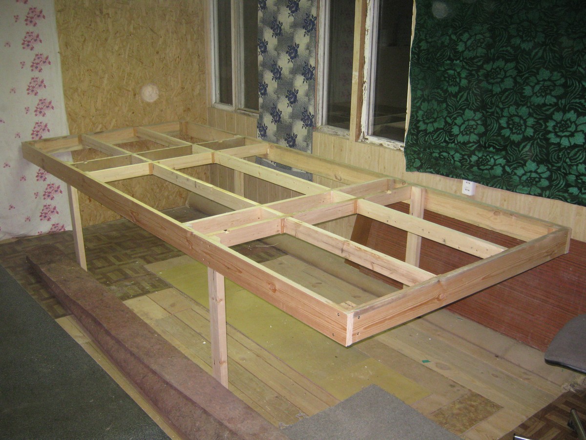 Конструкция собирается на саморезах 50х5,0 с проклеиванием ПВА. Даже на данный момент, при том, что ножки ещё не подкреплены раскосами к поперечинам, жёсткость приятно радует.