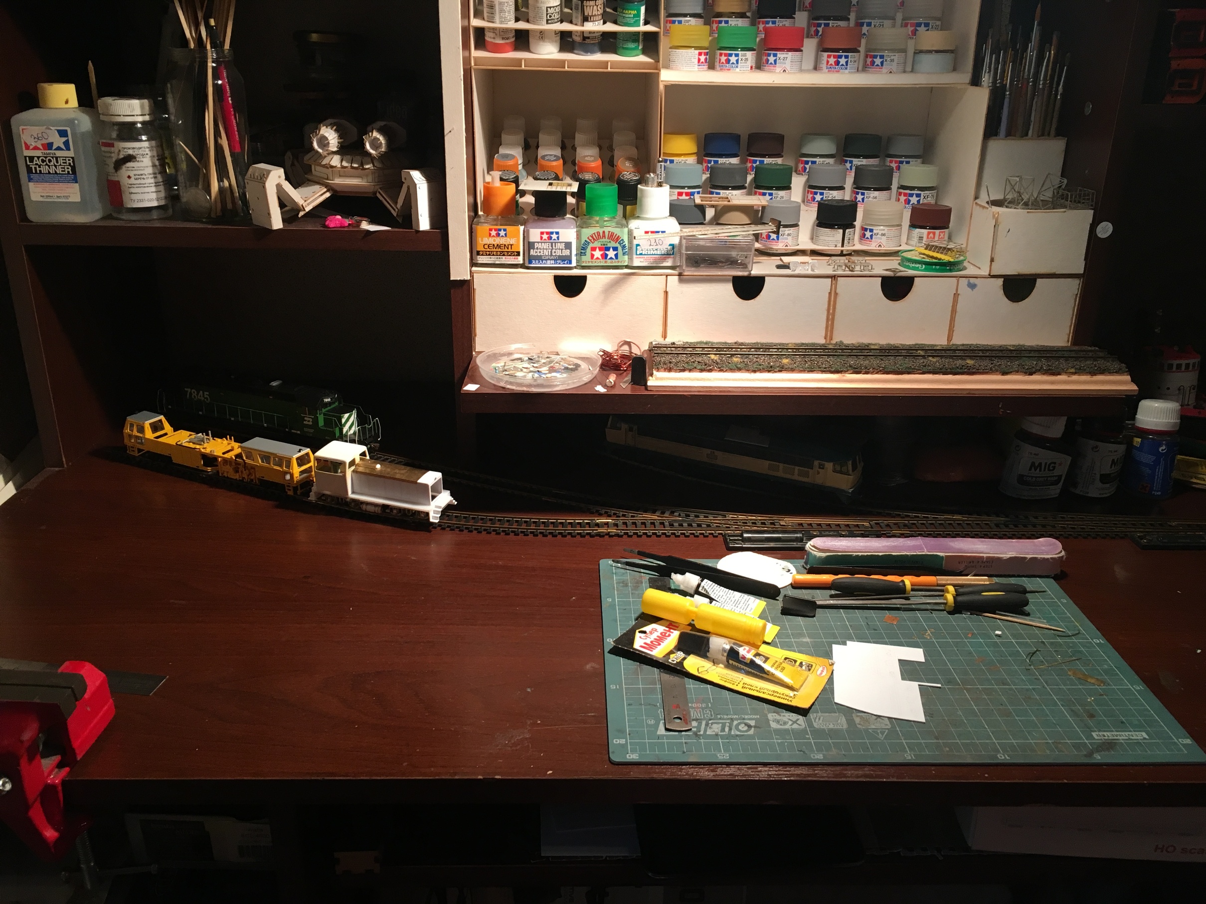 Пока делал подставку, крутился в голове вариант, как и где, построить макет поменьше. Хоть станцию, или пакгауз, не имело значения. Главное, чтоб под рукой, побольше подставки и хоть пару стрелок для манёвров. И тут пришло озарение. Есть мой рабочий стол. Есть боковые ниши и полка, под которой, можно что-то сообразить. Единственное условие - оставить рабочее пространство и чтоб вошёл коврик А4 формата. И пошли варианты - кручу, верчу, обмануть себя хочу. В итоге, при помощи друзей и наставников, сформировалась практически финальная идея. Ниже фото изысканий