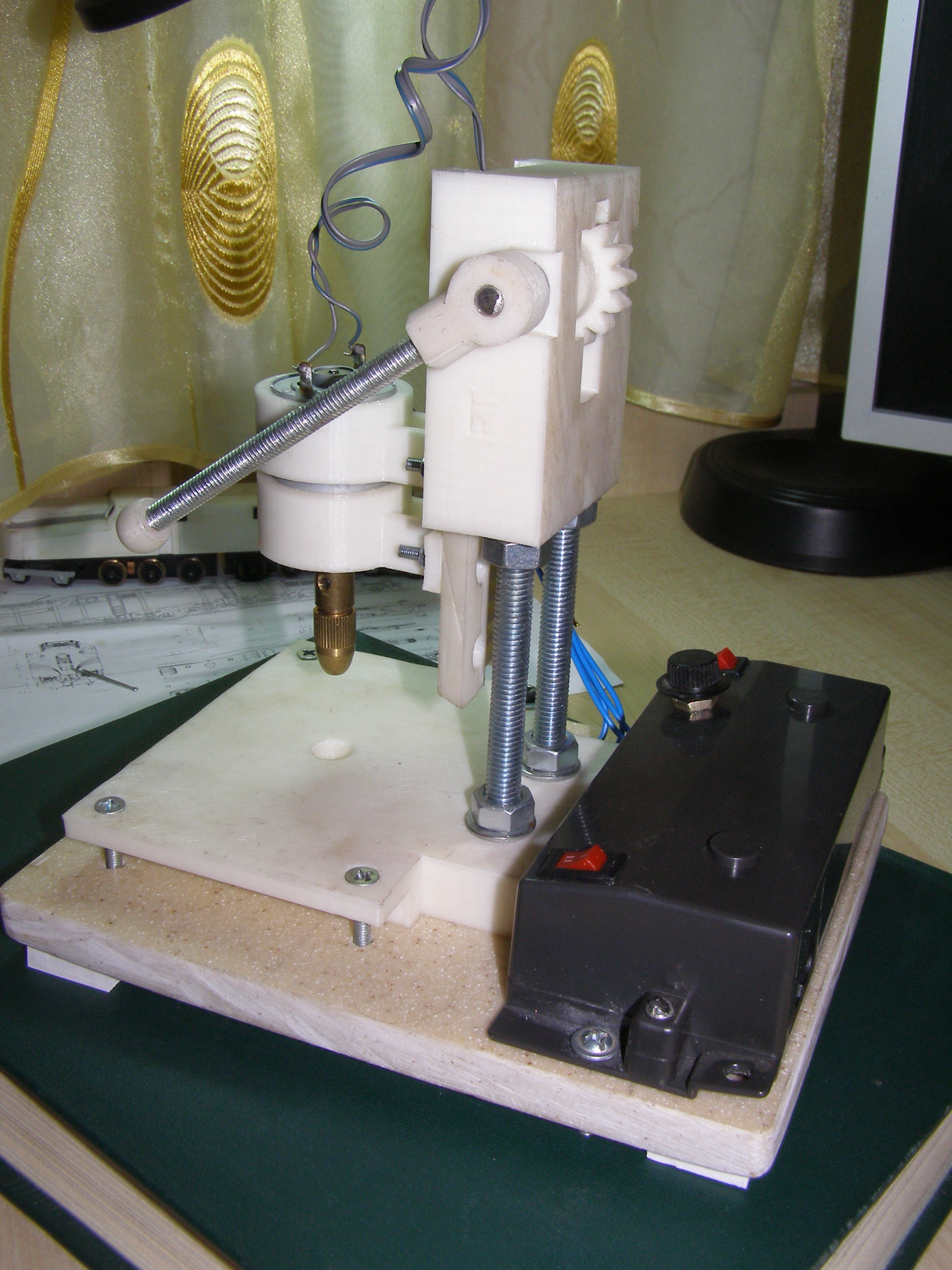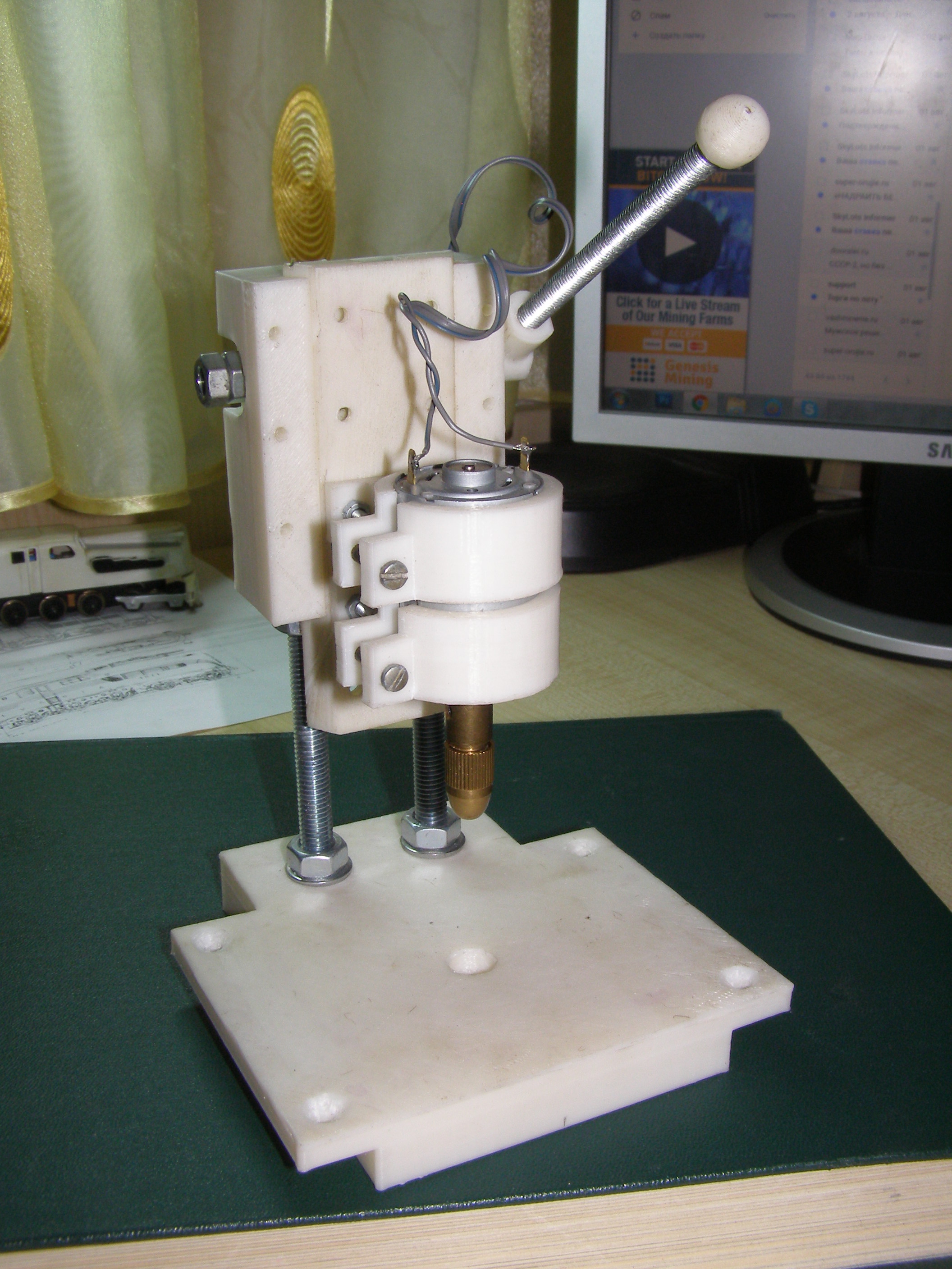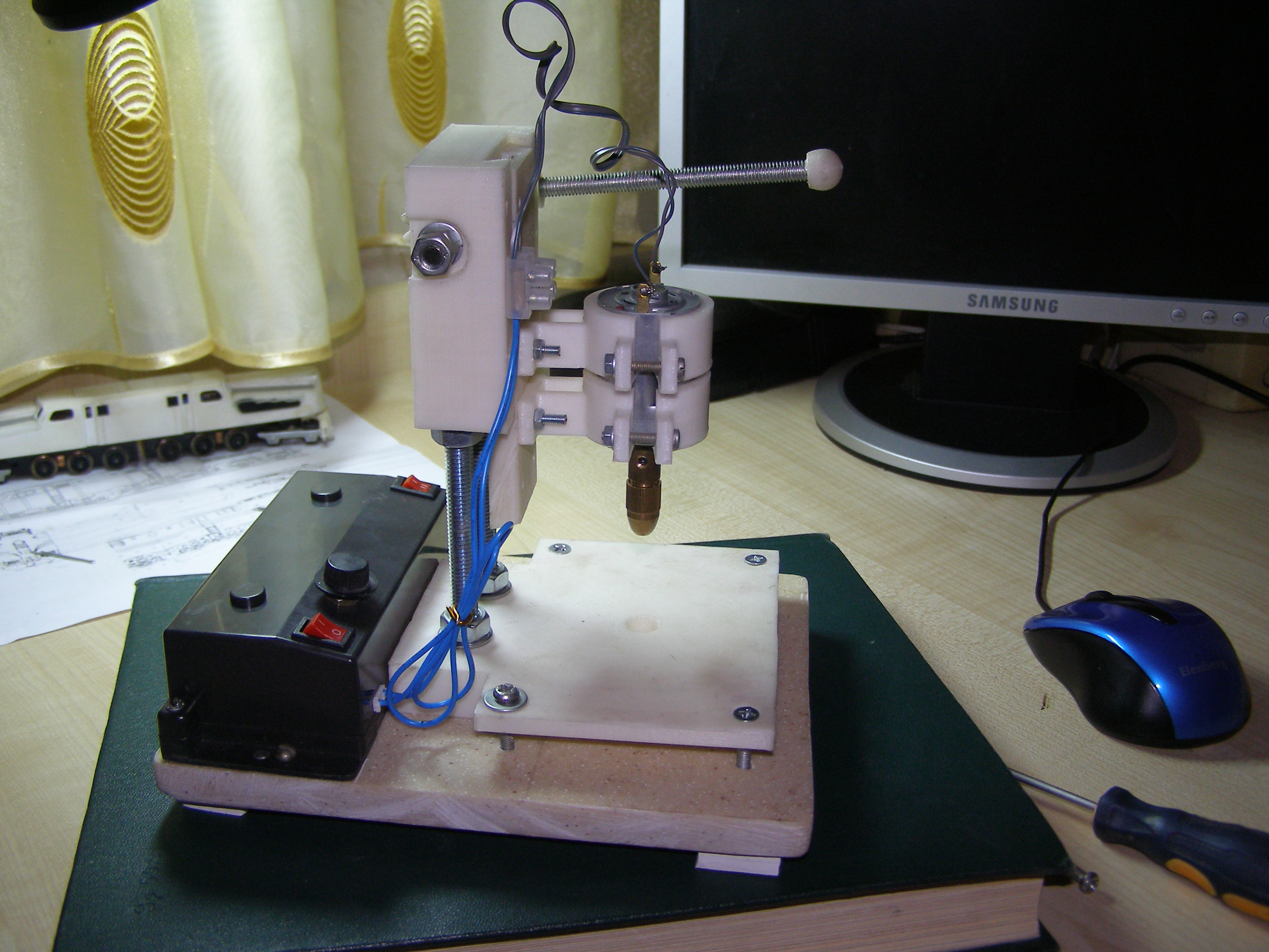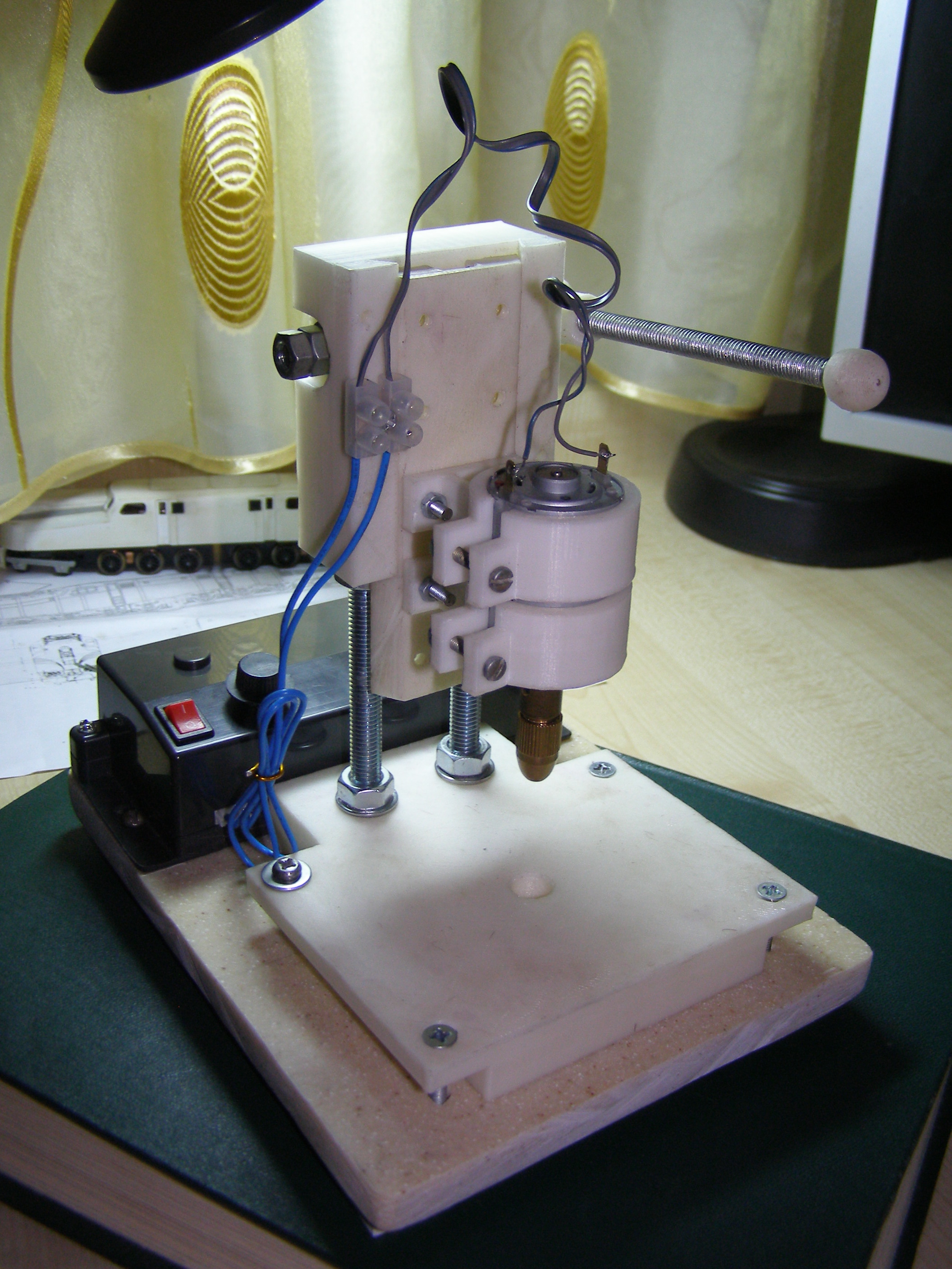Крепления сделаны под мотор диаметром 26-28 мм. У меня был такой мотор от принтера Canon PIXMA iP1500 (там их два) и блок питания от него на 24 В. В блок питания вставил две кнопки - одна для включения мотора, другая для включения освещения и потенциометр для регулировки оборотов двигателя. Только диодное освещение пока не сделал, не придумал пока как, чтобы было эстетично, удобно и практично. Все это прикрепил на основание, выпиленное из остатков кухонной столешницы сделанной из искусственного камня. Она получилась тяжеленькая, к ней приклеил резиновые ножки. Станок на столе стоит как влитой. Единственное что купил это цанговый патрон с набором цанг - 5 шт. (80 грн. на OLX). Вот вроде и все. Сам станок сделан неплохо, без люфтов. Только при установке мотора и патрона необходимо выровнять вертикаль вставив сверло. Для сверления мелких отверстий в пластике, на моделях и т.п. его хватит за глаза. Вот так он выглядит в сборе. Кому надо вот ссылка на OLX где покупал - https://www.olx.ua/obyavlenie/sverlilny ... sY9Uv.html. Сегодня смотрел товарищ продает, цена та же - 250 грн., Харьковская область.