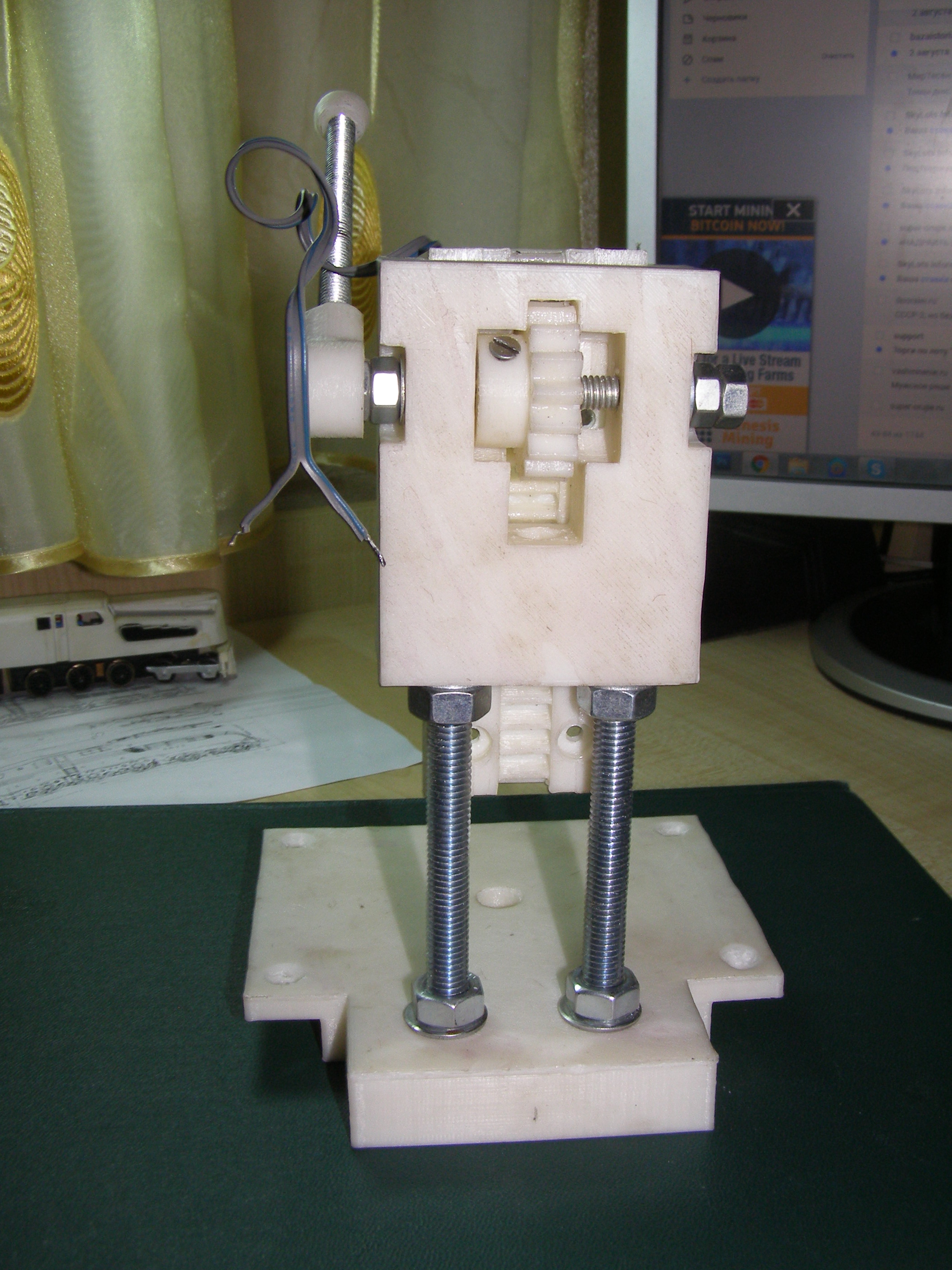 Сначала про сверлильный станок. Его необходимость почувствовалась сразу как только начал делать модели сельхозтехники из пластика, а потом переключился на железнодорожную тематику. Особенно когда делаешь ходовую, редуктора, где необходимо просверлить все отверстия под оси, крепления ровно, перпендикулярно и соосно. Маленькой дрелькой кривовато выходит, приходится по несколько раз сверлить пластик чтобы было более-менее ровно и перпендикулярно плоскости. Начал искать в сети чего предлагают на тему мини-сверлильных станков ( станков для сверления плат), из чего делают. Вариантов масса. В результате на OLX-е нашел вот такой станок, напечатанный на 3D принтере, кстати тут есть тема где упоминается такой станок, но что-то там цена была указана какая-то космическая за него. Станок был без мотора и блока питания. Цена - 250 грн. Покупал в середине июня.