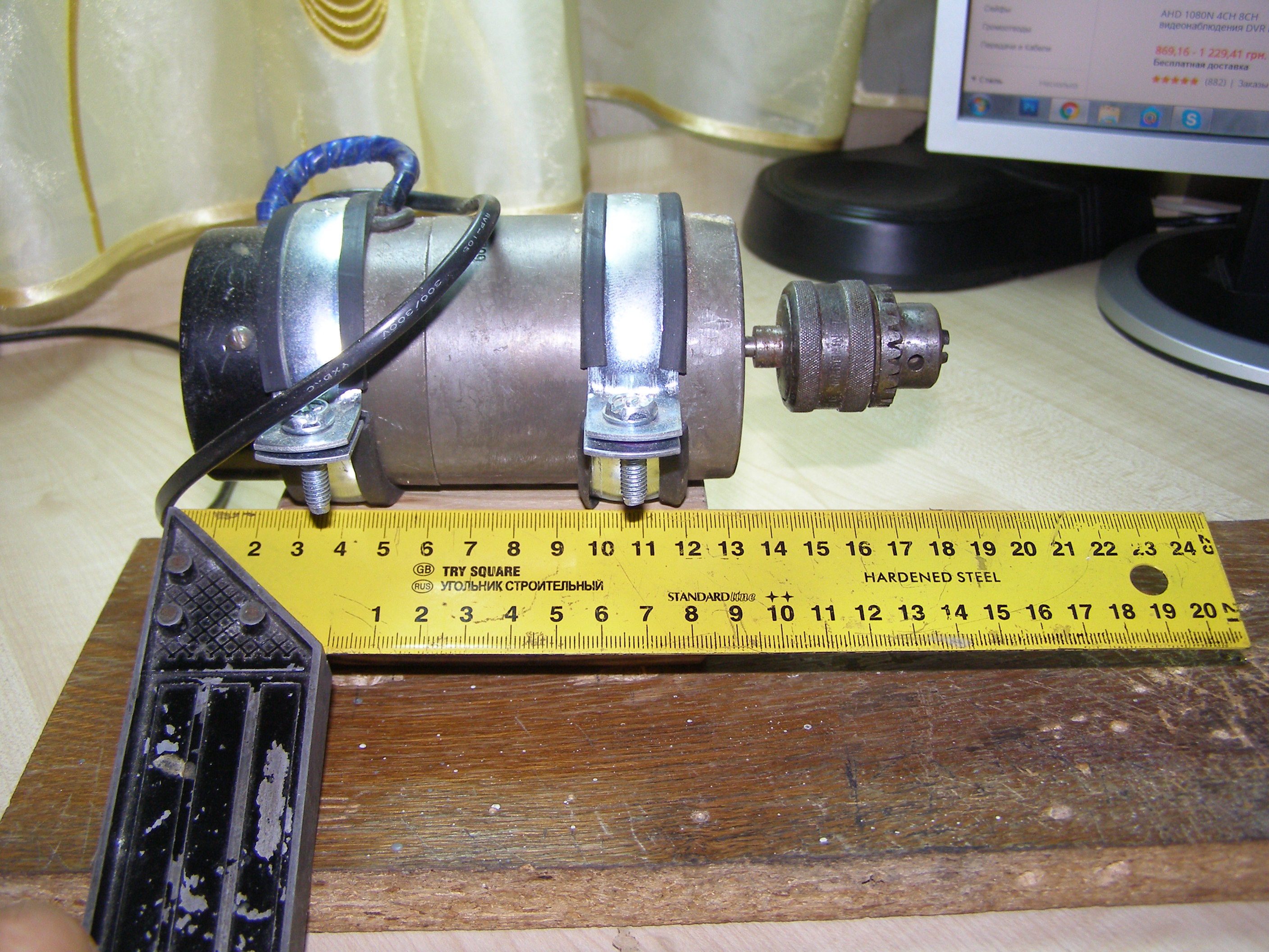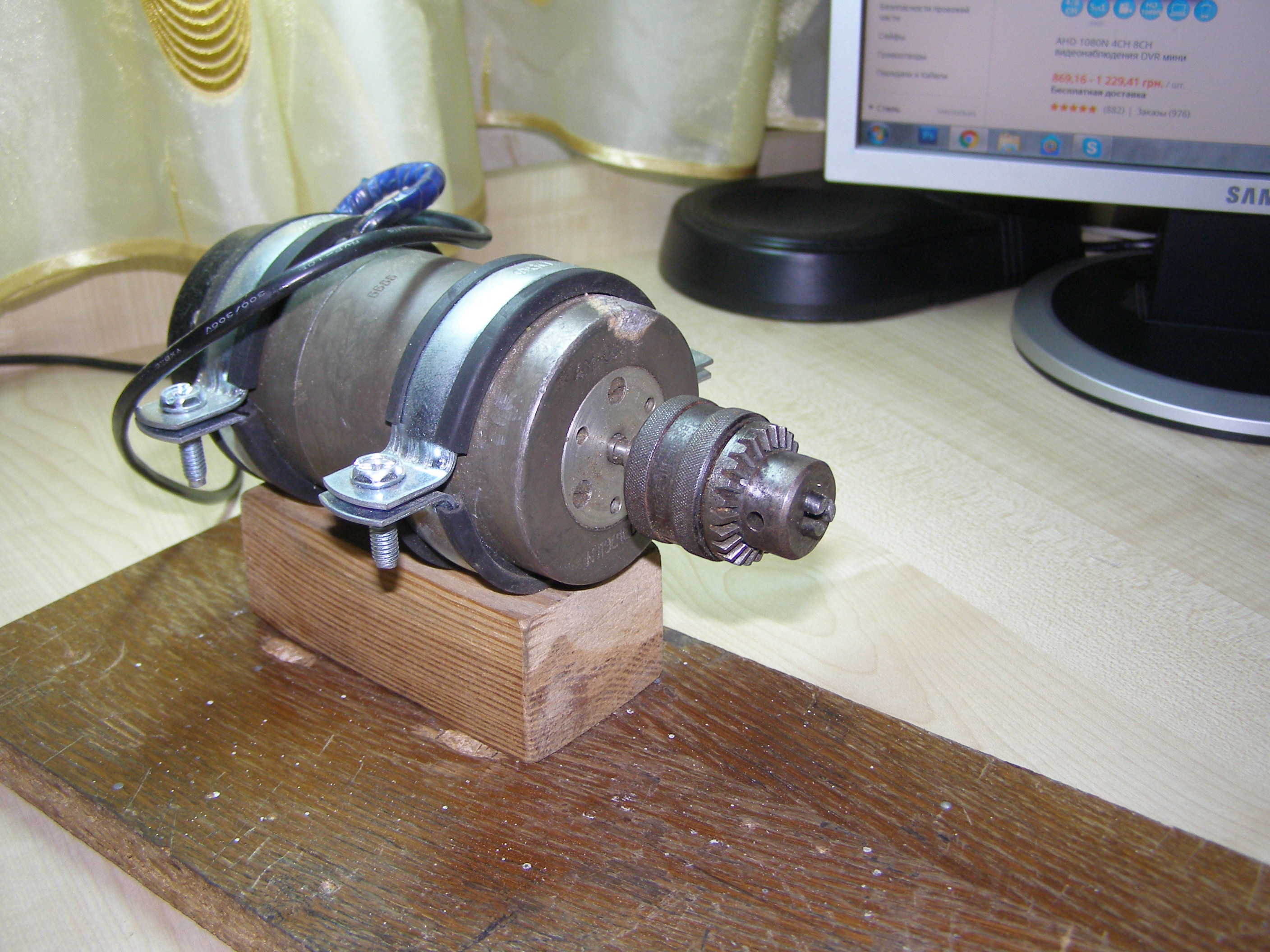 Теперь хочу показать свой "токарный станок". Его необходимость возникла сразу как начал заниматься паровозостроением. Поначалу использовал бормашину, но в ней неудобно зажимать детали. Посмотрел что предлагает Китай, есть интересные вещи, но у них не интересная цена. Поэтому на OLX купил вот такой двигатель с патроном и прикрепил его к доске, получился типа станок. Им и пользуюсь, используя насадки для бормашины. С его помощью обточил и просверлил металлические втулки для приводного вала своего электровоза.