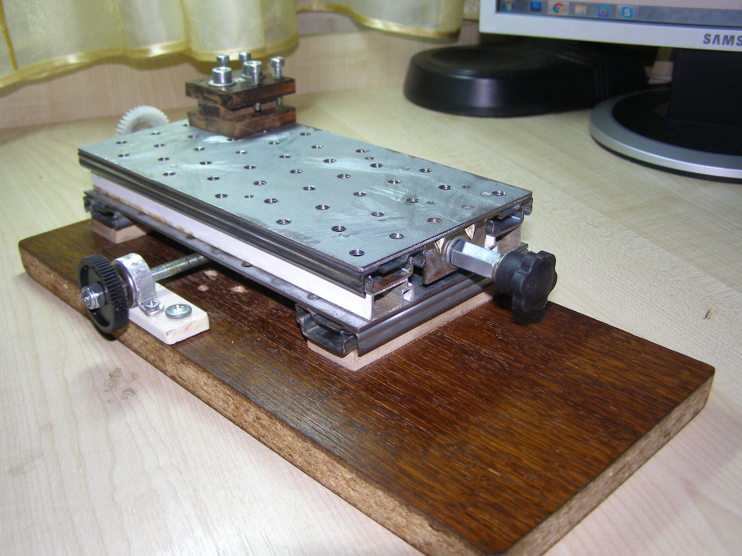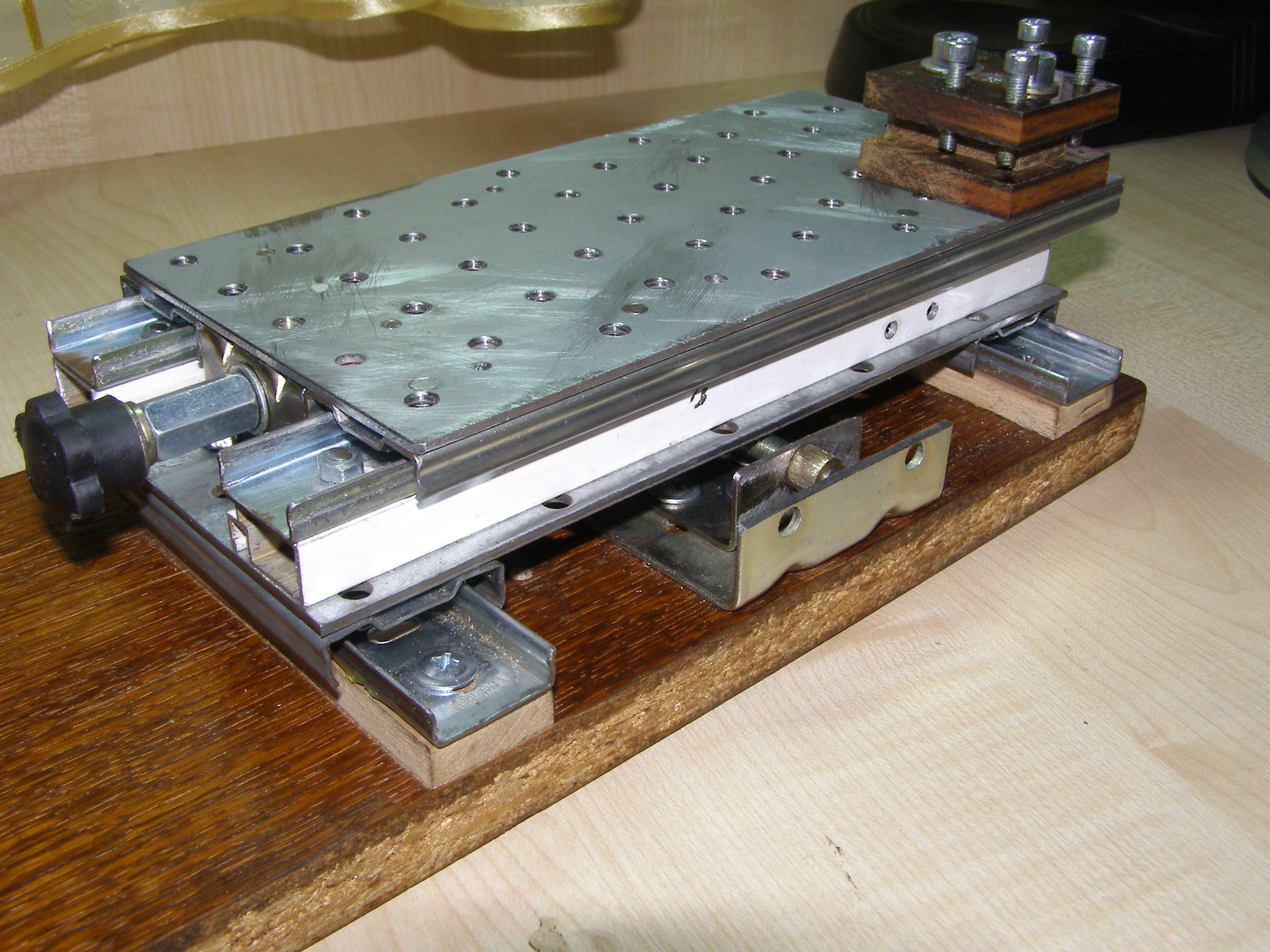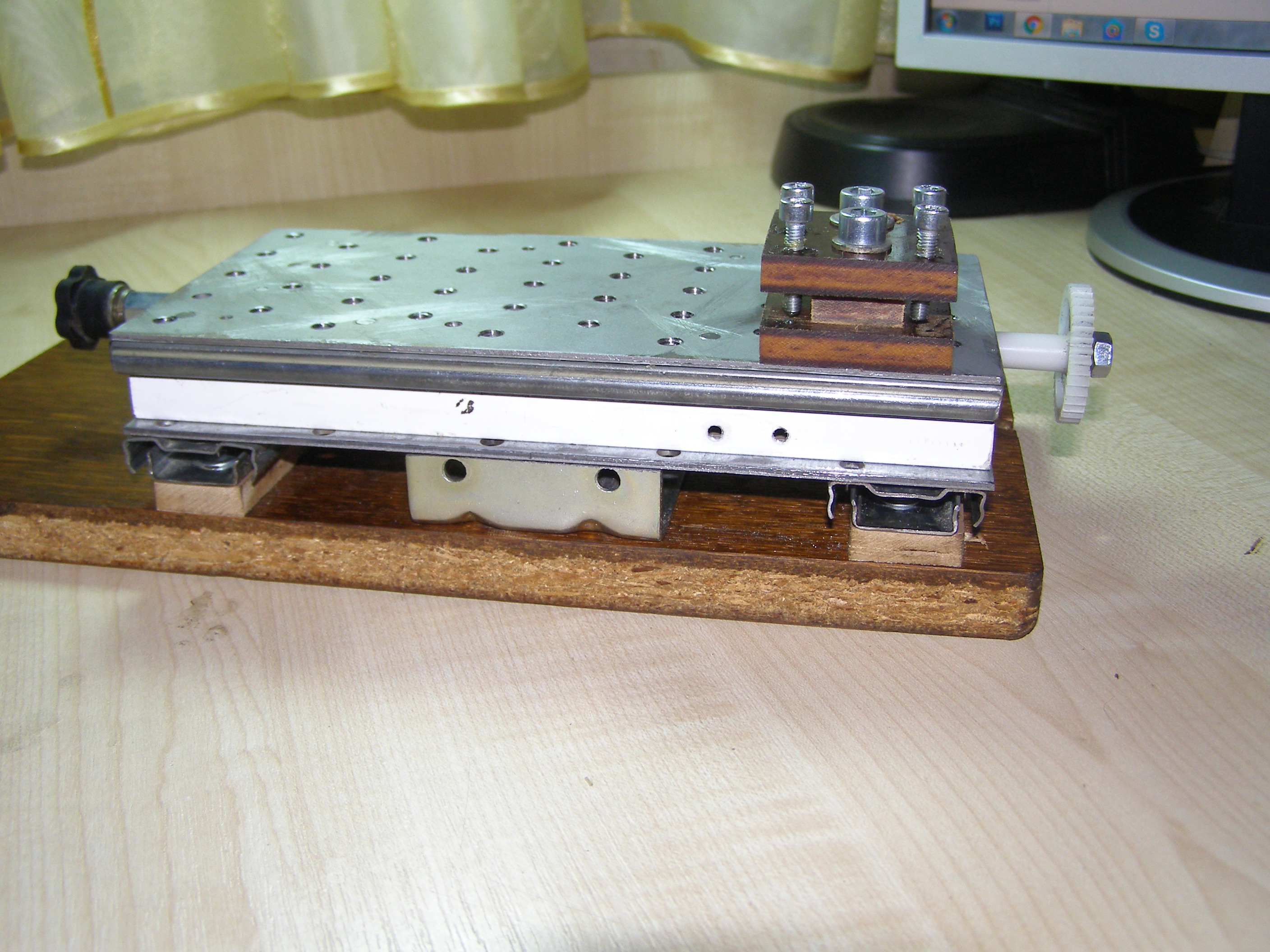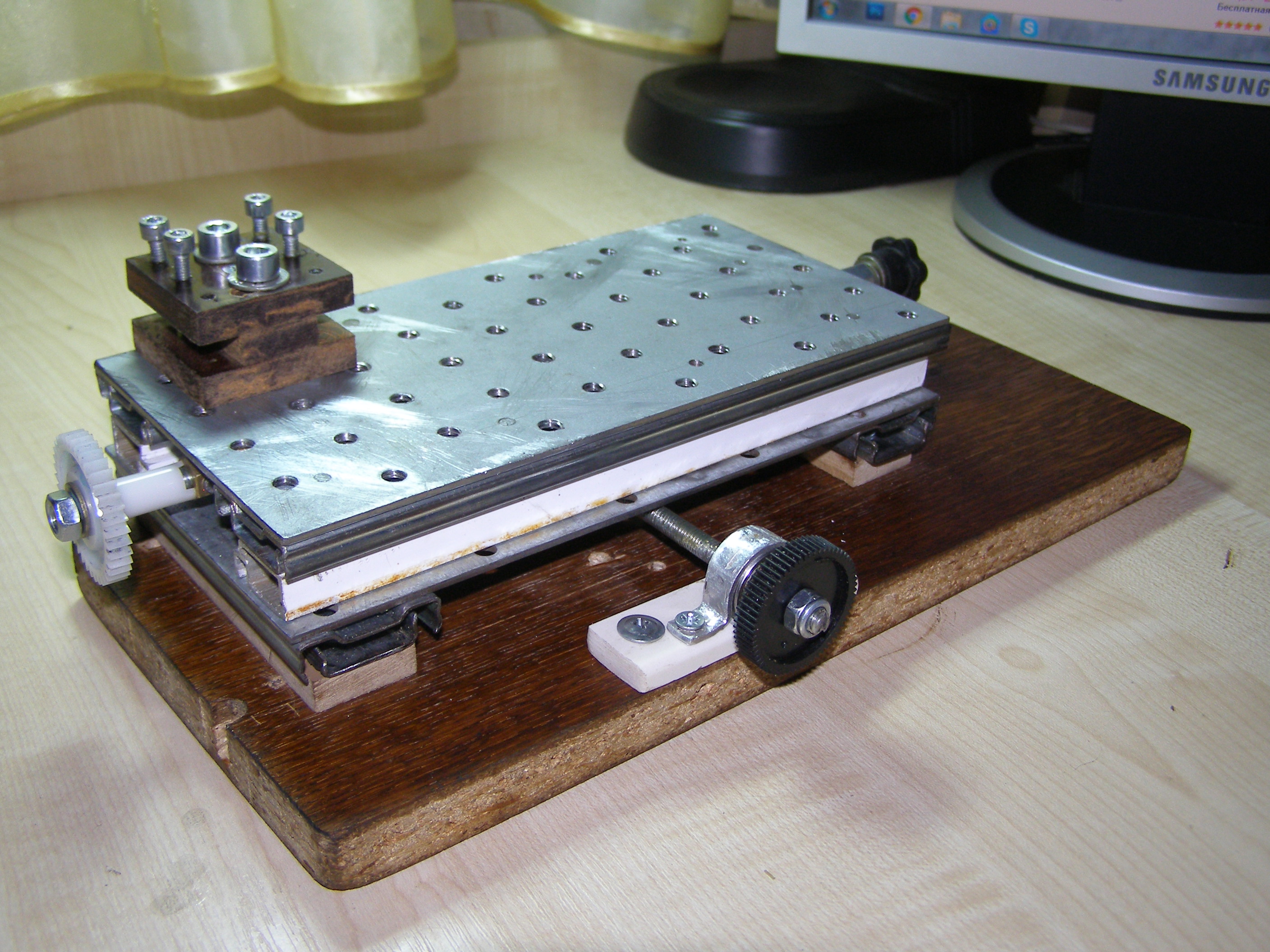 После этого решил что можно попробовать поточить колеса из металла, из бронзы например. Для этого нужно было сделать координатный стол. Посмотрел как это делает народ в сети. Вот например http://www.koga.net.pl/forum/viewtopic. ... 36&t=35589. И я тоже решил из подручных материалов вот сделать такой столик. В качестве направляющих использовал мебельные направляющие, другого ничего не было. Конечно это не самый лучший вариант, но для моих целей - точить всякие мелкие кругляшки я думаю пойдет,все равно это лучше, чем точить руками на весу. И вот что получилось: