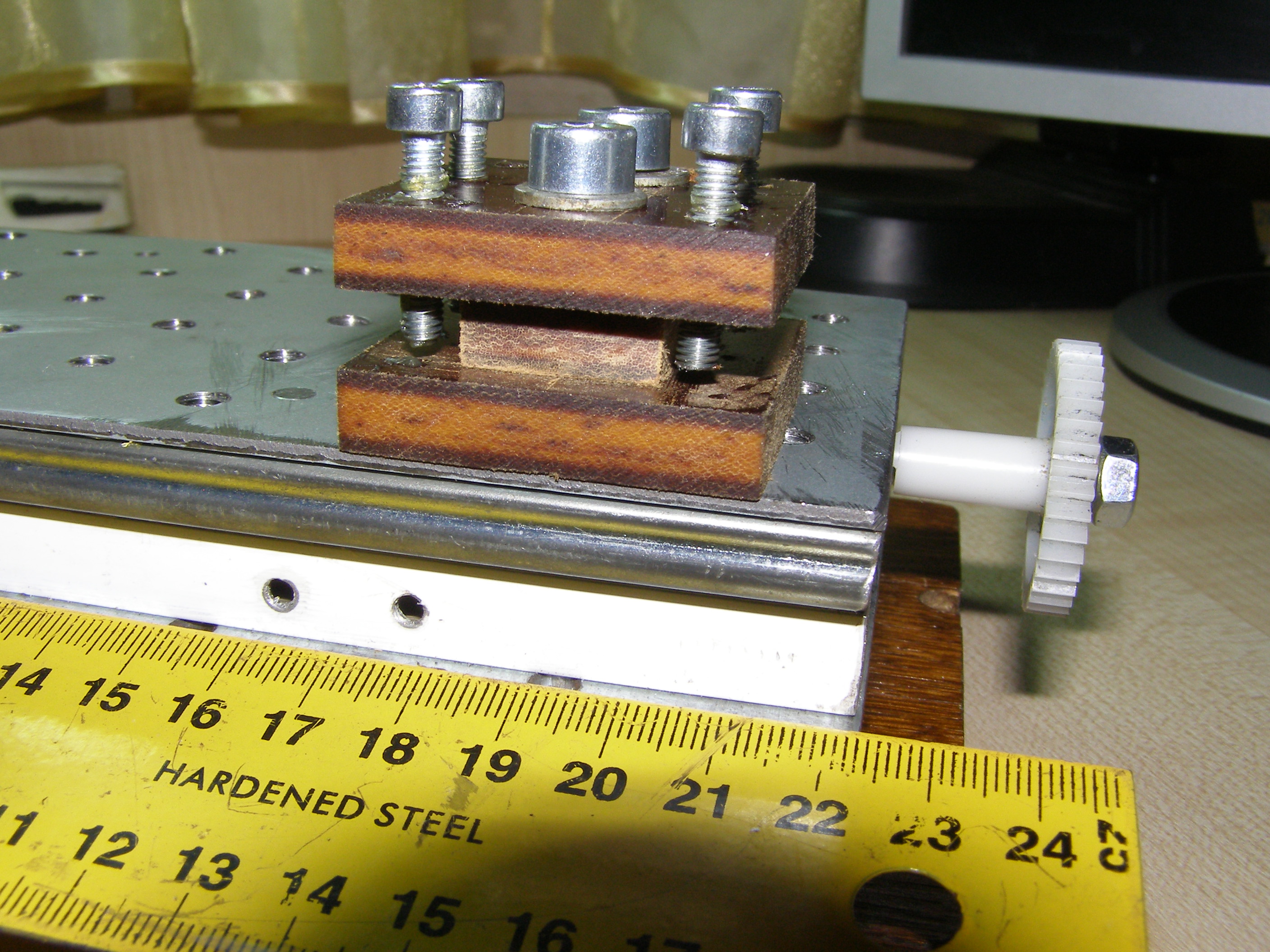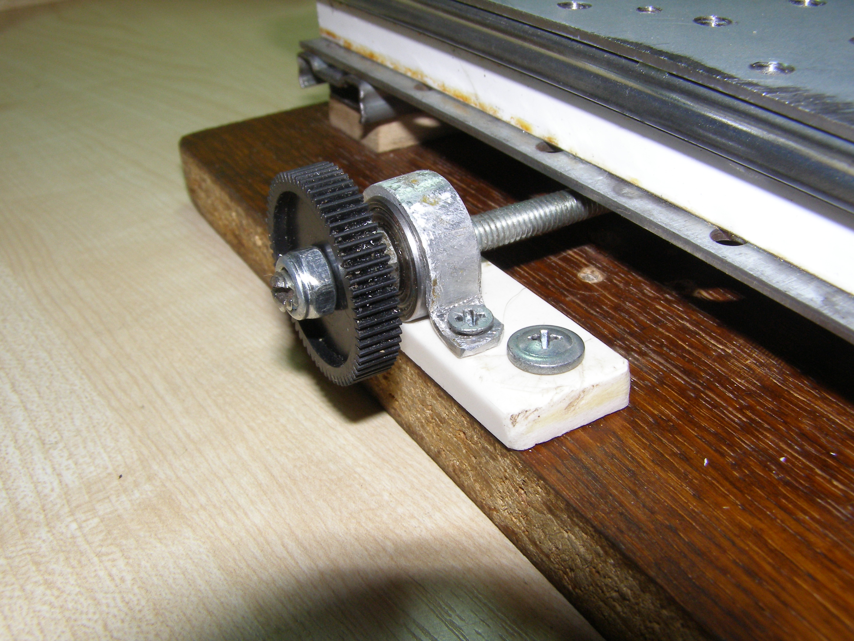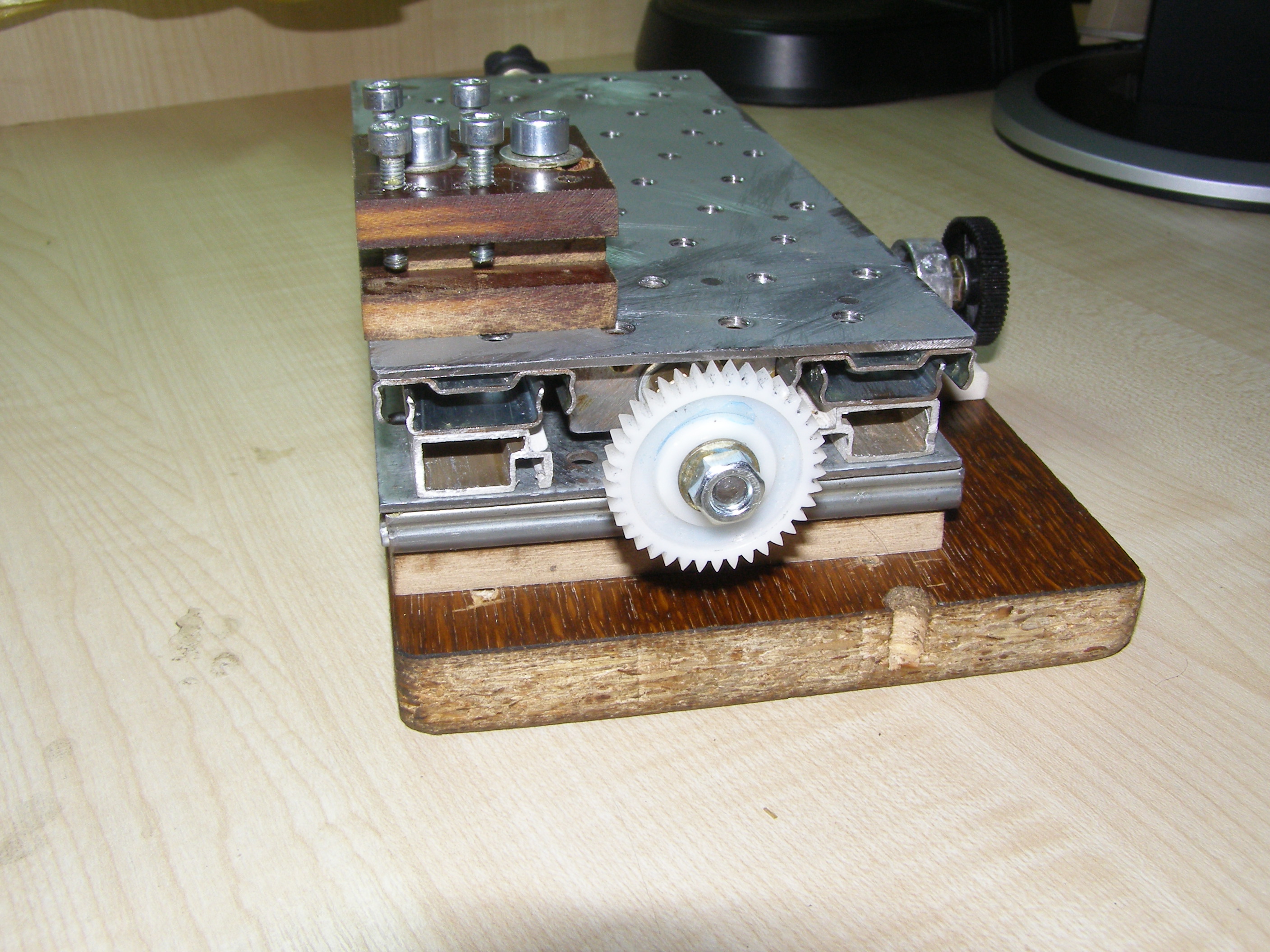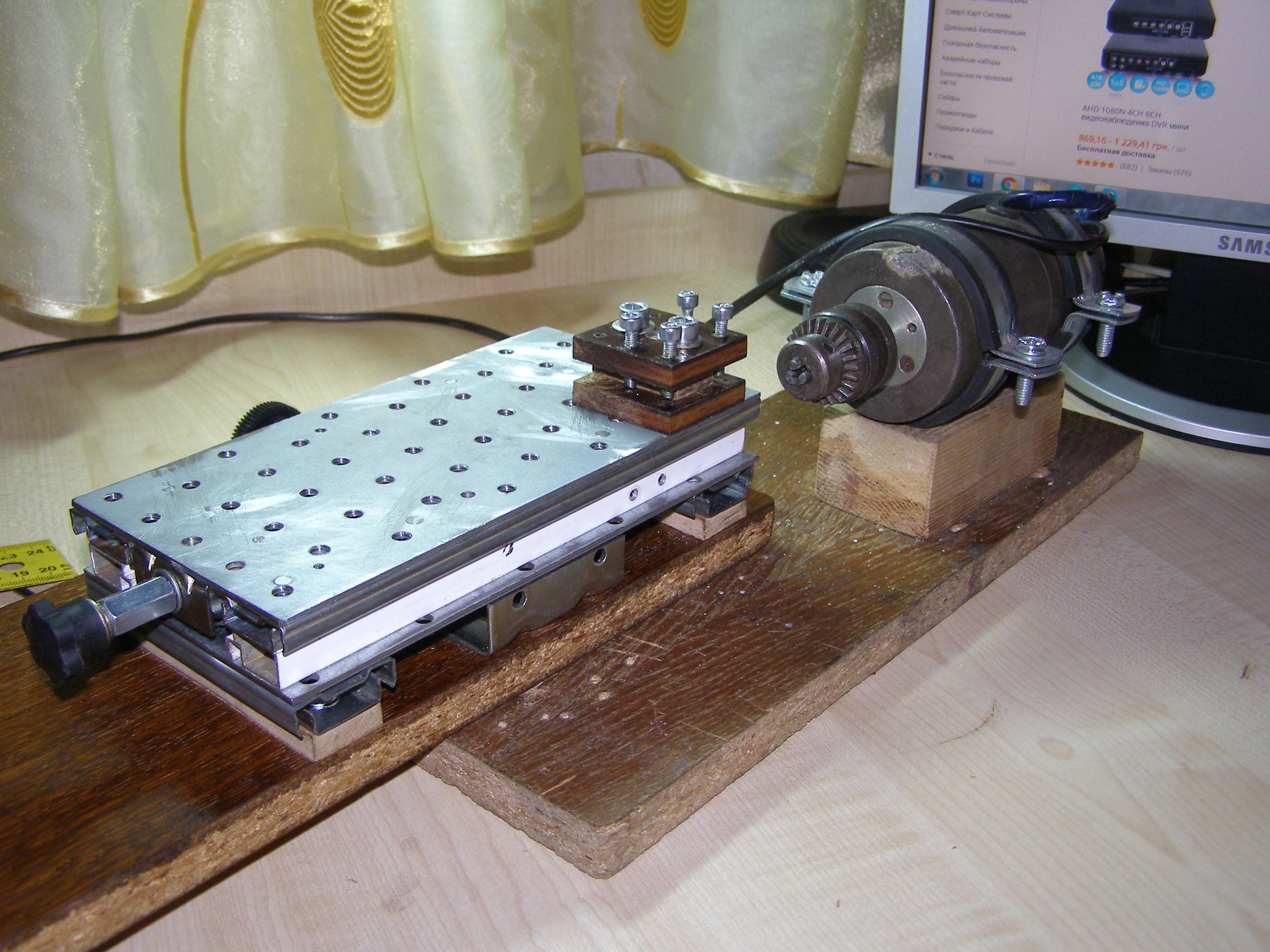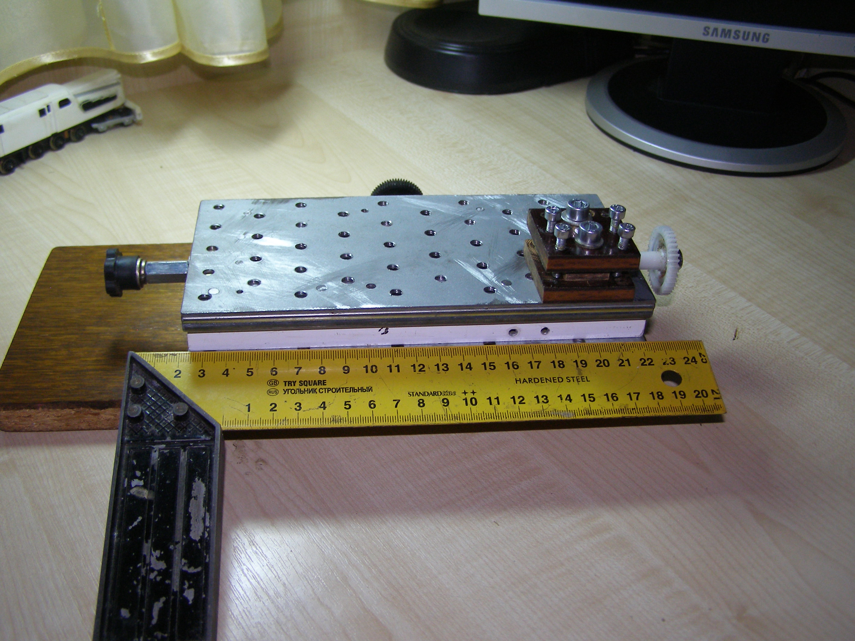 После этого решил что можно попробовать поточить колеса из металла, из бронзы например. Для этого нужно было сделать координатный стол. Посмотрел как это делает народ в сети. Вот например http://www.koga.net.pl/forum/viewtopic. ... 36&t=35589. И я тоже решил из подручных материалов вот сделать такой столик. В качестве направляющих использовал мебельные направляющие, другого ничего не было. Конечно это не самый лучший вариант, но для моих целей - точить всякие мелкие кругляшки я думаю пойдет,все равно это лучше, чем точить руками на весу. И вот что получилось: