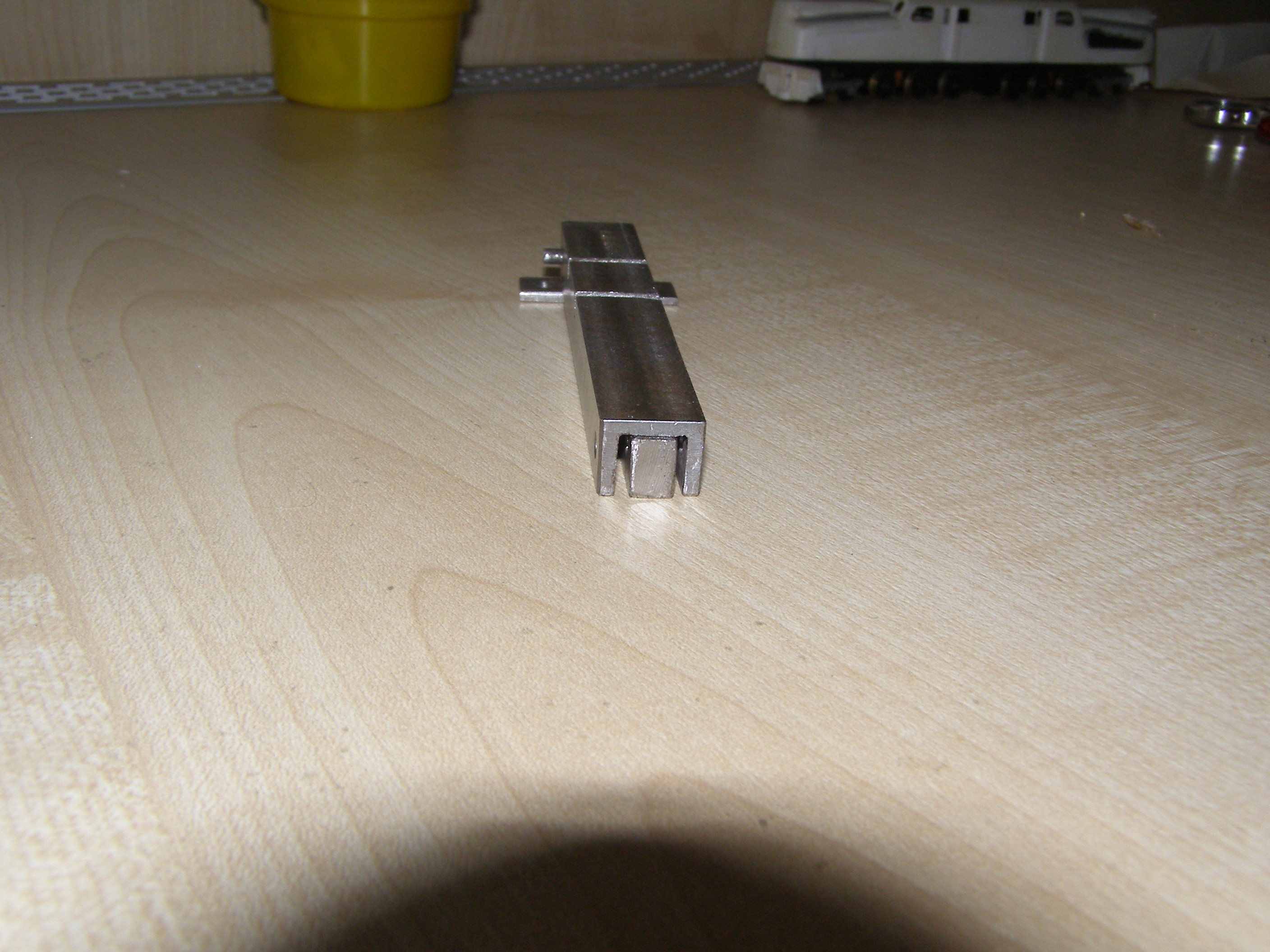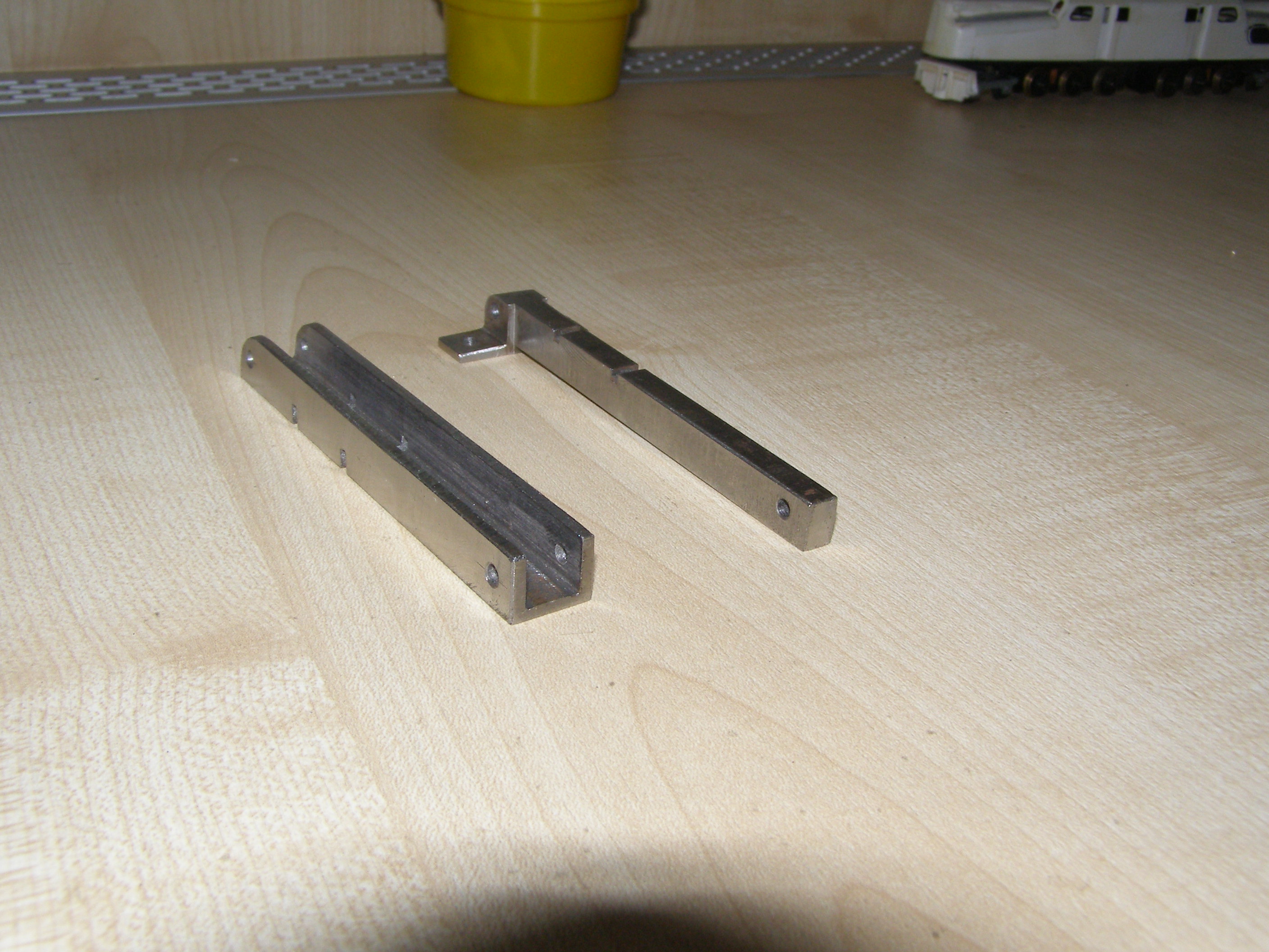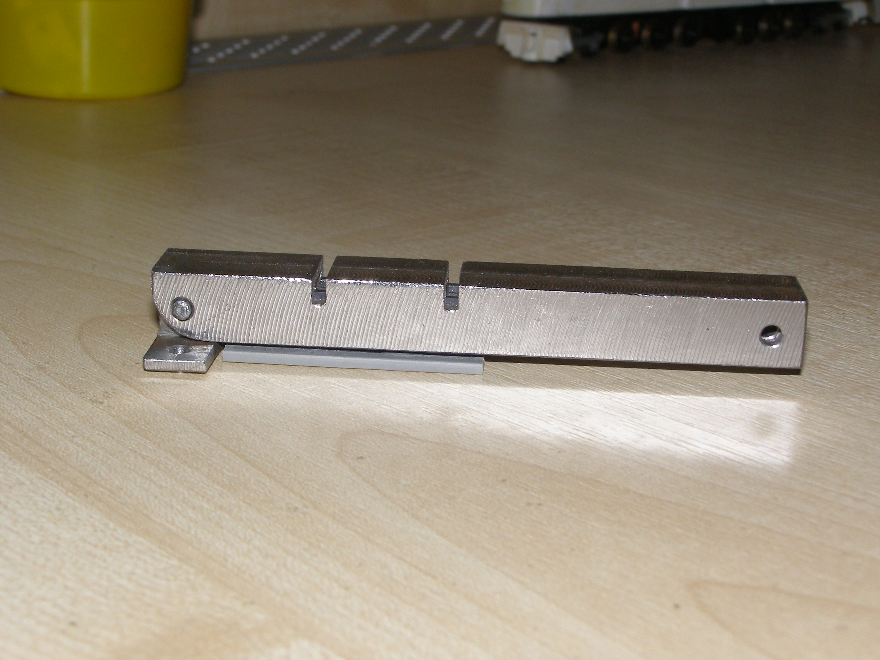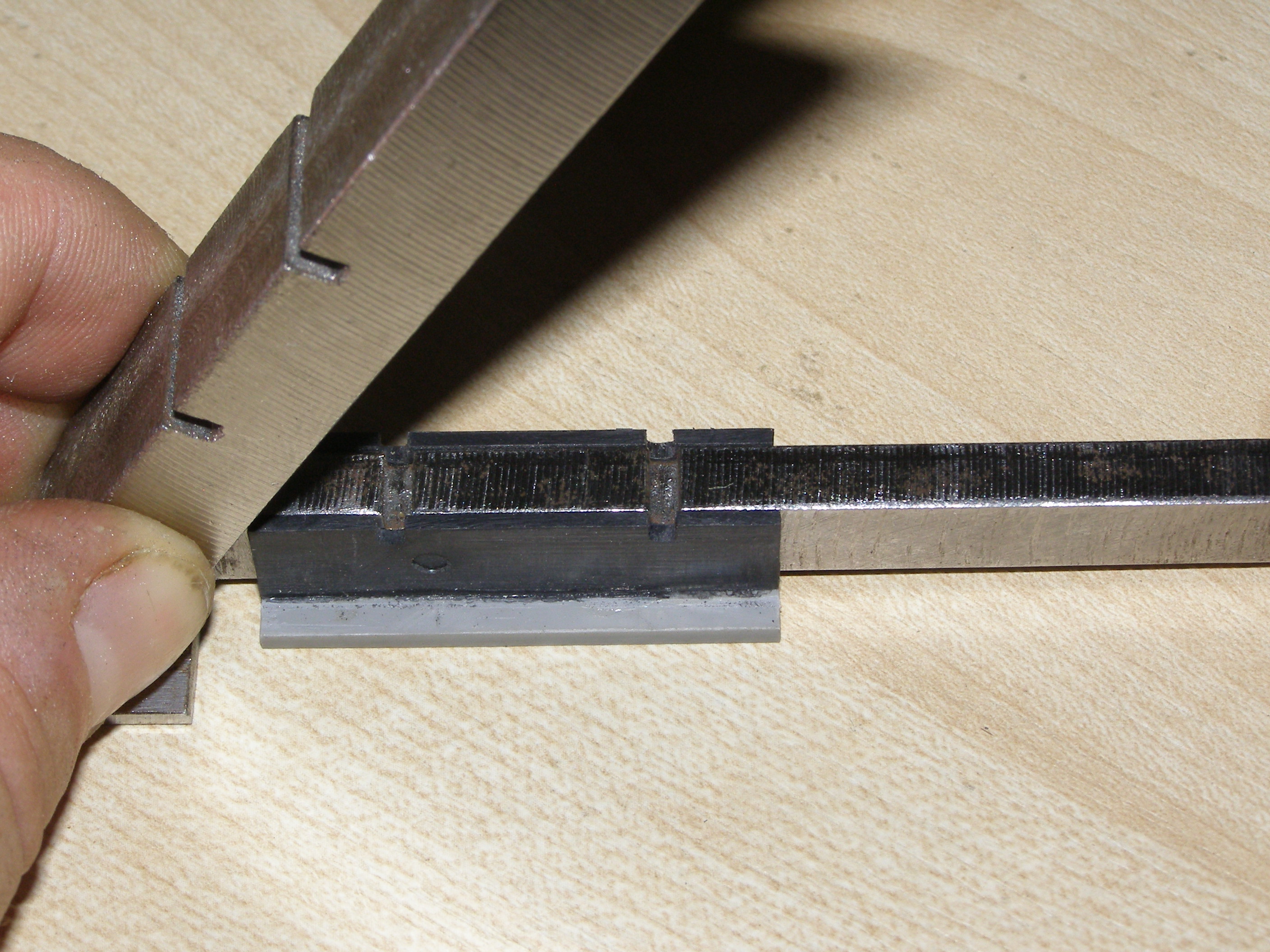 Сам процесс - под упор оправки снизу вставляю основание тележки, приклеиваю боковинки и зажимаю все это верхней частью. Ждем пока склеится. В результате все получается очень ровненько, все перпендикулярно. Прорези на прессике нужны для пропиливания надфилем в тележке посадочных мест для осей колесных пар. Они сделаны без учета каких-либо межосевых расстояний - просто две прорези. Тележку можно двигать по направляющей и делать пропилы там где надо. Ее надо прикрепить к какому-нибудь основанию и будет еще удобнее. Может это кому и пригодится.