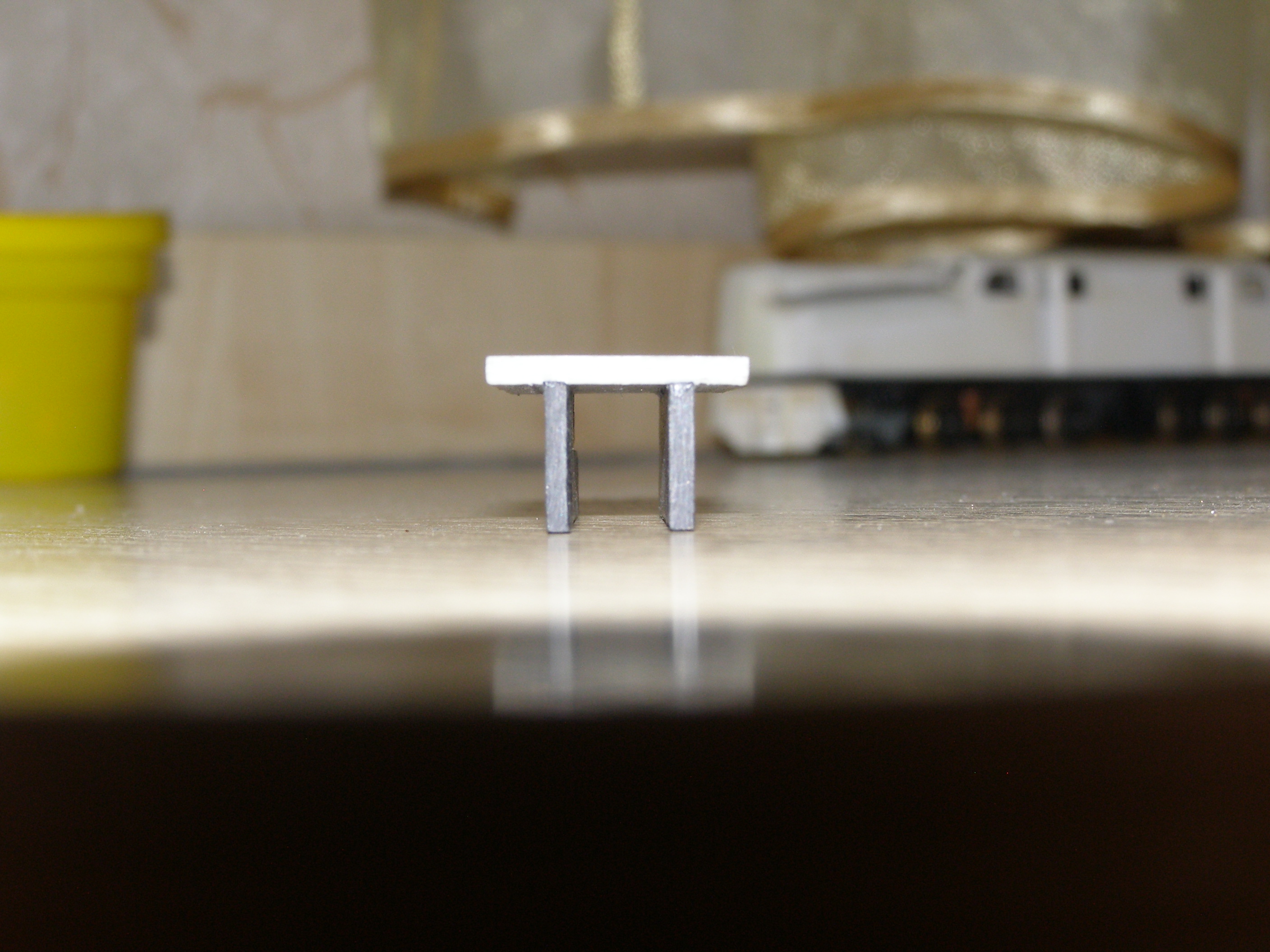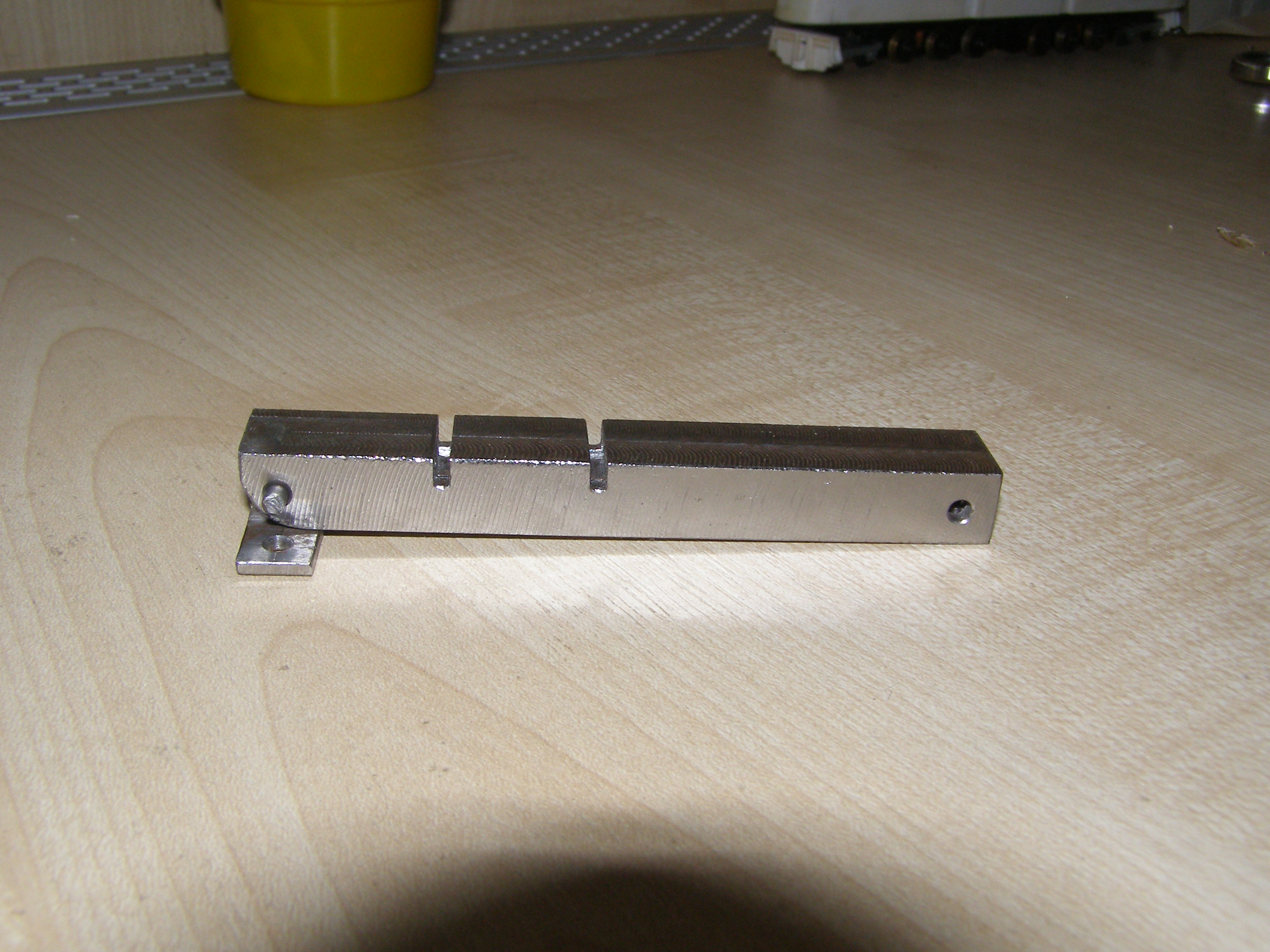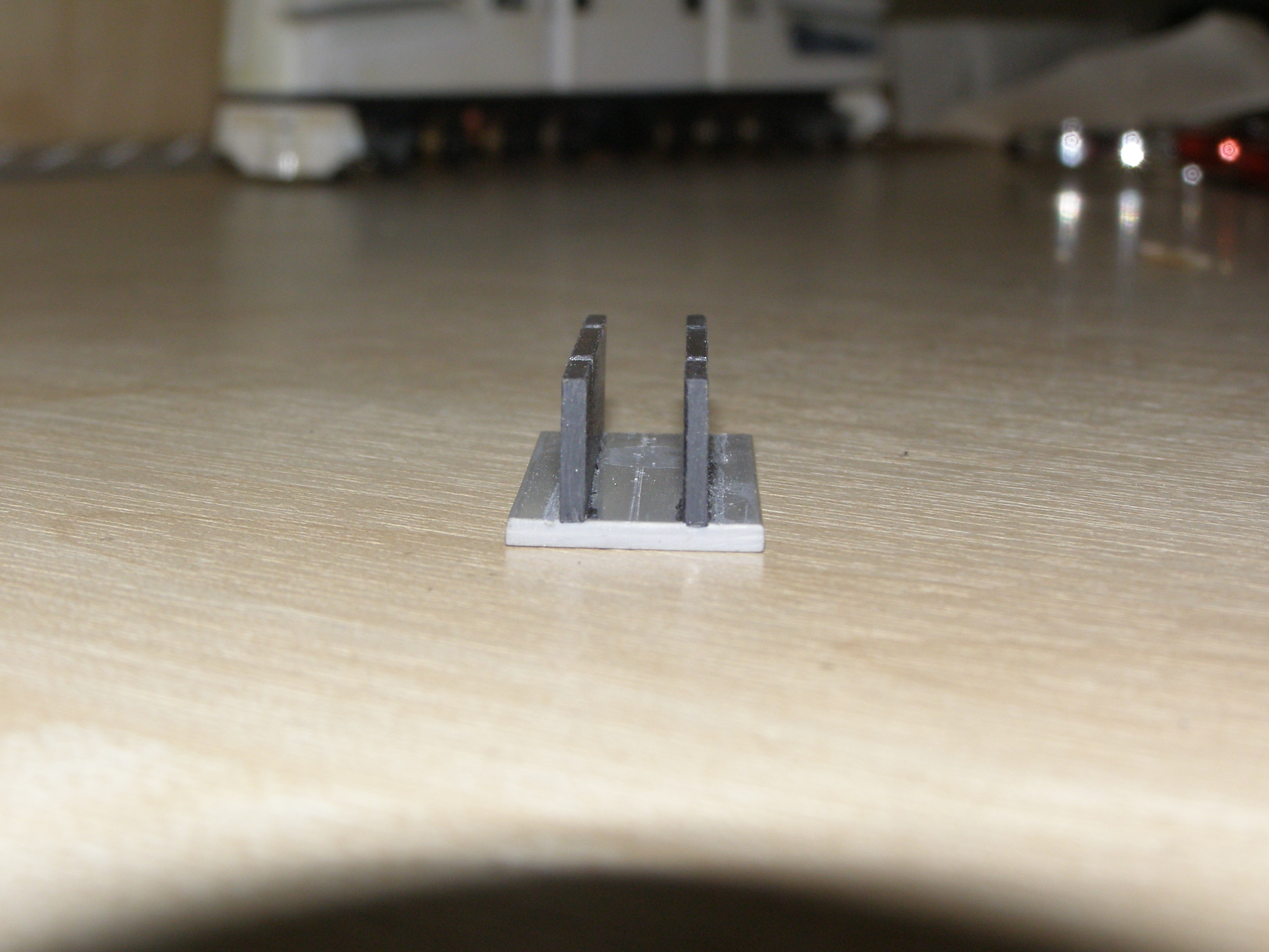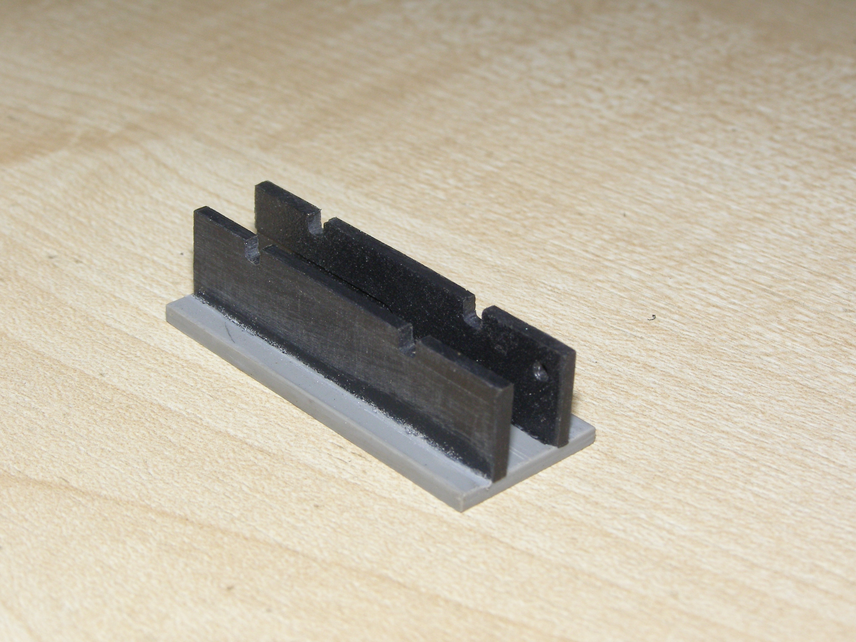 Сам процесс - под упор оправки снизу вставляю основание тележки, приклеиваю боковинки и зажимаю все это верхней частью. Ждем пока склеится. В результате все получается очень ровненько, все перпендикулярно. Прорези на прессике нужны для пропиливания надфилем в тележке посадочных мест для осей колесных пар. Они сделаны без учета каких-либо межосевых расстояний - просто две прорези. Тележку можно двигать по направляющей и делать пропилы там где надо. Ее надо прикрепить к какому-нибудь основанию и будет еще удобнее. Может это кому и пригодится.