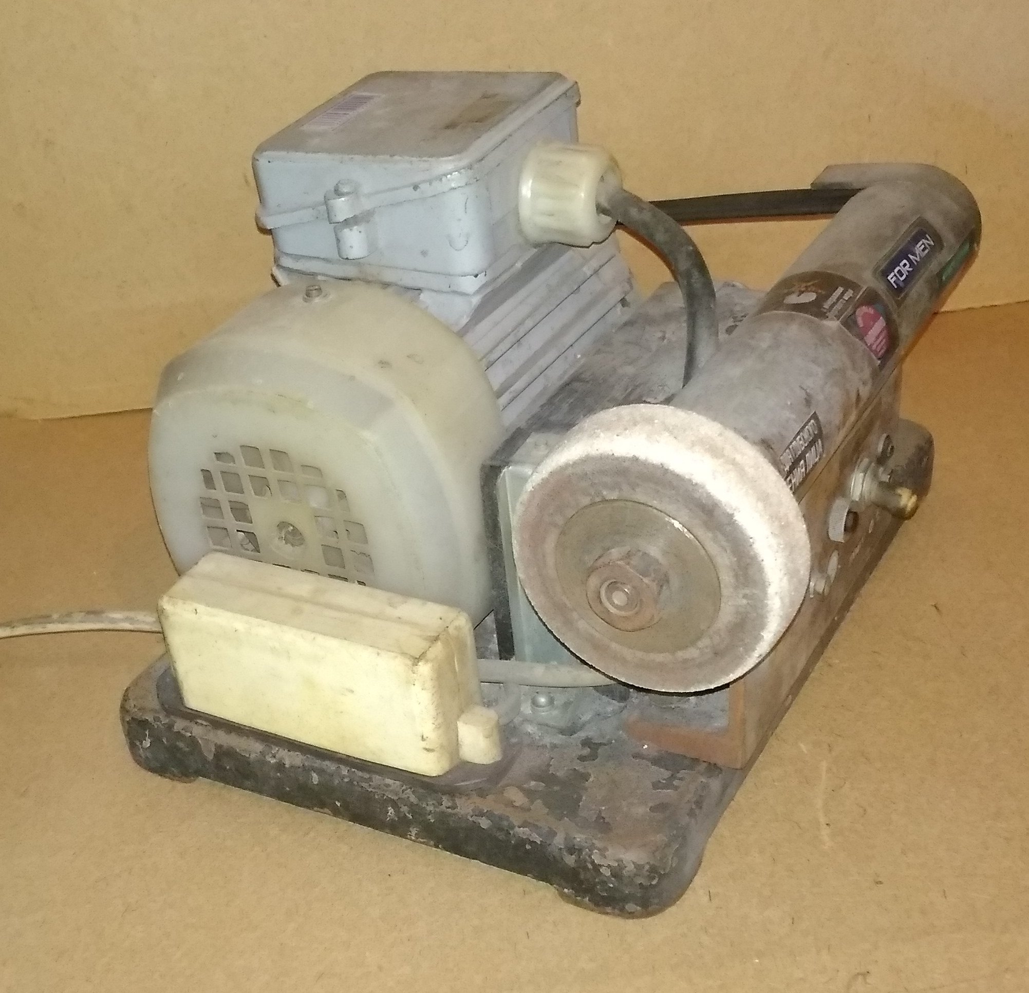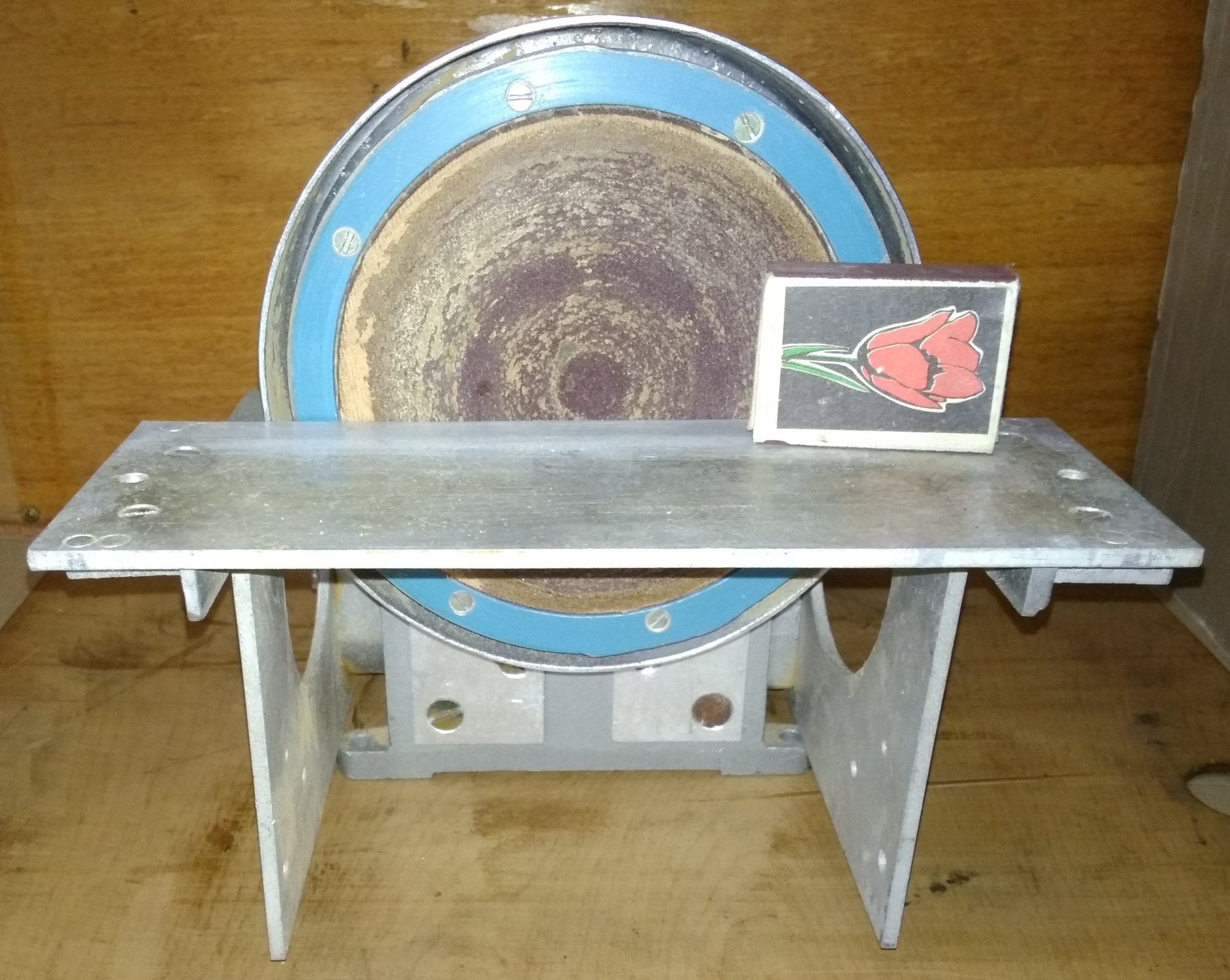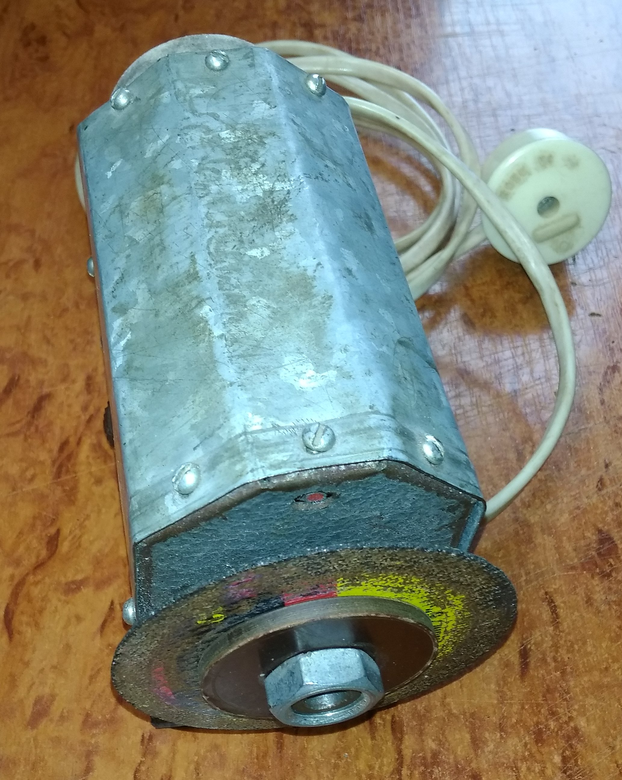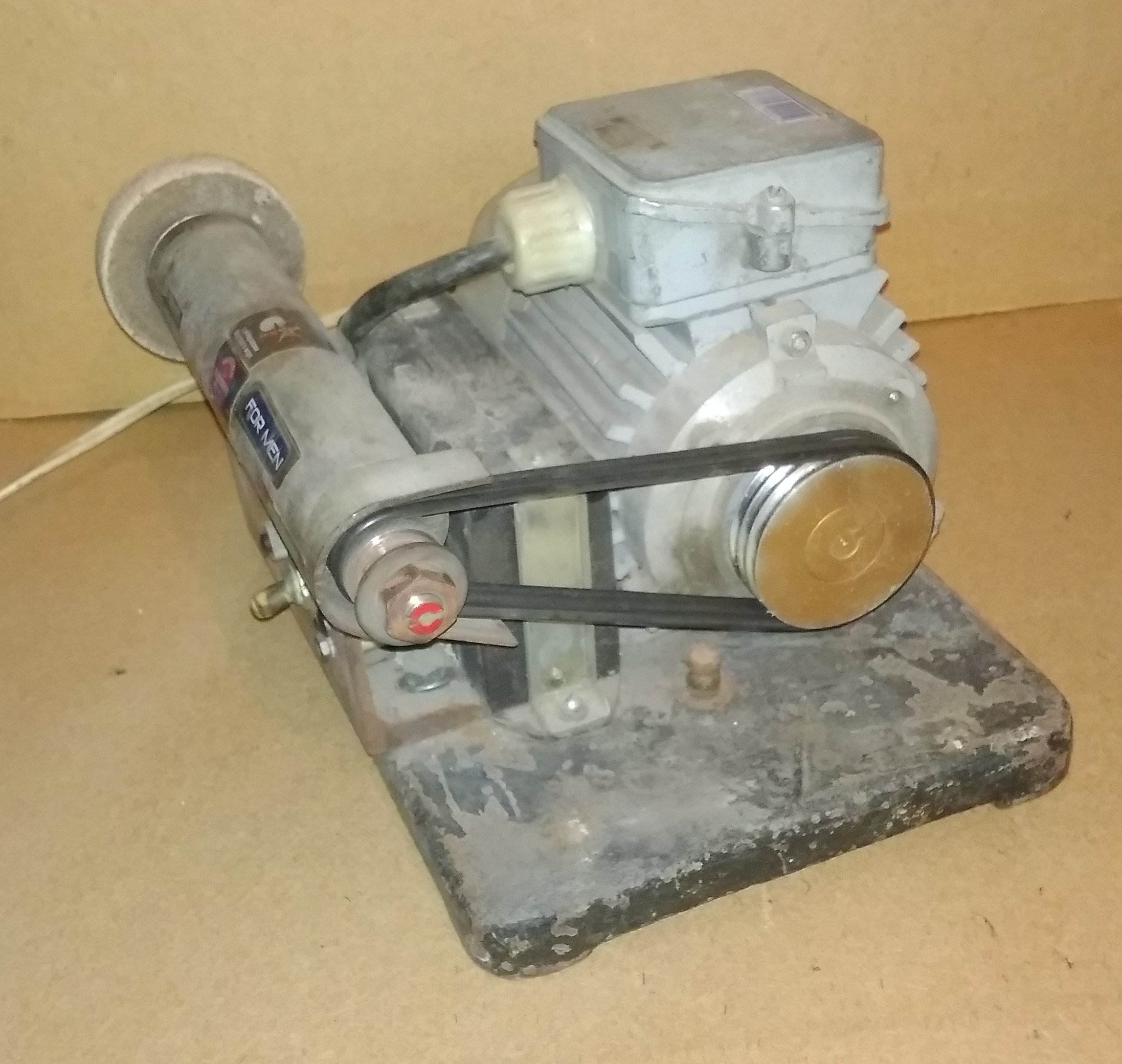 Двигатель отдельно от точила, привод резиновыми пасиками, 3 шт. Возможность кратковременного форсажа, для быстрого пуска или усиления мощности. С одной стороны - камень, с другой - алмазная чашка. Старая сточилась, новая по диаметру посадочному другая, нужно переходник выточить.