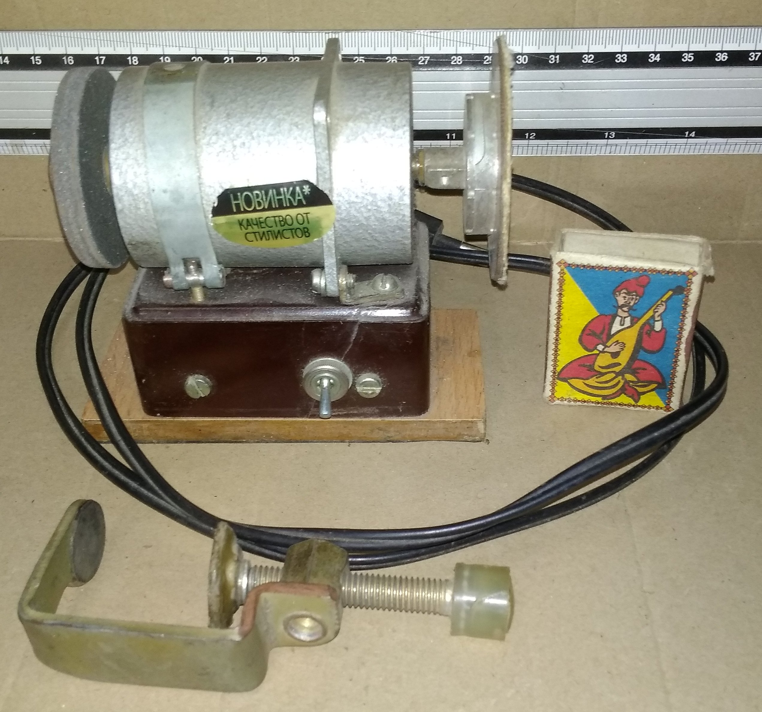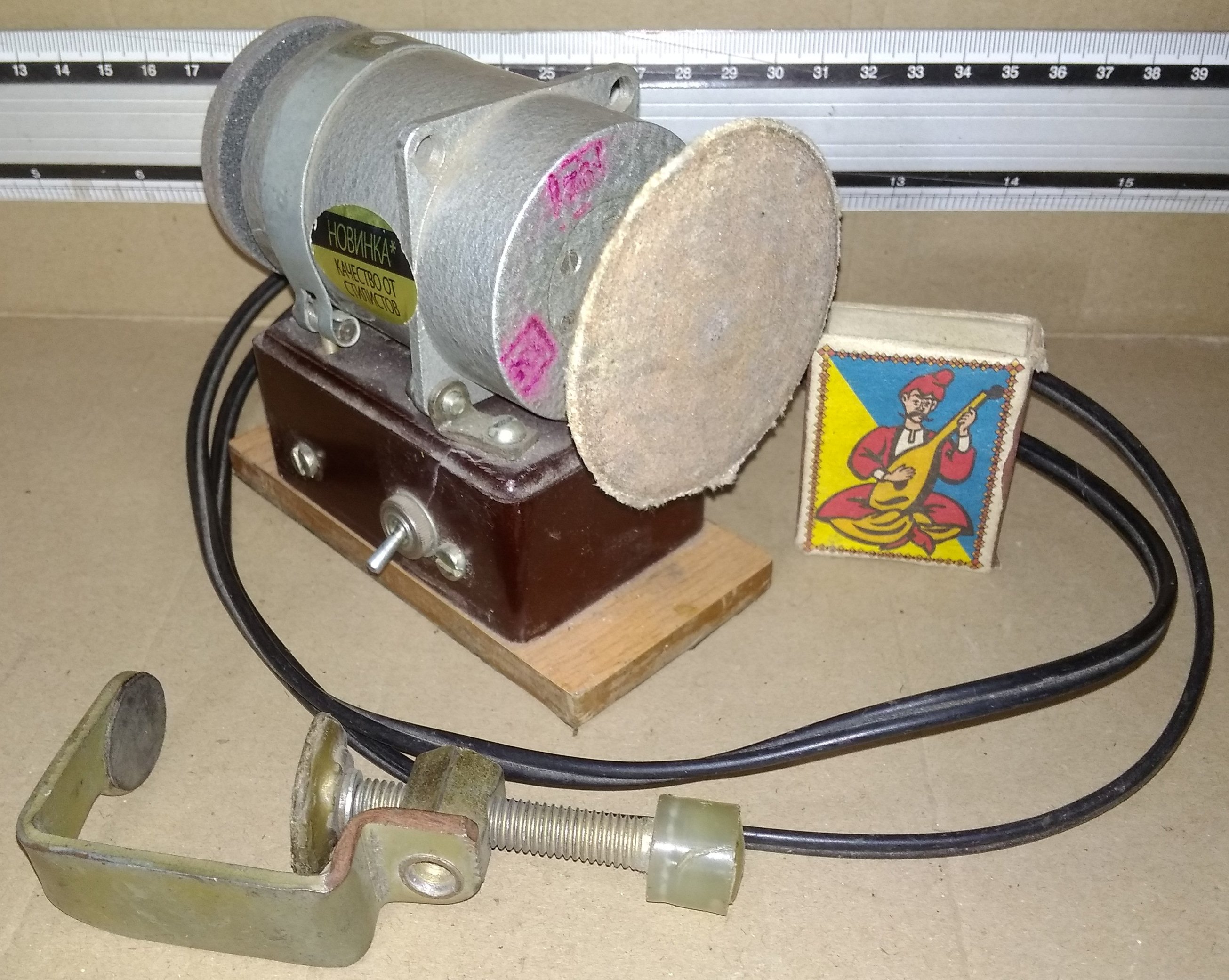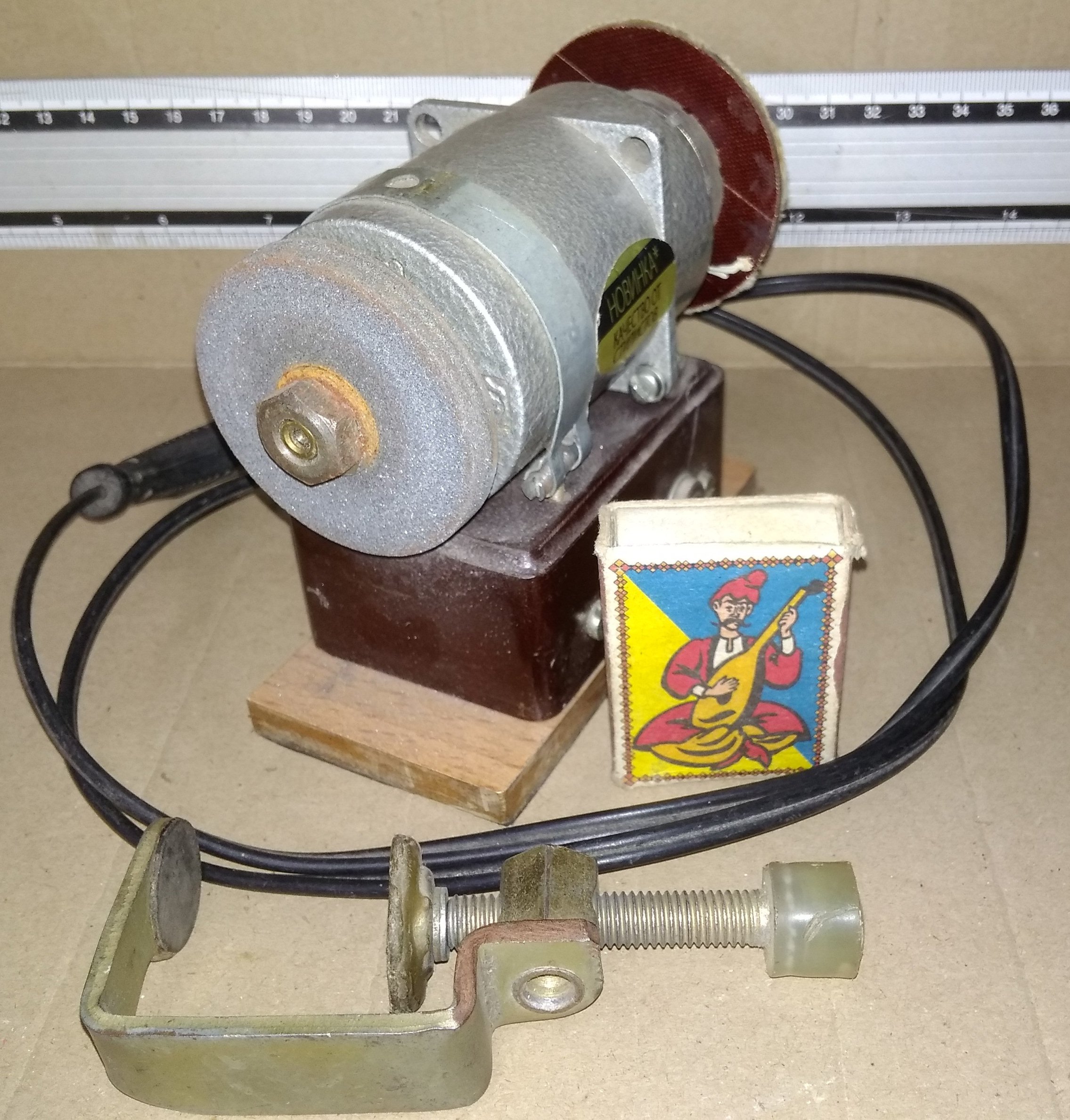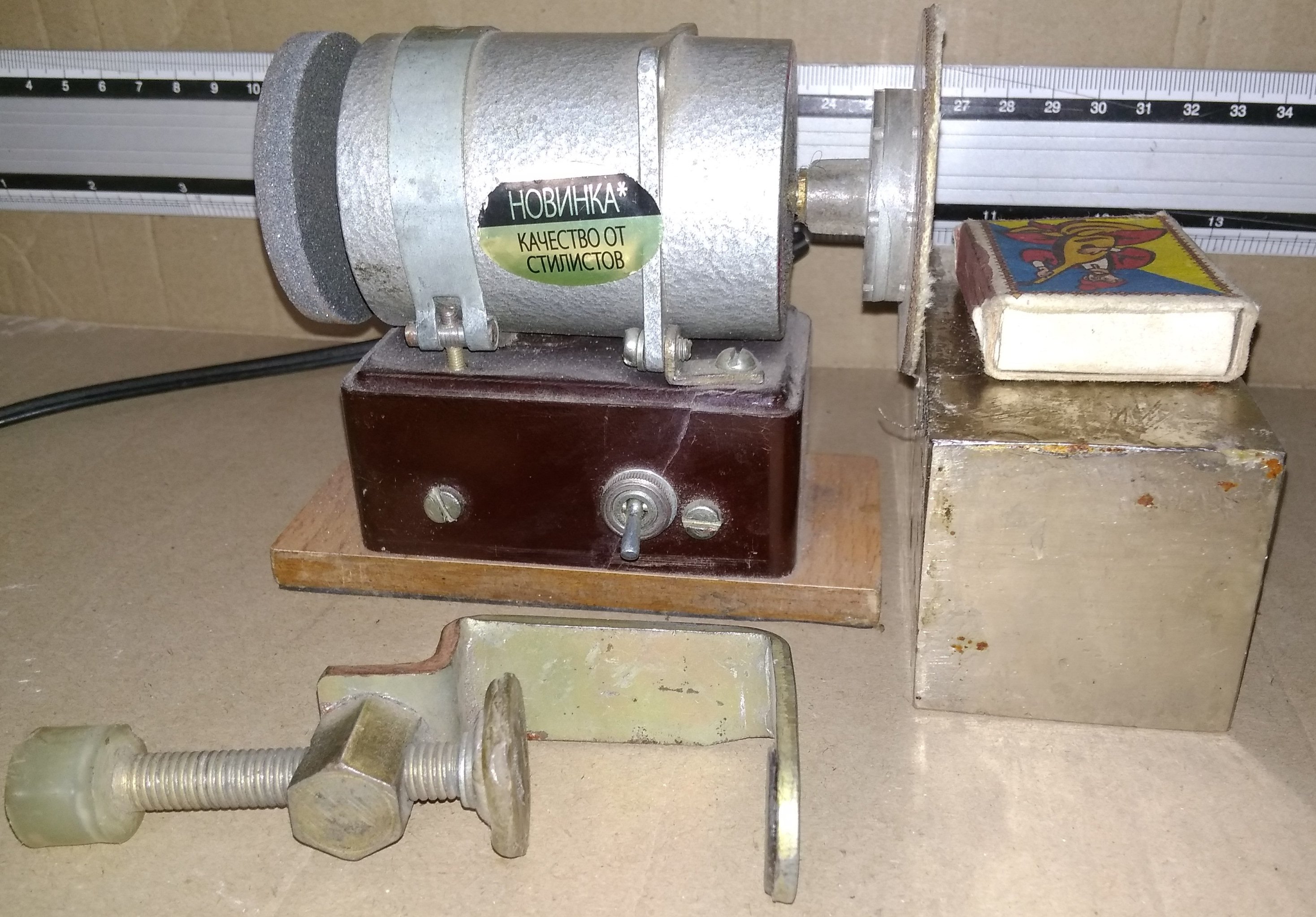 С одной сторны - камень с мелким зерном (собственно наличие этого камня и сподвигло на создание точила при попадании в мои руки миниатюрного моторчика), с другой - круг, обклееный мелкой наждачкой, для обработки плоскостей. Крепится к столу, опять же, струбцинами. И с добавлением металлического брусочка превращается в углошлифовальный станок, позволяющий заточить кромку под 90 град.