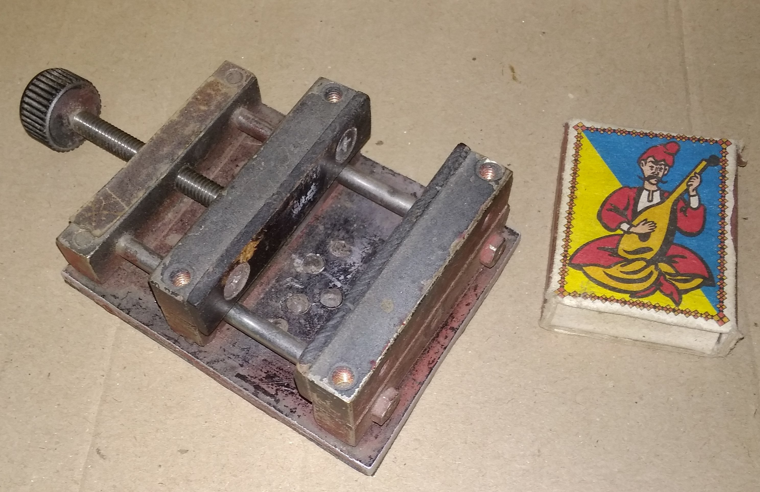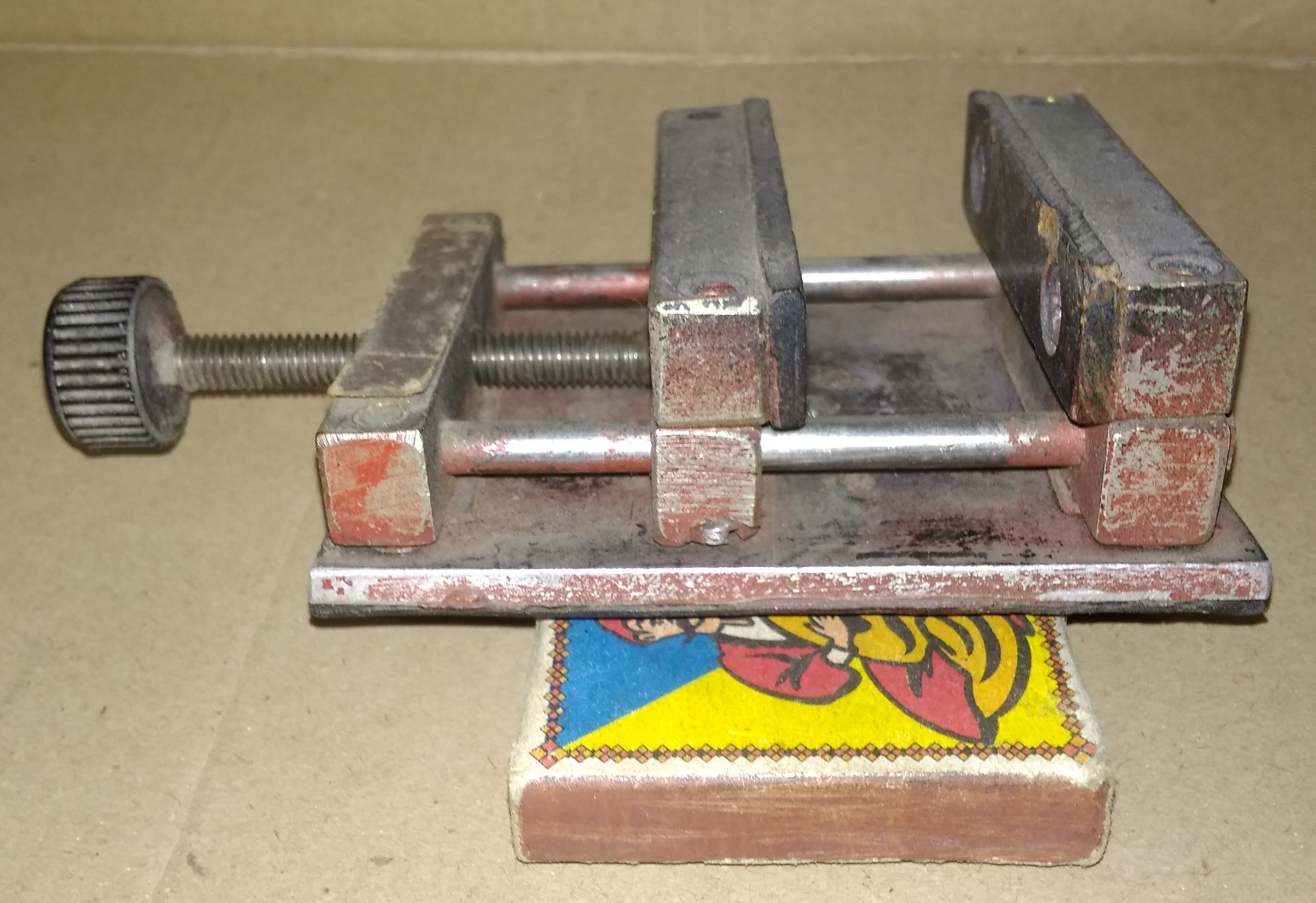 Помню, на плакатах ТБ возле сверлильного станка всегда было написано: "Прочно зажимай обрабатываемую деталь". Чем лучше всего зажимать? Правильно, тисками. А если станок маленький, то и тиски должны быть соответствующими. Вот и сделал мини-станочные тиски. Довольно удобно, снизу подклеена тонкая резина, чтобы не скользили. Губки текстолитовые, чтобы не повредить пластиковые детали.